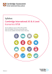 Syllabus Cambridge International AS & A Level Economics 9708 Use this syllabus for exams in 2023, 2024 and 2025. Exams are available in the June and November series. Exams are also available in the March series in India only. Version 2 Why choose Cambridge International? Cambridge International prepares school students for life, helping them develop an informed curiosity and a lasting passion for learning. We are part of the University of Cambridge. Our Cambridge Pathway gives students a clear path for educational success from age 5 to 19. Schools can shape the curriculum around how they want students to learn – with a wide range of subjects and flexible ways to offer them. It helps students discover new abilities and a wider world, and gives them the skills they need for life, so they can achieve at school, university and work. Our programmes and qualifications set the global standard for international education. They are created by subject experts, rooted in academic rigour and reflect the latest educational research. They provide a strong platform for students to progress from one stage to the next, and are well supported by teaching and learning resources. We review all our syllabuses regularly, so they reflect the latest research evidence and professional teaching practice – and take account of the different national contexts in which they are taught. We consult with teachers to help us design each syllabus around the needs of their learners. Consulting with leading universities has helped us make sure our syllabuses encourage students to master the key concepts in the subject and develop the skills necessary for success in higher education. Our mission is to provide educational benefit through provision of international programmes and qualifications for school education and to be the world leader in this field. Together with schools, we develop Cambridge learners who are confident, responsible, reflective, innovative and engaged – equipped for success in the modern world. Every year, nearly a million Cambridge students from 10 000 schools in 160 countries prepare for their future with the Cambridge Pathway. ‘We think the Cambridge curriculum is superb preparation for university.’ Christoph Guttentag, Dean of Undergraduate Admissions, Duke University, USA Quality management Cambridge International is committed to providing exceptional quality. In line with this commitment, our quality management system for the provision of international qualifications and education programmes for students aged 5 to 19 is independently certified as meeting the internationally recognised standard, ISO 9001:2015. Learn more at www.cambridgeinternational.org/ISO9001 Copyright © UCLES September 2020 Cambridge Assessment International Education is part of the Cambridge Assessment Group. Cambridge Assessment is the brand name of the University of Cambridge Local Examinations Syndicate (UCLES), which itself is a department of the University of Cambridge. UCLES retains the copyright on all its publications. Registered centres are permitted to copy material from this booklet for their own internal use. However, we cannot give permission to centres to photocopy any material that is acknowledged to a third party even for internal use within a centre. Contents 1 Why choose this syllabus? ................................................................................................................2 2 Syllabus overview .............................................................................................................................. 6 Aims 6 Content overview 7 Assessment overview 9 Assessment objectives 11 3 Subject content ..................................................................................................................................13 AS Level content 13 A Level content 22 4 Details of the assessment .............................................................................................................. 32 Paper 1 – AS Level Multiple Choice 32 Paper 2 – AS Level Data Response and Essays 32 Paper 3 – A Level Multiple Choice 33 Paper 4 – A Level Data Response and Essays 33 Command words 34 5 What else you need to know ......................................................................................................... 35 Before you start 35 Making entries 36 After the exam 37 How students, teachers and higher education can use the grades 38 Grade descriptions 38 Changes to this syllabus for 2023, 2024 and 2025 39 Important: Changes to this syllabus For information about changes to this syllabus for 2023, 2024 and 2025, go to page 39. Cambridge International AS & A Level Economics 9708 syllabus for 2023, 2024 and 2025. 1 Why choose this syllabus? Key benefits The best motivation for a student is a real passion for the subject they’re learning. By offering students a variety of Cambridge International AS & A Levels, you can give them the greatest chance of finding the path of education they most want to follow. With over 50 subjects to choose from, students can select the ones they love and that they’re best at, which helps motivate them throughout their studies. Following a Cambridge International AS & A Level programme helps students develop abilities which universities value highly, including: • a deep understanding of their subjects • higher order thinking skills – analysis, critical thinking, problem-solving • presenting ordered and coherent arguments • independent learning and research. Cambridge International AS & A Level Economics provides learners with the skills needed to use economics in work or further study, including how to explain and analyse economic issues and arguments, evaluate economic information, and organise, present and communicate ideas and judgements clearly. Our approach in Cambridge International AS & A Level Economics encourages learners to be: confident, in using the terminology, concepts, theories and principles 