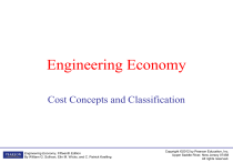 Engineering Economy Cost Concepts and Classification Engineering Economy, Fifteenth Edition By William G. Sullivan, Elin M. Wicks, and C. Patrick Koelling Copyright ©2012 by Pearson Education, Inc. Upper Saddle River, New Jersey 07458 All rights reserved. Costs can be categorized in several different ways. • Fixed cost: unaffected by changes in activity level • Variable cost: vary in total with the quantity of output (or similar measure of activity) • Incremental cost: additional cost resulting from increasing output of a system by one (or more) units Engineering Economy, Fifteenth Edition By William G. Sullivan, Elin M. Wicks, and C. Patrick Koelling Copyright ©2012 by Pearson Education, Inc. Upper Saddle River, New Jersey 07458 All rights reserved. • An incremental cost is the increase in total costs resulting from an increase in production or other activity. For instance, if a company's total costs increase from $320,000 to $360,000 as the result of increasing its machine hours from 8,000 to 10,000, the incremental cost of the 2,000 machine hours is $40,000. • The incremental cost is also referred to as the differential cost. The incremental cost is the relevant cost for making a short run decision between two alternatives. Engineering Economy, Fifteenth Edition By William G. Sullivan, Elin M. Wicks, and C. Patrick Koelling Copyright ©2012 by Pearson Education, Inc. Upper Saddle River, New Jersey 07458 All rights reserved. More ways to categorize costs • Direct: can be measured and allocated to a specific work activity • Indirect: difficult to attribute or allocate to a specific output or work activity (also overhead or burden) • Standard cost: cost per unit of output, established in advance of production or service delivery Engineering Economy, Fifteenth Edition By William G. Sullivan, Elin M. Wicks, and C. Patrick Koelling Copyright ©2012 by Pearson Education, Inc. Upper Saddle River, New Jersey 07458 All rights reserved. We need to use common cost terminology. • Cash cost: a cost that involves a payment of cash. • Book cost: a cost that does not involve a cash transaction but is reflected in the accounting system. • Sunk cost: a cost that has occurred in the past and has no relevance to estimates of future costs and revenues related to an alternative course of action. Engineering Economy, Fifteenth Edition By William G. Sullivan, Elin M. Wicks, and C. Patrick Koelling Copyright ©2012 by Pearson Education, Inc. Upper Saddle River, New Jersey 07458 All rights reserved. More common cost terminology • Opportunity cost: the monetary advantage foregone due to limited resources. The cost of the best rejected opportunity. • Life-cycle cost: the summation of all costs related to a product, structure, system, or service during its life span. Life cycle begins with the identification of the economic need or want ( the requirement ) and ends with the retirement and disposal activities Engineering Economy, Fifteenth Edition By William G. Sullivan, Elin M. Wicks, and C. Patrick Koelling Copyright ©2012 by Pearson Education, Inc. Upper Saddle River, New Jersey 07458 All rights reserved. • The acquisition phase begins with an analysis of the economic need or want – the analysis necessary to make explicit the requirement for the product, structure, system, or service. • The conceptual design activities translate the defined technical and operational requirements into a preferred preliminary design. – Development of the feasible alternatives and engineering economic analyses to assist in selection of the preferred preliminary design Engineering Economy, Fifteenth Edition By William G. Sullivan, Elin M. Wicks, and C. Patrick Koelling Copyright ©2012 by Pearson Education, Inc. Upper Saddle River, New Jersey 07458 All rights reserved. – Advanced development and prototype-testing activities to support the preliminary design work – Detailed design and planning for production or construction • In the operation phase, the production, delivery or construction of the end item(s) or service and their operation or customer use occur. – This phase ends with retirement from active operation or use and, often, disposal of the physical assets involved. Engineering Economy, Fifteenth Edition By William G. Sullivan, Elin M. Wicks, and C. Patrick Koelling Copyright ©2012 by Pearson Education, Inc. Upper Saddle River, New Jersey 07458 All rights reserved. – The priorities for engineering economy studies during the operation phase are: 1. achieving efficient and effective support to operations, 2. determining whether (and when) replacement of assets should occur, and 3. projecting the timing of retirement and disposal activities. Engineering Economy, Fifteenth Edition By William G. Sullivan, Elin M. Wicks, and C. Patrick Koelling Copyright ©2012 by Pearson Education, Inc. Upper Saddle River, New Jersey 07458 All rights reserved. Engineering Economy, Fifteenth Edition By William G. Sullivan, Elin M. Wicks, and C. Patrick Koelling Copyright ©2012 by Pearson Education, Inc. Upper Saddle River, New Jersey 07458 All rights reserved. Because of their common use, the following basic life-cycle cost categories should be considered. The investment cost is the capital required for most of the activities in the acquisition phase. This cost is also called a capital investment. The term working capital refers to the funds required for current assets (i.e., other than fixed assets such as equipment, facilities, etc.) that are needed for the start-up and support of operational activities. Engineering Economy, Fifteenth Edition By William G. Sullivan, Elin M. Wicks, and C. Patrick Koelling Copyright ©2012 by Pearson Education, Inc. Upper Saddle River, New Jersey 07458 All rights reserved. Operation and maintenance cost (O&M) includes many of the recurring annual expense items associated with the operation phase of the life cycle. The direct and indirect costs of operation associat
