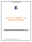 Processed by: BIT Computer Services Learn systematically and you are never at a loss 1 Processed by: BIT Computer Services Narammala Road, Madeena Bazaar, Siyambalagaskotuwa, TEVC No. P12/0224 Reg.No. 22/0297, Phone: 037-2247 806, 077-665-9080, email: bitcomsoft@gmail.com GCE OL ICT 10 MODEL QUESTIONS MODULE ............................................................... MODULE NO Information & Communication Technology .............................. 01 Fundamentals of a Computer System ....................................... 02 Data represent Methods in the computer system ........................ 03 Logic gates with Boolean functions ........................................... 04 Operating System ...................................................................... 05 Word Processing ......................................................................... 06 Electronic Spreadsheet ................................................................ 07 Electronic Presentations ............................................................. 08 Database ...................................................................................... 09 Learn systematically and you are never at a loss 2 Processed by: BIT Computer Services Information & Communication Technology 1) Compare data vs. information using 2 features. 2) Identify given labels which is a). To e). And write whether is it data or information. a) Salary of an employee ...................................................................... b) A weight graph of a child ...................................................................... c) ...................................................................... Remaining balance of total salary d) Daily total rainfall value ...................................................................... e) Weight of a child ...................................................................... 3) Match the correct columns in the given table for a quality information. 4) Computer is a system. Name A,B, and C 5) Different organizations use information systems at different times and occasions to make daily activities easier, more accurate and efficient. Write 3 examples. I. .................................................................................................................. II. .................................................................................................................. III. .................................................................................................................. Learn systematically and you are never at a loss 3 Processed by: BIT 5) Computer Services Nowadays QR code is commonly used to collect information. Write and order the step number (1, 2, 3….) in given blank. Take a photo .................................. Access the Website .................................. Point the mobile device to the QR code .................................. Decoding .................................. 6) Write correct code name in given blank. (QR Code / ISBN Code / Bar Code ) ...................................... .............................. ...................................... 6) A students doing online learning has to log in to the relevant educational website and enter the username and password given to his/her mobile phone immediately to the system in order to obtain the required tutorials and activities. The system checks its accuracy and displays the required definitions and activity notes on the screen, downloads them to their computer and prints them as appropriate. Identify input, process, store and output of a given case study and write given blank. Input - ................................... .................................... ..................................... Process - ................................... .................................... ..................................... Output - ................................... .................................... ..................................... Store - ................................... .................................... ..................................... 7) Explain E-Government ............................................................................................................................................. ............................................................................................................................................. Learn systematically and you are never at a loss 4 Processed by: BIT Computer Services ............................................................................................................................................. ............................................................................................................................................. 8) Name two websites that provide information and communication technology services at the state level in Sri Lanka. I 9) .................................................... II .................................................... Write down three advantages of using information and communication technology to provide government services. ................................................................................................................... ................................................................................................................... ................................................................................................................... 10) Below are some of the e-government services. Write down the blank which e-governments services are. (G2C / G2G / G2E / G2B). a) Renewal of vehicle license ........................................................................... b) Sri Lanka custom information ........................................................................... c) Information on business organization ........................................................................... d) Government laws ..............