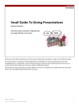 Welcome to this little introduction on how to give technical presentations. I hope you will find it useful. The presentation is meant for relative beginners even though even seasoned presenters may find something new in it. Naturally, we don't touch all topics and some only superficially. But once you are aware of some basic ideas you can start a spiral of self improvement. Note that none of the basic ideas in these slides are novel or invented by me. Rather they are extracted from a set of excellent books listed at the very end. Markus Püschel http://www.ece.cmu.edu/~pueschel 1 Here on the title page we already see two principles in action. Alignment is particularly important; it gives structure and order to a slide (or any graphical design). Interestingly, center aligment usually looks weak and unsophisticated. As a basic rule I suggest that you align left if in doubt (also applies to tables BTW). Try it! Beyond that try to align most elements on a slide to something else. Contrast means that if two elements are meant to look different, make them really different. For example, look at the title and my name. The fonts differ in both weight and size which makes it look visually appealing. Try the same with only size or only weight changed; it will look worse. As a general rule, contrast in fonts is achieved by changing at least two attributes among weight, size, color, and font type. Markus Püschel http://www.ece.cmu.edu/~pueschel 2 I like this proverb and it fits well. Applied to the topic of this presentation I want to motivate you to strive for quality. The photo is from istockphoto.com. The color for the text is extracted from the brighter parts of this photo using Photoshop's color picker (useful trick). The slide also goes along with one of my major rules: start your talk with an interesting slide and certainly avoid a text slide. Unfortunately, all slides in the remaining talk will look worse than this one. Markus Püschel http://www.ece.cmu.edu/~pueschel 3 Here is a couple of bullets expressing the motivation for this talk. The text seems reasonable enough but there are some visual shortcomings. Can you tell? Markus Püschel http://www.ece.cmu.edu/~pueschel 4 Here, the shortcomings are listed. Note how we violated to some extent the principles from the beginning: alignment and contrast. Let's fix these. Markus Püschel http://www.ece.cmu.edu/~pueschel 5 Much better, no? The alignment and the contrast between bullets and sub-bullets creates structure. As a text slide it looks good, but do we really want or need a text slide? (The answer is no as you may imagine.) Markus Püschel http://www.ece.cmu.edu/~pueschel 6 This is a more visual slide designed to convey the same content. The disadvantage is that now you have to remember what to say. However, if you don't, you are badly prepared anyway. The big advantage is that people will have more time listening since they are not busy reading (there is a biological reason for this, explained later). Equally important, the visuals make the slide much more interesting. So people are less likely to return to their laptops. This is an important goal, in particular on the first few slides. On the content: Presentations are a unique chance to connect your work with your person. If you do a good job, people may remember you, which is particularly important in any type of job (academia: at one point you need reference letters; industry: at one point a job up the ladder will open up and they will only consider the people they remember). Unfortunately, most presentations fall far short of this goal and are rather a waste of time for most of the audience. This is your chance: learn how to do it well and you have an edge! The bottom part conveys that content and visual quality are equally important. And they are. Note that slides that communicate well are also beautiful. This implies (ever had a logics class?) that ugly slides will not communicate well. Markus Püschel http://www.ece.cmu.edu/~pueschel 7 Note that I had added an acknowledgment, since the plot was suggested to me by a colleague in my department. Acknowledging is good style as much as not acknowledging is bad style. Imagine you create a fabulous data graphic, give it to somebody who uses it and she does not mention you. Markus Püschel http://www.ece.cmu.edu/~pueschel 8 Here you see the natural enemy of the presenter: the addictive communication device of our times. When you design your talk keep this in mind! If you are boring for 2 or 3 minutes, people will start checking email and all your work was in vain. Markus Püschel http://www.ece.cmu.edu/~pueschel 9 Here is the overview of this presentation. Markus Püschel http://www.ece.cmu.edu/~pueschel 10 Naturally, we start with the first point. Markus Püschel http://www.ece.cmu.edu/~pueschel 11 Like many other things, quality requires sufficient time for preparation. We are all busy, but preparation is a matter of priority. And, until your are famous, presenting should be a priority for you. Once you are famous you can hire graphics designer to do them for you. It is hard to give a good rule for the number of slides. For technical presentations, I found that 2/3 times minutes is a good rule of thumb. And this includes all slides. Yes, all. Don’t convince you that some are just overview slides and some sort of empty. Does not matter. 2/3, not more. Leave room for you to talk about your slides. In particular about your results (often towards the end). Boot up your laptop in the morning of your presentation, You do want that the latest OS update installs itself one minute before your talk. Markus Püschel http://www.ece.cmu.edu/~pueschel 12 Know your laptop! How often have you seen people trying to figure out how to get the image onto the screen. You loose valuable minutes! Absolutely get a remote mouse. This allows you to roam around freely, stand where you want, and naturally blend the advancing of your slides and animations with yo