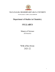 VIJAYANAGARA SRI KRISHNADEVARAYA UNIVERSITY JNANASAGARA CAMPUS, BALLARI-583105 Department of Studies in Chemistry SYLLABUS Master of Science (III Semester) With effect from: 2021-22 1 VIJAYANAGARA SRI KRISHNADEVARAYA UNIVERSITY Department of Chemistry Jnana Sagara, Ballari - 583105 Distribution of Courses/Papers in Postgraduate Programme I to IV Semester as per Choice Based Credit System (CBCS) Proposed for PG Programs III – SEMESTER With Practical Semester Category DSC9 DSC10 DSE1 DSE2 THIRD GEC1 SEC3 DSC9P7 DSC10P8 Subject code Marks Title of the Paper 21CHE3C9L 21CHE3C10L 21CHE3E1AL 21CHE3E1BL 21CHE3E1CL 21CHE3E2AL Spectroscopy Chemistry of Heterocyclic Compounds A. Polymer Science & Technology B. Nanomaterials and Applications C. Applied Physical Chemistry A. Nuclear Chemistry and Materials Science 21CHE3E2BL B. Green Chemistry 21CHE3E2CL C. Industrial Inorganic Chemistry 21CHE3G1AL A. Analytical techniques 21CHE3G1BL B. Separation and purification techniques 21CHE3G1CL C. Environmental Chemistry and Waste management 21CHE3S3P Semi micro Qualitative Inorganic analysis 21CHE3C9P Instrumentation/ Physical Chemistry Practicals 21CHE3C10P Quantitative analysis of Organic functional groups Total Marks for III Semester IA SEE 30 70 30 70 Total 100 100 Teaching hours/week L T P 4 4 - 4 4 Duration of exams (Hrs) 3 3 Credit 30 70 100 4 - - 4 3 30 70 100 4 - - 4 3 20 30 50 2 - - 2 1 20 20 30 30 50 50 1 - - 2 4 2 2 1 4 20 30 50 - - 4 2 4 600 24 Dept Name: Chemistry Semester-III DSC9: Spectroscopy Course Title: Spectroscopy Course code: 21CHE3C9L Total Contact Hours: 56 Course Credits: 04 Formative Assessment Marks: 30 Duration of ESA/Exam: 3 Hours Summative Assessment Marks: 70 Course Outcomes (CO’s): 1. To understand the basic spectral aspects and characteristics 2. To study theoretical concepts of microwave and vibrational spectroscopy and their applications. 3. To familiarize with advanced spectroscopic techniques for the characterization and prediction of chemical structure 4. To apply spectroscopic techniques for qualitative analysis At the end of the course, students will be able to: 1. Apply the advanced knowledge of spectroscopy in the characterization and prediction of structure. 2. Able to apply the techniques in academic, industrial and research Unit 1 2 Description Hours Introduction: Intensity of spectral lines, Natural line width and broadening, Rotational, vibrational and electronic energy levels, selection rules. Microwave Spectroscopy The rotation of molecules – rotation spectra of diatomic molecules – the rigid diatomic molecule – rotational energy levels – selection rules – effect of isotopic substitution – the rigid and non rigid rotator. Applications - Principles of determination of Bond length and moment of inertia from rotational spectra. Stark effect in rotation spectra and determination of dipole moments. spectrum of a non rigid rotator – polyatomic linear molecules – Moment of inertia expression for 10 linear tri-atomic molecules, symmetric Top molecules, techniques and instrumentation.. Vibrational Spectroscopy Vibrating diatomic molecule – simple harmonic oscillator – vibrational energy levels – anharmonic oscillator selection rules – fundamental vibrations, overtones and hot bands – diatomic vibrator rotator, Vibration of polyatomic molecules – The number of degrees of freedom of vibration. Vibration and rotation spectra of carbon monoxide.interaction of rotation and vibration – Breakdown of Born – Oppenheiner approximation. Problems Infra Red Spectroscopy Introduction – Molecular vibrations – Mode of Vibrations, calculation of vibrational frequencies, instrumentation-– FT – IR Spectrometer. Sampling techniques, interpretation of IR spectra factors affecting group frequencies and band 10 shapes – Physical state of samples vibrational coupling, electrical and inductive effects, Hydrogen bonding and ring structures, co-relation chart, important regions in the IR spectrum – H stretching, triple bond, double band stretching, finger print 3 region, applications of IR spectroscopy in the structural elucidation of organic. Compounds, application of far IR spectroscopy – Limitations of IR spectroscopy. (Problems & Exercise). IR spectra of coordination modes of ligands like nitrate, thiocynate, sulphate, carbonate(bridging, bidentate etc.,), and water. 3 HNMR Spectroscopy Introduction – Nuclear spin and magnetic moment, origin of NMR spectra, Theory of NMR spectroscopy, resonance flipping, instrumentation and sampling, inter preparation of NMR spectrum, equivalent and non-equivalent protons, chemical shifts(down field and up field), factors influencing chemical shifts, anisotropic effects, NMR scale, units, internal references, simple and complex splitting / coupling, coupling constant, correlation chart of chemical shifts, spin-spin relaxations, equivalence of protons–chemical and magnetic equivalence, spin– systems. solvent effects and Nulear Overhauser Effect. Karplus relationships (Karplus curve–variation of coupling constant with dihedral angle), double resonance techniques, first order and second order patterns, lanthanide shift reagents, exchange phenomena. . High resolution 1H NMR. FT NMR and its advantages. Applications of NMR spectroscopy in structure elucidation of simple organic and inorganic molecules. Pulse techniques in NMR, two dimensional and solid state NMR. Use of NMR in Medical diagnostics. Deuterium exchange techniques limitations of H NMR spectroscopy . 12 4 Introduction and applications of 13C NMR spectroscopy, Broad band and off resonance coupling methods of detection. 13C Chemical shifts of different classes of organic compounds–alkanes, alkyl halides, alkenes, alcohols, ethers, carbonyl compounds and aromatic compounds. 2 DNMR spectroscopy, use of PMR spectrum in structural elucidation of organic compound. 31P and 19F NMR. COSY, NOESY (Nulear Overhauser Effect) and EXSY ( Exchange Spectrosc