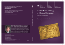 Topic Literature & Language “Pure intellectual stimulation that can be popped into the [audio or video player] anytime.” —Harvard Magazine “A serious force in American education.” —The Wall Street Journal Professor Hans-Friedrich Mueller serves as the Thomas B. Lamont Professor of Ancient and Modern Literature and Chair of the Department of Classics at Union College in Schenectady, New York. He earned his Ph.D. in Latin from The University of North Carolina at Chapel Hill and has received the American Philological Association’s Award for Excellence in the Teaching of Classics at the College Level. In addition to numerous articles, Professor Mueller is the author of Roman Religion in Valerius Maximus and the editor of an abridged edition of Gibbon’s Decline and Fall of the Roman Empire. Professor Photo: © Jeff Mauritzen - inPhotograph.com. Cover Image: © Gianni Dagli Orti/The Art Archive at Art Resource, NY. Course No. 2201 © 2013 The Teaching Company. PB2201A Guidebook THE GREAT COURSES ® Corporate Headquarters 4840 Westfields Boulevard, Suite 500 Chantilly, VA 20151-2299 USA Phone: 1-800-832-2412 www.thegreatcourses.com Latin 101: Learning a Classical Language “Passionate, erudite, living legend lecturers. Academia’s best lecturers are being captured on tape.” —The Los Angeles Times Latin 101: Learning a Classical Language Course Guidebook Professor Hans-Friedrich Mueller Union College Subtopic Language Learning PUBLISHED BY: THE GREAT COURSES Corporate Headquarters 4840 Westfields Boulevard, Suite 500 Chantilly, Virginia 20151-2299 Phone: 1-800-832-2412 Fax: 703-378-3819 www.thegreatcourses.com Copyright © The Teaching Company, 2013 Printed in the United States of America This book is in copyright. All rights reserved. Without limiting the rights under copyright reserved above, no part of this publication may be reproduced, stored in or introduced into a retrieval system, or transmitted, in any form, or by any means (electronic, mechanical, photocopying, recording, or otherwise), without the prior written permission of The Teaching Company. Hans-Friedrich Mueller, Ph.D. Thomas B. Lamont Professor of Ancient and Modern Literature and Chair of the Department of Classics Union College P rofessor Hans-Friedrich Mueller serves as the Thomas B. Lamont Professor of Ancient and Modern Literature and Chair of the Department of Classics at Union College in Schenectady, New York. Professor Mueller received his B.A. in Latin from the University of Wisconsin–Milwaukee in 1985 and, for the next six years, taught Latin and German at Countryside High School in Clearwater, Florida. He earned his M.A. from the University of Florida in 1989 and returned to graduate school in 1991, receiving his Ph.D. in 1994 from The University of North Carolina at Chapel Hill. Subsequently, Professor Mueller spent a year at the Bavarian Academy of Sciences in Munich, Germany, where he worked on entries for an encyclopedic Latin dictionary, the Thesaurus Linguae Latinae. Under Professor Mueller’s direction, the Union College program in Classics has been noted especially for its interdisciplinary curriculum. Professor Mueller received the American Philological Association’s Award for Excellence in the Teaching of Classics at the College Level in 2000, as well as two awards for excellence in teaching at Florida State University. At the University of Florida, he developed a graduate distance-learning program in Classics for high school teachers. In addition to numerous articles, Professor Mueller is the author of Roman Religion in Valerius Maximus, the editor of an abridged edition of Gibbon’s Decline and Fall of the Roman Empire, and the translator of Andreas Mehl’s Roman Historiography: An Introduction to Its Basic Aspects and Development. He is also the author of Caesar: Selections from his Commentarii De Bello Gallico and coauthor of Caesar: A LEGAMUS Transitional Reader. i In German, the surname Mueller means “miller.” Both the German surname Mueller and the English surname Miller, however, derive from Molinarius, a Latin word for “miller” and the professor’s preferred pseudonym. ■ ii Table of Contents INTRODUCTION Professor Biography.............................................................................i Course Scope......................................................................................1 LECTURE GUIDES Lecture 1 Pronouncing Classical Latin���������������������������������������������������������������3 Lecture 2 Introduction to Third-Conjugation Verbs�������������������������������������������10 Lecture 3 Introduction to the Subjunctive Mood�����������������������������������������������19 Lecture 4 The Irregular Verbs Sum and Possum���������������������������������������������29 Lecture 5 Introduction to Third-Declension Nouns�������������������������������������������39 Lecture 6 Third-Declension Neuter Nouns�������������������������������������������������������51 Lecture 7 First- and Second-Declension Adjectives�����������������������������������������62 Lecture 8 First- and Second-Declension Nouns�����������������������������������������������72 Lecture 9 Introduction to the Passive Voice