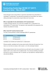 These instructions are for exams officers or supervisors responsible for the administration of Cambridge ICT practical tests. They describe the procedures you should follow if your centre is offering Cambridge ICT practical tests during the March 2021 exam series. Who is responsible for the administration of ICT practical tests? A suitably competent supervisor, who may be the candidates’ tutor, is responsible for the administration of ICT practical tests. The supervisor is also responsible for the preparation of the hardware and software for the tests. When should ICT practical tests be held? You have a one-day window to conduct Cambridge IGCSE ICT practical tests. Paper Test dates 0417/21 03 February 2021 0417/31 05 February 2021 Candidates must complete each practical test in a single session. Wherever possible, candidates from the same centre should sit their test at the same time. If you need to run more than one session, refer to section 1.2.4 of the Cambridge Handbook. When arranging the tests, take into account the time you will need to set up the systems. It is also helpful to plan in some ‘reserve’ time for additional tests. This is because something may happen that means you have to reschedule a test. For example, you may experience a hardware failure or other technical difficulty. Conducting Cambridge IGCSE ICT (0417) practical tests – March 2021 Exams officers Conducting Cambridge IGCSE ICT (0417) practical tests – March 2021 What do I need to do to prepare for Cambridge ICT practical tests? The following materials are required to conduct the practical tests: Material Method of delivery Question Paper Sent hard copy to centres Assessment Record Folder (ARF) Sent hard copy to centres Source files Available for centres to download from DFD Supervisor's Report Folder (SRF) Available for centres to download from DFD with source files If you do not have any of the materials listed above contact our Customer Services team at info@cambridgeinternational.org There are a number of things you need to do before the tests start. Testing the hardware and software The hardware and software the candidates will be using during the test must be in full working order, to allow them to meet all the performance criteria set out in the syllabus. The computers used in the test must be provided by the centre. We cannot take errors resulting from faulty software or hardware into account when marking candidates’ work. Therefore, it is important for the supervisor to work through a past or specimen paper, using the hardware and software that the candidates will be using, before any of the tests. Please include any system errors, irregularities or issues in the Supervisor's Report Folder (SRF). You no longer have to send us a worked copy of a past paper (Supervisor Worked Copy). Occasionally candidates have to embed provided sound or video files into their work, but they are not required to listen to or edit the files, therefore headphones are not required or permitted. You must make sure the date and time settings are correct on each computer before candidates start the exam. The settings should be locked to prevent candidates from changing them. If your computers are not maintaining the correct date and time due to faulty CMOS batteries, these should be replaced before the exam. If any computers are receiving an incorrect date and time from a time signal device such as a router on the network, the time signal device must be updated so it is correct. Question papers We do not send Cambridge ICT practical test question papers as electronic files. They are despatched as hardcopy question papers to the exams officer at each centre. Do not open the question paper packets before the start of the test. Conducting Cambridge IGCSE ICT (0417) practical tests – March 2021 Source files Centres must download the required source files from the digital file despatch (DFD) area of the Cambridge website. Once downloaded you must store all source files securely. These are available three calendar days before the test date window for Cambridge International schools. Cambridge Associates can download the source files five calendar days before the test date window to allow enough time to securely distribute the source files to their Associate Centres. The source material contains files in the following formats: .rtf, .csv, .txt, .htm, .css, .jpg, .png and .mp4. The data files (in particular .csv files) should be in a format that each candidate can access. If you experience any difficulties receiving the files, or opening .csv files because of regional settings, list separators or decimal markers, please email our Customer Services team at info@cambridgeinternational.org Spare equipment in case of hardware failure during a test Centres must have sufficient spare computers and printers available in case there is a hardware failure during a test. Secure setup Use secure areas on all machines, or change the default settings so the candidates do not have access to other candidates' work. The use of a shared folder is not allowed. Each candidate must be issued with an individual password protected work folder for each test. The password for this folder must be unique for each candidate. Printing candidates’ work You must submit printouts of each candidate’s work. Candidates must add their name, candidate number and centre number to each document before printing. We will not mark any printouts that are missing candidate details, or that have candidate details written on them by hand. Candidates must neatly cross through any extra rough copies of printouts so it is clear they should not be marked. Candidates must send all work to the printer before the end of the practical test. Candidates do not have to print their work in colour and we will not give them extra credit if they do. The candidate is responsible for making sure there is enough differentiation in their work if it is printed out in monochrome, for e