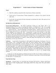 37 Experiment V: Conservation of Linear Momentum Goals • Study the conditions required for the conservation of linear momentum • Verify the law of conservation of linear momentum in a collision of two objects with the same mass • Use the law of conservation of linear momentum to determine the ratio of the masses of two objects in a collision Introduction and Background Conservation of Momentum: The linear momentum (which we will simply refer to as momentum below), P, of a mass m moving with velocity v is defined as P = mv. For a system consisting of multiple masses, the total momentum of the system is the vector sum P = P1 + P2 + P3 + …, where P1, P2, P3 … are the momentum of individual masses. Newton’s second law tells us that if, during a time interval Δt, a net force F acts on the system, the total momentum of the system will be changed by an amount ΔP = FΔt. Consequently, so long as the net force on the entire system is zero, the total momentum of the system remains constant (conserved). Because F and P are vectors, if the sum of the forces along a particular direction is zero, the component of the total momentum along that direction will be conserved. In other words, it is possible to have a situation in which the total momentum of a system is conserved along some directions but not conserved along others, as in the case of this lab. Collisions: Conservation of momentum is often applied to the analysis of collisions of two (or more) masses. This is particularly useful since the actual collision forces and the resulting accelerations may be impossible to measure directly; but since the collision forces are internal, the momentum is conserved as long as the net external force is zero. To apply momentum conservation in a given direction, x, to a system of two masses undergoing a collision, it is necessary that there be a time interval that includes the collision process but there is no net external force on the system in that direction. Within this time interval, the x-component of the total momentum of the system would remain constant although the individual components P1x and P2x are changed during collision. In this lab, we will study glancing collisions between two balls, one of which is initially at rest. We will obtain data that will allow us to check for momentum conservation in the horizontal plane in which there is no external force. Experimental Setup Equipment: Inclined chute, two steel balls and one plastic ball stored in a hollow metal block, large sheets of white wrapping paper, carbon paper, plumb bob, string, meter stick, pan balance, table clamp. 38 Setup: The experimental setup is shown schematically in Figure 5-1. In an experiment, a target ball is placed on top of a post in front of the inclined chute, while a projectile ball is released from the top of the chute and gain a certain velocity just before the collision. After the collision, the two balls undergo projectile motion with zero initially velocity in the vertical direction and they are expected to hit the floor at the same time. Their landing positions are recorded by placing carbon papers on top of the white wrapping paper. The displacements of the landing points from the origin are directly proportional to the momentum of the two balls after collision. To understand the design of this Figure 5.1 – Conservation of linear momentum apparatus. experiment, it is absolutely necessary that you understand the answers to the following questions and you need to answer them in your report: 1. After the projectile ball has rolled down the chute and is just about to strike the target ball, what is the direction of the total momentum of the system of two balls? 2. What is the expression for the total momentum of the two balls just before collision in terms of their masses and velocities? 3. What is the expression for the total momentum of the two balls just after collision in terms of their masses and velocities? 4. If the screw holding the target ball exerts a very small horizontal force on the balls during the collision, should the total momentum of the two balls be conserved in a horizontal plane from before to after the collision? Why is this small force negligible? 5. What happens to the total vertical component of the momentum of the two balls from just before the collision to the time the balls hit the floor? Is the vertical component of the momentum conserved? 6. How can one compare the momentum before and after collision in the horizontal plane without directly measuring the horizontal velocities of the balls? 39 The answer to question 6 is a key to this experiment and is based on the following facts about projectile motion: Objects projected horizontally (without any component in initial velocity) from the same height all take the same amount of time to hit the floor. If air resistance is negligible, the horizontal component of their velocity remains unchanged during the fall and therefore, the distance they travel horizontally is directly proportional to their horizontal velocity. Thus by measuring the horizontal distances the balls travel from the collision point to their landing points, and by knowing their masses (or ratio of masses) it is possible to compare the horizontal momenta without obtaining specific numbers for the velocities. Experimental Procedure A. Collision of Two Steel Balls 1. Tear off a sheet of white wrapping paper about 75 cm long. Tape the paper to the floor so that the plumb bob hangs centered over one edge of the paper and several cm from the end. The position of the support screw can be adjusted by rotating or pulling when the appropriate screws are loosened. Mark the position of the bob when the support screw is straight out from the chute and about 1-1/2 ball diameters from the end of the chute. This is the origin. Now rotate the support screw to one side. 2. Roll a steel ball down the inclined chute in the narrowest track from the release point and note approximat