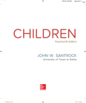CHILDREN Fourteenth Edition JOHN W. SANTROCK University of Texas at Dallas san73939_fm_i-xl.indd 1 10/12/17 12:36 PM CHILDREN, FOURTEENTH EDITION Published by McGraw-Hill Education, 2 Penn Plaza, New York, NY 10121. Copyright © 2019 by McGrawHill Education. All rights reserved. Printed in the United States of America. Previous editions © 2016, 2013, and 2010. No part of this publication may be reproduced or distributed in any form or by any means, or stored in a database or retrieval system, without the prior written consent of McGraw-Hill Education, including, but not limited to, in any network or other electronic storage or transmission, or broadcast for ­distance learning. Some ancillaries, including electronic and print components, may not be available to customers outside the United States. This book is printed on acid-free paper. 1 2 3 4 5 6 7 8 9 LWI 21 20 19 18 Bound: ISBN 978-1-260-07393-5 MHID 1-260-07393-9 Looseleaf: ISBN 978-1-260-15408-5 MHID 1-260-15408-4 Portfolio Manager: Ryan Treat Lead Product Developer: Dawn Groundwater Product Developer: Vicki Malinee, Van Brien & Associates Digital Product Developer: Sarah Colwell Senior Marketing Manager: Ann Helgerson Content Project Managers: Mary E. Powers, Jodi Banowetz Buyer: Sandy Ludovissy Design: Matt Backhaus Content Licensing Specialists: Carrie Burger Cover Image: © RichVintage/Getty Images Compositor: Aptara®, Inc. All credits appearing on page are considered to be an extension of the copyright page. Library of Congress Cataloging-in-Publication Data Names: Santrock, John W., author. Title: Children / John W. Santrock, University of Texas at Dallas. Description: Fourteenth edition. | New York, NY : McGraw-Hill Education, [2019] Identifiers: LCCN 2017039864| ISBN 9781260073935 (alk. paper) | ISBN 1260073939 (alk. paper) Subjects: LCSH: Child development. | Adolescence. Classification: LCC HQ767.9 .S268 2019 | DDC 305.231—dc23 LC record available at https://lccn.loc. gov/2017039864 The Internet addresses listed in the text were accurate at the time of publication. The inclusion of a website does not indicate an endorsement by the authors or McGraw-Hill Education, and McGraw-Hill Education does not guarantee the accuracy of the information presented at these sites. mheducation.com/highered san73939_fm_i-xl.indd 2 10/12/17 12:36 PM brief contents SECTION 1 THE NATURE OF CHILDREN’S DEVELOPMENT 2 1 SECTION 2 BEGINNINGS 44 2 3 4 SECTION 3 Physical Development in Early Childhood 220 Cognitive Development in Early Childhood 244 Socioemotional Development in Early Childhood 276 MIDDLE AND LATE CHILDHOOD 313 11 12 13 SECTION 6 Physical Development in Infancy 120 Cognitive Development in Infancy 156 Socioemotional Development in Infancy 187 EARLY CHILDHOOD 219 8 9 10 SECTION 5 Biological Beginnings 45 Prenatal Development 72 Birth 99 INFANCY 119 5 6 7 SECTION 4 Introduction 3 Appendix: Careers in Children’s Development 40 Physical Development in Middle and Late Childhood 314 Cognitive Development in Middle and Late Childhood 341 Socioemotional Development in Middle and Late Childhood 379 ADOLESCENCE 415 14 15 16 Physical Development in Adolescence 416 Cognitive Development in Adolescence 447 Socioemotional Development in Adolescence 473 Glossary G-1 References R-1 Name Index N-1 Subject Index S-1 iii san73939_fm_i-xl.indd 3 10/12/17 12:36 PM contents About the author Expert Consultants xi xii Connecting Research and Results Preface xiv xvii Acknowledgments xxxix SECTION 1 THE NATURE OF CHILDREN’S DEVELOPMENT C HAPT ER 1 Introduction CARING CONNECTIONS Strategies for Parenting, Educating, and Interacting with Children Based on Erikson’s Theory 19 Research Methods for Collecting Data 26 Research Designs 30 Research Challenges 33 3 Why Is Caring for Children Important? 5 The Importance of Studying Children’s Development 5 Improving the Lives of Children 5 ©Ariel Skelley/Blend Images/Getty Images RF CONNECTING WITH CAREERS Luis Vargas, Clinical Child Psychologist 6 What Characterizes Development? 11 Biological, Cognitive, and Socioemotional Processes 11 Periods of Development 12 Age and Cohort Effects 12 Issues in Development 13 SECTION 2 BEGINNINGS Reach Your Learning Goals 37 Key Terms 39 Key People 39 Connecting With Improving the Lives of Children 39 A P P ENDIX 16 Careers in Children’s Development 40 44 C HAPT ER 2 Biological Beginnings What Are Some Reproductive Challenges and Choices? 58 Prenatal Diagnostic Tests 58 Infertility and Reproductive Technology 60 45 What Is the Evolutionary Perspective? 47 Natural Selection and Adaptive Behavior 47 Evolutionary Psychology 48 ©MedicalRF.com/Getty Images RF CONNECTING WITH RESEARCH Why Are Research Journals Important in the Field of Child Development? 34 CONNECTING WITH CAREERS Pam Reid, Educational and Developmental Psychologist 35 CONNECTING WITH DIVERSITY Gender, Families, and Children’s Development 9 How Is Child Development a Science? The Importance of Research 16 Theories of Child Development 17 2 What Are the Genetic Foundations of Development? 50 The Collaborative Gene 50 Genes and Chromosomes 52 Genetic Principles 53 Chromosomal and Gene-Linked Abnormalities CONNECTING WITH CAREERS Genetic Counselor 58 CONNECTING WITH RESEARCH Are There Developmental Outcomes in Adolescence of In Vitro Fertilization? 61 Adoption 61 CONNECTING WITH DIVERSITY The Increased Diversity of Adopted Children and Adoptive Parents 62 55 Holly Ishmael, CARING CONNECTIONS Children 63 Parenting Adopted iv san73939_fm_i-xl.indd 4 31/10/17 8:08 AM How Do Heredity and Environment Interact? The Nature-Nurture Debate 63 Behavior Genetics 64 Heredity-Environment Correlations 65 The Epigenetic View and Gene × Environment (G × E) Interaction 66 Conclusions About Heredity-Environment Interaction 67 Maternal Diseases 92 Other Parental Factors 93 Reach Your Learning Goals 96 Key Terms 98 Key People 98 Connecting With Improving the Lives of Children 98 CH A P T ER 4 Reach Your Learning Goals 69