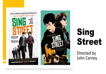 Sing Street Directed by John Carney This Photo by Unknown Author is licensed under CC BY-SA This Photo by Unknown Author is licensed under CC BY-SA What do you think the movie is going to be about? What are your expectations? Before we watch it take down some notes: • Who directed the film? John Carney • Who produced the film? Irish Film Board • What year is the film set in? 1985 • What was life like in this era? High unemployment rates due to a recession, a lot of young Irish people were emigrating, ongoing troubles in the North. • What were some of the main struggles for people? Financial struggles, social problems. • What town is the film set in? Dublin city. Studied Film Checklist Characters Setting Plot Theme Images Cinematography Personal response Watch up to 20:30 • What’s the name of the main character? Conor Lawlor • What instrument is he playing in the opening scene? Guitar • What problems are Conor’s parents experiencing? They are struggling financially • What is Conor forced to do? To move schools • What is your initial impression of Conor’s new school? Full of loud, intimidating, boisterous young boys. • How do the other students treat him? They exclude him and they judge him. • What are some of the social problems mentioned in the film? Unemployment, drug addiction • What’s the name of the student who befriends Conor? Darren • Who’s house does he bring him to? Eamon’s house • What’s a futurist? Someone who looks to the future • Who do the boys ask to join the band? Ngig • What is the name of the band? Sing Street Section1 – What have we learned so far? This Photo by Unknown Author is licensed under CC BY-SA-NC Characters • Conor • Raphina • Conor’s mum and dad • Conor’s brother • Eamonn • Barry • Brother Baxter Setting The film is set in Dublin in the 1980s. Socially, it is a difficult time with lots of unemployment due to a harsh recession. This goes hand in hand with a lot of new pop music being released in the charts. The plot of the film switches between the difficult reality of the recession in Dublin and the happy escape that music provides. This Photo by Unknown Author is licensed under CC BY-SA • The opening of the film introduces us to the main character of Conor Lawlor. • He is a fifteen year old boy who lives with his brother and parents. (Plot) Opening • Very quickly audiences realise that Conor’s home is not a happy place to be. • Because of the recession, Conor’s dad has been fired from his job while his mother has had her job reduced. Conor’s older brother has also dropped out of college. • To go along with this, Conor’s parents are also unhappy in their marriage. • The family have very little money and Conor is forced to go to a new school, Synge Street CBS in the inner city of Dublin. • This school is very different from what Conor has been used to and immediately he feels like an outsider, with all of the other boys in the school looking at Conor. Task Based on the opening scenes of a film you have studied. Describe your initial impressions of: the main character(s) and setting. Use evidence from the film to support your points. (2 paragraphs) This Photo by Unknown Author is licensed under CC BY Section 2 20mins 30 secs – 49mins 40secs • How does Conor’s brother react to the band’s recording? He wants the band to be original and creative, he’s not impressed that they’re singing covers of songs. • What is Conor’s song called? Dangerous Eyes. • Who is the manager of the band? Darren is the manager • How many members are in the band? There are 5 members in the band. • What is the name of the girl who features in the video? Raphina • Describe Barry’s relationship with his father? His father is abusive and violent towards him. • Where does Raphina live? She lives in an orphanage, home for girls. • What revelation does Brendan make about his mother? Brendan thinks his mother is having an affair. • What are Brother Baxter’s stereotypical views? He thinks he is superior, he’s old fashioned and believes only women should wear make-up. • Describe Brother Baxter’s treatment towards Conor? • He’s violent, physically abuses Conor for wearing makeup. • What does Raphina nickname Conor? Cosmo • How does she describe love? As happy sad • How does Conor describe Raphina? As an amazing, unique person. • What life motto does Conor adapt? To be happy / sad. Conor’s first meeting with Raphena Conor’s first meeting with Raphena is important because it introduces us to a major theme in the novel, young love. It is clear from the scene where she is standing on the steps across from his school that he likes her. The camera angle at this time also pans up to Raphena, giving audiences the impression that she is important as a character and to Conor. This Photo by Unknown Author is licensed under CC BY-NC-ND Music also plays an important part in this scene. Later, as we see the band formed fully for the first time performing the video for their song ‘The Riddle of the Model’ we can see the connection between Conor and Raphena, she is the complete centre of everything that is going on. We also witness the escapism that music gives the characters – even though they are in the bleak setting of a recession, they are still able to create music and entertainment. It is also one of the first times we see Conor enjoying himself. There is a large amount of colour and movement on screen to show a contrast to the grey, dull reality. Conor and Raphena’s first kiss. The relationship between Conor and Raphena begins to develop. Even though Raphena has a boyfriend, it is clear to us that she has feelings for Conor. Camera angles show many close up shots of each of the characters looking affectionately at each other. • Along with the blossoming relationship between Conor and Raphena, the band are also starting to develop their skills and talent