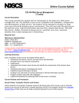 Online Course Syllabi CIS 244 Web Server Management 3 Credits Course Description This course provides the student with an introduction to the basics of a Web server management role. The textbook covers server installation and installation, configuration, and administration of Web servers. The student will be exposed to all topics for both Linux and a Microsoft Windows server environment. They will work with Microsoft Server OS, Red Hat Linux, Internet Information Services (IIS), Apache Web Server, Microsoft SQL Server, MySQL, Microsoft Exchange Server, sendmail, and more. (Assumes students have a basic background in networking.) Required Text Web Server Administration Author: Steve Silva Publisher: Cengage.com ISBN - 13: 978-1-4239-0323-9 ISBN – 10: 1-4239-0323-4 Contact Coleen at the NDSCS Bookstore for the most current textbook information (1-800-342-4325, ext. 2239 or coleen.thoe@ndscs.edu). You may also visit the NDSCS Bookstore web site at www.ndscsbookstore.com and search for book information by class by clicking the "Textbook" tab. Learning Outcomes Upon completion of this course, the student will be able to: Understand the basics of server and web server administration Evaluate server and network components Install server Understand the domain name service and identify the components of the domain name service Understand the basics of managing the server Install the Internet information services Configure new web sites and virtual directories in Internet information services Program dynamic web sites with databases Install and administer the exchange 2000 e-mail server in windows Course Policies and Procedures Access Policy: Computer Failures and Viruses Online students must maintain computer access at all times to the online course. Lack of computer access as an excuse for late work or missed exam/quiz will NOT be accepted. Review the Computer Access Policy to learn how you can take a proactive approach to your online success. 1 Online Course Syllabi Student Attendance Regular attendance and completion of all assignments, on time and as scheduled, is important to your success in this course. An online student who does not regularly attend their online class for a period of seven consecutive days may be dropped from the course. Attendance is evidenced by weekly completion of assignments and/or participation in online discussions. Efforts to contact inactive students are attempted as soon as each semester begins; however, if there is no response from the student and inactivity continues, a drop will be enacted. See the entire NDSCS Attendance Policy at www.ndscs.edu/online-attendance. If your instructor is unexpectedly unavailable and may be delayed in reviewing or correcting assignments, you will be notified of this as a sign of courtesy and respect. Online Student Participation and Conduct Guidelines The practices of courtesy and respect that apply in the traditional classroom also apply online. However, the expectations and practice differ in the online classroom to greater extent. Review the Online Student Participation and Conduct Guidelines (Appendix A) to learn of these expectations. Assignments Please follow the order of units as each unit will build onto the next one and will be accessible according to the schedule posted within the online course. Assignments and quizzes within each chapter are due within specified time frames. Refer to the Schedule for specific due dates. Assignments not completed by the specified deadline but submitted late will have 10% of grade points deducted at instructor's discretion. No points will be assigned for incomplete assignments. Be prepared to spend at least four (4) hours per week in the online class, studying, and completing assignments. Submitting Assignments All assignments should be turned in via Dropbox unless otherwise specified. You are strongly encouraged to make hard copies of your assignments and communications with the instructor to avoid losing data in the case of technical issues. At the first sign of problems, contact your Internet Service Provider (ISP) immediately. It is your responsibility to access the class on another computer in the event of hardware or software problems. If your problems are not cleared up within 12 hours, contact the instructor to make other arrangements. Grading Criteria This class has 1000 points total. So each set of 10 points is worth 1% of your final grade. Each chapter 75 points 10 point review quiz 5 points practice quiz 25 points assignments 2 Online Course Syllabi 25 points discussion questions 10 points participation 8 chapters equal 600 points 200 points on the Midterm test 200 points on the Final test Grading Scale Your performance in this class will be based on the quality and accuracy of your sketches and answers on assignments, quizzes, and tests. Assignments that do not meet the deadlines given by the instructor will be reduced 10% per day. Letter grades will be awarded as follows: LETTER GRADE PERCENT A B C D F 90-100% 80-89% 70-79% 60-69% Below 60% Online Discussions The online discussions are required activities, and full participation is essential for your success of this course. These discussions are an equivalent to the traditional classroom discussions. You are expected to read all postings, and interact with each other. Discussion Grading Criteria Correct grammar and spelling is essential; including punctuation and capitalization. It is the intent of NDSCS to develop employable skills in students, and to prepare them for the workplace. Written communication is one of those skills. If this isn't your strength, develop a habit of performing a spell check in MS Word before submitting your work, or posting to a threaded discussion. You are expected to respond to the discussion questions with relevant and substantive responses (more than “I agree.”) Points will be earned in the Gradebook for your participation in the assigned discussions. Points will be assigned using the fo