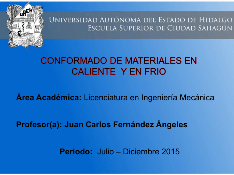 Área Académica: Licenciatura en Ingeniería Mecánica Profesor(a): Juan Carlos Fernández Ángeles Periodo: Julio – Diciembre 2015 • INTRODUCCION • EN EL TRABAJADO DE METALES TALES COMO EL ACERO PODEMOS ENCONTRAR VARIOS PROCESOS, LOS CUALES SE PUEDEN DESTINGUIR, AL TRABAJAR EL MATERIAL ESTE SE PUEDE TRABAJAR EN FRIO O EN CALIENTE. El conformado en caliente es un proceso que depende de la temperatura y el tiempo. Se define como la deformación plástica del material metálico a una temperatura mayor que la de recristalización. La ventaja principal del trabajo en caliente consiste en la obtención de una deformación plástica casi ilimitada, que además es adecuada para moldear partes grandes porque el metal tiene una baja resistencia de cedencia y una alta ductilidad. Por encima de la temperatura mínima de recristalización. La forma de la pieza se puede alterar significativamente. Se requiere menor potencia para deformar el metal. Las propiedades de resistencia son generalmente isotrópicas debido a la ausencia de una estructura orientada de granos creada en el trabajo en frío. El trabajo en caliente no produce fortalecimiento de la pieza. Precisión dimensional más baja. Mayores requerimientos de energía. Oxidación de la superficie de trabajo. El utillaje está sometido a elevados desgastes y consiguientes mantenimientos. Laminado Materiales: metales puros: Al, Cu, Fe, Ti, Zn. Aleaciones: Acero De Al (Al-Cu, Al-Mg, Al-Zn, Al-Mn) De Mg ( Mg-Al, Mg-Zn, Mg-Mn) De Cu (Cu-Zn, Cu-Zn-Sn, Cu-Zn-Pb) De bronces (Cu-Al, Cu-Ni, Cu-Si) Forjado Materiales: metales puros: Al, Cu, Fe, Ti, Zn. Aleaciones: Acero De Al, (Al-Cu, Al-Mg, Al-Zn, Al-Mn) De Mg ( Mg-Al, Mg-Zn, Mg-Mn), De Cu (Cu-Zn, Cu-Zn-Sn, Cu-Zn-Pb) De bronces (Cu-Al, Cu-Ni, Cu-Si) Conformado en el cual se hace pasar el metal por trenes de rodillos que le dan una forma progresivamente más parecida a la deseada. sifunpro.tripod.com La porosidad en el metal es considerablemente eliminada. Las impurezas en forma de inclusiones son destrozadas y distribuidas a través del metal. Los granos gruesos o prismáticos son refinados. Las propiedades físicas generalmente se mejoran, principalmente debido al refinamiento del grano. La cantidad de energía necesaria para cambiar la forma del acero en estado plástico es mucho menor que la requerida cuando el acero está frío. Debido a la alta temperatura del metal existe una rápida oxidación El equipo para trabajo en caliente y los costos de mantenimiento son altos No se pueden mantener tolerancias estrechas. sifunpro.tripod.com Forjado es el nombre genérico de operaciones de conformado mecánico efectuadas con esfuerzo de compresión sobre un material dúctil, de tal modo que tiende a asumir el contorno o perfil de la herramienta de trabajo. En la mayoría de las operaciones de forjado emplease un herramental constituido por un par de herramientas de superficie plana o cóncava, denominadas matrices o estampados. sifunpro.tripod.com Consiste en comprimir una parte de sección cilíndrica entre dos dados planos. Hecho entre matrices planas o de formato simple Usado para grandes piezas sifunpro.tripod.com Conformado de materiales en frio • Cuando un metal es doblado, cortado temperatura ambiente o menor. o estirado a una El efecto de la temperatura da lugar a la siguiente clasificación: – Trabajo en frío, – Trabajo en tibio trabajo en caliente por debajo de la temperatura de recristalización – Trabajo en caliente arriba de la temperatura de recristalización. • Recristalización: formación de granos libres de deformación. Efectos del trabajo en frío • El proceso como tal ocasiona calentamiento por fricción entre el equipo y la pieza, por lo que es común que el trabajo en frío alcance temperaturas hasta de 200 °C. VENTAJAS Ventajas Mejor precisión Mejores acabados superficiales Mayor dureza en las partes Desventajas Requiere de mayores fuerzas Reducción de la ductilidad Existen diferentes procesos de conformación de metales en frío, tales como: Forjado Estirado Cizallado Doblado CONFORMADO POR COMPRESION El forjado fue el primero de los procesos del tipo de compresión indirecta y es probablemente el método más antiguo de formado de metales. Involucra la aplicación de esfuerzos de compresión que exceden la resistencia de fluencia del metal. En este proceso de formado se comprime el material entre dos dados, para que tome la forma deseada La mayoría de operaciones de forjado se realiza en caliente, dada la deformación demandada en el proceso y la necesidad de reducir la resistencia e incrementar la ductilidad del metal. Sin embargo este proceso se puede realizar en frío, la ventaja es la mayor resistencia del componente, que resulta del endurecimiento por deformación. Prensas Son máquinas herramientas cuya característica es la entrega de grandes cantidades de energía (Fuerza x recorrido) de forma controlada. Una prensa debe estar equipada con matrices y punzones diseñados para ciertas operaciones específicas. La mayoría de operaciones de Formado, Doblado, Punzonado, Embutido y Cizallado, se pueden efectuar en cualquier prensa normal si se usan matrices y punzones adecuados • Biografía • http://www.quiminet.com/articulos/el-proceso-de-estirado-en-friopara-la-creacion-de-perfiles-estructurales-2662473.htm • Fundamentos de manufatura moderna 3edi Groover.”pág. 442-452”