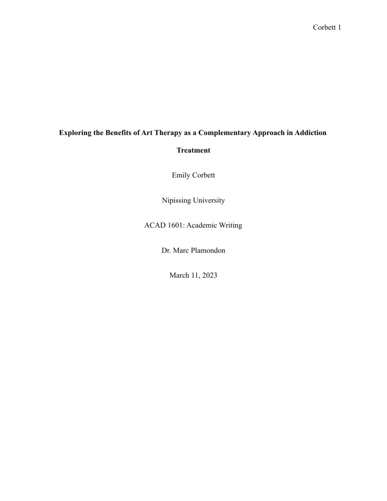 Corbett 1 Exploring the Benefits of Art Therapy as a Complementary Approach in Addiction Treatment Emily Corbett Nipissing University ACAD 1601: Academic Writing Dr. Marc Plamondon March 11, 2023 Corbett 2 Exploring the Efficacy of Art Therapy as a Complementary Approach in Addiction Treatment Addiction is a condition characterised by compulsive and repetitive engagement in behaviour or substance, despite harmful consequences. It can involve substances such as drugs or alcohol and gambling, shopping, or gaming. Addiction can cause changes in the brain's reward system and lead to physical and psychological dependence. It can also negatively impact an individual's health, relationships, and overall quality of life. The history of addiction dates back thousands of years, with evidence of substance use and abuse found in ancient civilizations such as the Egyptians, Greeks, and Romans, who used substances such as opium, wine, and cannabis for medicinal and recreational purposes, "these substances were not necessarily seen as problematic in and of themselves, but rather as tools for achieving certain states of mind or experiences" (Berridge and Mars 172). In the 19th century, addiction was primarily focused on alcoholism; however, the 20th century saw a shift towards a more scientific understanding of addiction, with research identifying the physiological and psychological processes involved. The development of new drugs and technologies also led to the emergence of new forms of addiction. Today, addiction is recognized as a complex and multifaceted disorder requiring a comprehensive treatment and management approach. Addiction treatment often involves a combination of behavioural therapy, medication, and support groups. However, a new form of modern treatment involves art therapy. Art therapy is a form of psychotherapy that uses creative expression to help individuals explore and process their emotions and experiences. It can be a valuable tool in treating addiction, as it allows individuals to express themselves in a non-verbal way and help them gain insight into their addiction and the underlying causes. Art therapy can take many forms, including drawing, painting, sculpting, and collage. The therapist may guide Corbett 3 the individual through the creative process, using prompts and interventions to encourage self-reflection and exploration. In this essay, I will explain how art therapy is a useful holistic tool in combating addiction when combined with traditional treatment techniques. However, when used alone, these more rigorous methods warrant more room for relapse and severe mental health issues. The overall history of addiction treatment has evolved from an ethical and spiritual approach to a medical and scientific one. Early approaches to addiction were primarily focused on punishment and shame, with little understanding of the underlying causes of addictive behaviour. In the article "History of Addictions" by Virginia Berridge and Sarah Mars, the authors note that "addiction has existed as a cultural concept throughout human history, with various substances and behaviours becoming associated with problematic use in different times and places" (Berridge and Mars 171). The 19th century saw the emergence of the disease model of addiction, which viewed addiction as a disorder rather than a moral failing. This led to the development of new treatments, including psychotherapy and pharmacotherapy. The 20th century saw the expansion of the concept of addiction to include a broader range of substances and activities. Today, addiction treatment involves a range of approaches, including behavioural therapies, medication-assisted treatments, and holistic approaches, such as art and music therapy. The history of addiction treatment highlights the importance of understanding the complex factors that contribute to addiction and the need for ongoing research and innovation in addiction treatment. In the essay "The Use of Art and Music Therapy in Substance Abuse Treatment Programs" Aletraris and the contributors explore the benefits of integrating art and music therapy into substance abuse treatment programs. The authors note that the "main assumptions Corbett 4 underlying art therapy are that the patient will be able to express him/herself through a non-verbal, imaginative, and creative exercise" (Aletraris et al. 2). They also highlight how these therapies can promote self-awareness and help individuals develop coping skills, "such as decreasing denial, reducing opposition to alcoholism treatment, providing an outlet for communication, and lessening shame" (Aletraris et al. 3). The essay discusses the role of art and music therapy in addressing underlying trauma and stress, noting that art and music therapy interventions provide a safe space for clients to explore their past experiences and express their emotions. Additionally, they highlight the potential for these therapies to further treatment goals and “motivate patients to change by moving them away from reflection and into a state of action” (Aletraris et al. 3). As well as improve mood and reduce stress levels. Overall, the authors conclude that "use of MET [Motivational Enhancement Therapy] was positively related to art therapy and use of CM [Contingency Management Therapy] was positively associated with music therapy. This could suggest that art and music therapies are being used as complements to other psychosocial treatments, which may ultimately improve patient outcomes by offering more robust treatment options" (Aletraris et al. 11-12). They emphasise the need for further research to fully understand the benefits of these therapies and their potential for enhancing the effectiveness of substance use disorder treatment programs. I strongly agree with Aletraris et al. on the main argument of this essay. The authors argue that incorporating complementary therapies such as art and music therapy into substance abuse treatment programs