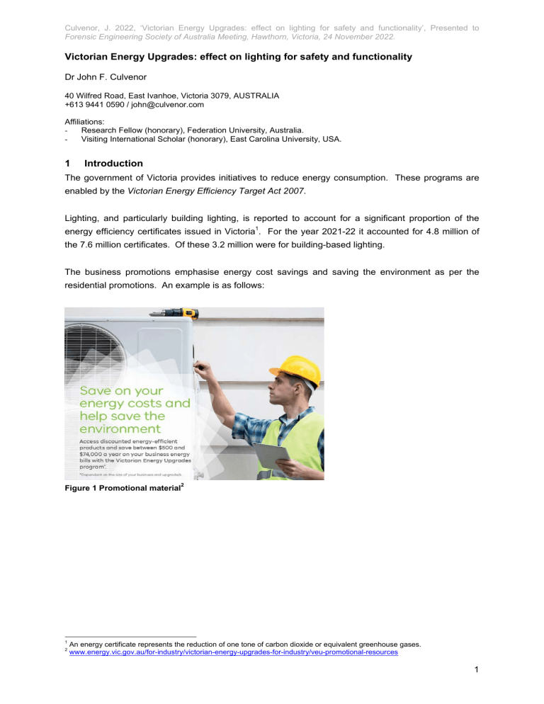 Culvenor, J. 2022, ‘Victorian Energy Upgrades: effect on lighting for safety and functionality’, Presented to Forensic Engineering Society of Australia Meeting, Hawthorn, Victoria, 24 November 2022. Victorian Energy Upgrades: effect on lighting for safety and functionality Dr John F. Culvenor 40 Wilfred Road, East Ivanhoe, Victoria 3079, AUSTRALIA +613 9441 0590 / john@culvenor.com Affiliations: Research Fellow (honorary), Federation University, Australia. Visiting International Scholar (honorary), East Carolina University, USA. 1 Introduction The government of Victoria provides initiatives to reduce energy consumption. These programs are enabled by the Victorian Energy Efficiency Target Act 2007. Lighting, and particularly building lighting, is reported to account for a significant proportion of the energy efficiency certificates issued in Victoria1. For the year 2021-22 it accounted for 4.8 million of the 7.6 million certificates. Of these 3.2 million were for building-based lighting. The business promotions emphasise energy cost savings and saving the environment as per the residential promotions. An example is as follows: Figure 1 Promotional material2 1 2 An energy certificate represents the reduction of one tone of carbon dioxide or equivalent greenhouse gases. www.energy.vic.gov.au/for-industry/victorian-energy-upgrades-for-industry/veu-promotional-resources 1 Culvenor, J. 2022, ‘Victorian Energy Upgrades: effect on lighting for safety and functionality’, Presented to Forensic Engineering Society of Australia Meeting, Hawthorn, Victoria, 24 November 2022. 2 Does the light get upgraded or at least stay the same? The word upgrade could be misleading. A property owner or occupier could have the impression that the intent of the programs is to improve or at least replicate existing lighting output but with less energy being required. That is to say the outcome expected could be to upgrade or at least maintain the actual light as well as upgrading energy efficiency. But it is not necessarily that at all. Confirming the absence of something is conceptually difficult. But by looking at the material there is no requirement specified that I can find that the new lighting will produce as much light as the old or that it will be better (upgraded). It is specified that a standard for lighting should be met. This is discussed later. Even if it is achieved, it is not necessarily the same as upgrading what was present or even achieving a parallel with what was present. The new light outcome is not benchmarked to what was present. It is referenced, at least in theory, to an independent standard rather than what was already in place. If it is done, achieving compliance with a standard could involve more or less lighting than the existing setup. Consumers should know that less light could be an outcome. 3 Code of conduct for providers There are a range of code of conduct materials available including guides for industry behaviour and materials for consumers3: The code of conduct guideline4; Industry guide - generating leads and marketing under the VEU program5; Industry guide - contracting with consumers6; Industry guide - undertaking activities under the VEU program7; Statement of rights8; and Consumer information resource9. Among these materials there is not a lot of attention on lighting functionality. The Victorian Energy Efficiency Target Amendment (Code of Conduct) Regulations 2022 requires that consumers receive clear and accurate information on a range of things. Among those things is the “performance of the product” (reg. 14 (b)). What performance means is not clear; energy performance, lighting performance, both or something else? The Code, the Industry guide on leads, and the Statement of rights mention this requirement. But it is not prominently explained what performance means. Given that AS/NZS 1680 compliance is a requirement it should form part of the explanation of performance. 3 www.esc.vic.gov.au/victorian-energy-upgrades/participating-veu-program/meeting-your-obligations-under-veu-code-conduct www.esc.vic.gov.au/sites/default/files/documents/VEU%20code%20of%20conduct%20-%20guideline%20-%20v1.1.pdf 5 www.esc.vic.gov.au/sites/default/files/documents/VEU%20code%20of%20conduct%20-%20industry%20guide%20%20generating%20leads%20and%20marketing%20under%20the%20VEU%20program_0.pdf 6 www.esc.vic.gov.au/sites/default/files/documents/VEU%20code%20of%20conduct%20-%20industry%20guide%20%20contracting%20with%20consumers_0.pdf 7 www.esc.vic.gov.au/sites/default/files/documents/VEU%20code%20of%20conduct%20-%20industry%20guide%20%20undertaking%20activities%20under%20the%20VEU%20program_0.pdf 8 www.esc.vic.gov.au/sites/default/files/documents/VEU%20code%20of%20conduct%20-%20statement%20of%20rights.pdf 9 www.energy.vic.gov.au/__data/assets/pdf_file/0028/585154/Victorian-Energy-Efficiency-Target-scheme-consumerfactsheet.pdf 4 2 Culvenor, J. 2022, ‘Victorian Energy Upgrades: effect on lighting for safety and functionality’, Presented to Forensic Engineering Society of Australia Meeting, Hawthorn, Victoria, 24 November 2022. 4 AS/NZS1680 According to the Building Based Lighting Upgrade Activity Guide10 the replacements should comply with the AS1680 standards series11. “Each building based lighting upgrade is required to: achieve the minimum illuminance specified in the relevant part or parts of AS/NZS 1680 achieve the recommended level of maintained illuminance specified in the relevant part or parts of AS/NZS 1680.” The provision has been in place for about ten years. It is enabled now by the Victorian Energy Efficiency Target Regulations 2018 (reg. 19 for buildings)12. It was absent from the Victorian Energy Efficiency Target Regulations 2008 when they were first made. The reference to the standard was introduced in Version 009B dated 17 May 2012. Compliance with AS/NZS 1680 is not about taking values from a document and comparing them to what the lamps provide. There are many di
