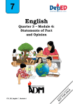 7 English Quarter 3 – Module 6: Statements of Fact and Opinion CO_Q3_English 7_ Module 6 English – Grade 7 Alternative Delivery Mode (ADM) Quarter 3 – Module 6: Statements of Fact and Opinion First Edition, 2020 Republic Act 8293, section 176 states that: No copyright shall subsist in any work of the Government of the Philippines. However, prior approval of the government agency or office wherein the work is created shall be necessary for exploitation of such work for profit. Such agency or office may, among other things, impose as a condition the payment of royalties. Borrowed materials (i.e., songs, stories, poems, pictures, photos, brand names, trademarks, etc.) included in this module are owned by their respective copyright holders. Every effort has been exerted to locate and seek permission to use these materials from their respective copyright owners. The publisher and authors do not represent nor claim ownership over them. Development Team of the Module Writer: Jeanette S. Jumilla Editors: Grace T. Lumingkit and Emeline S. Doruelo Reviewers: Evelyn C. Frusa PhD, Delia B. Mabalot, Rolex T. Lotilla and Arvin M. Tejada Layout Artist: Deliah A. Seloterio Management Team: Allan G. Farnazo Gilbert B. Barrera Arturo D. Tingson Jr. Peter Van C. Ang-ug Prima A. Roullo Evelyn C. Frusa PhD Bernardita M. Villano Printed in the Philippines by Department of Education – SOCCSKSARGEN Region Office Address: Telefax: E-mail Address: Regional Center, Brgy. Carpenter Hill, City of Koronadal (083) 2288825/ (083) 2281893 region12@deped.gov.ph 7 English Quarter 3 – Module 6: Statements of Fact and Opinion Introductory Message This Self-Learning Module (SLM) is prepared so that you, our dear learners, can continue your studies and learn while at home. Activities, questions, directions, exercises, and discussions are carefully stated for you to understand each lesson. Each SLM is composed of different parts. Each part shall guide you step-bystep as you discover and understand the lesson prepared for you. Pre-tests are provided to measure your prior knowledge on lessons in each SLM. This will tell you if you need to proceed on completing this module or if you need to ask your facilitator or your teacher’s assistance for better understanding of the lesson. At the end of each module, you need to answer the post-test to self-check your learning. Answer keys are provided for each activity and test. We trust that you will be honest in using these. In addition to the material in the main text, Notes to the Teacher are also provided to our facilitators and parents for strategies and reminders on how they can best help you on your home-based learning. Please use this module with care. Do not put unnecessary marks on any part of this SLM. Use a separate sheet of paper in answering the exercises and tests. And read the instructions carefully before performing each task. If you have any questions in using this SLM or any difficulty in answering the tasks in this module, do not hesitate to consult your teacher or facilitator. Thank you . What I Need to Know You are now ready to explore the different statements of facts and opinions. In this module, you will be guided as you go through the process of analyzing whether a statement is a fact or an opinion. It is essential that you, as students will be able to accurately distinguish between a fact and opinion by understanding the definitions of these two concepts. You also need to practice applying these definitions through the different activities provided for you in this module. You should bear in mind that the ability to distinguish between a fact and opinion will help you, students to develop critical and analytical skills both in reading and listening. Furthermore, you will be able to appreciate the importance of facts and opinions in your daily life. Learning Objectives: After going through this module, you are expected to: 1. Distinguish fact from opinion 2. React to assertion or expression made by the author in the text using fact or opinion Most Essential Learning Competency: React to what is asserted or expressed in a text. 1 CO_Q3_English 7_ Module 6 What I Know Let us check your prior knowledge. Read the statements and the selections .Then, choose the letter of the correct answer and write it in your answer sheet. PRE-TEST 1. What is a specific detail that can be proven as true based on objective evidence? A) fact B) opinion C) evidence D) statement 2. It is a feeling, judgement, belief or conclusion that cannot be proven true by objective evidence. A) fact B) proof C) detail D) opinion 3. Which of the following is NOT an objective evidence? A) scientific law B) physical evidence C) eyewitness account D) feeling and judgement 4. Which of the following best describes a fact? A) Something that can be proven B) Something that can’t be proven C) The feelings of the main character D) How much the main character likes something 5. Which of the following best describes an opinion? A) A good choice B) A scientific investigation C) A statement that can be proven D) A physical evidence from a crime scene 2 CO_Q3_English 7_ Module 6 6. Which of the following is an opinion? A) Tedd is wearing a blue tie. B) Jason won the race at field day. C) Vince was unhappy that his team lost. D) Sylvette woke up at 7:30 in the morning. 7. Which of the following is a fact? A) Reading is very easy. B) Gary Paulsen is my favorite author. C) I received a 98% on the reading test. D) I’m the smartest student in the tenth grade. 8. Which of the following is NOT a fact? A) Rich people are dishonest. B) A national flag symbolizes a country. C) A karate expert can use his hands as deadly weapon. D) Dengue is an illness caused by a virus that is spread through mosquito bites. Read the paragraph to answer questions 9 and 10. Andrew’s mother and father unloaded the van after the family returned from the soccer tournament. Andrew was exhausted from playing in all eight games over 