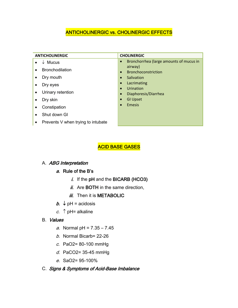 ANTICHOLINERGIC vs. CHOLINERGIC EFFECTS ANTICHOLINERGIC CHOLINERGIC Bronchorrhea (large amounts of mucus in airway) Bronchoconstriction Salivation Lacrimating Urination Diaphoresis/Diarrhea GI Upset Emesis Mucus Bronchodilation Dry mouth Dry eyes Urinary retention Dry skin Constipation Shut down GI Prevents V when trying to intubate ACID BASE GASES A. ABG Interpretation a. Rule of the B’s i. If the pH and the BICARB (HCO3) ii. Are BOTH in the same direction, iii. Then it is METABOLIC b. pH = acidosis c. pH= alkaline B. Values a. Normal pH = 7.35 – 7.45 b. Normal Bicarb= 22-26 c. PaO2= 80-100 mmHg d. PaCO2= 35-45 mmHg e. SaO2= 95-100% C. Signs & Symptoms of Acid-Base Imbalance a. As the pH goes, so goes the patient except for Potassium (bc it will try to compensate) pH UP K [ALKALOSIS] pH DOWN K [ACIDOSIS] Tachycardia Bradycardia Tachypnea Bradypnea Diarrhea Hypotension Tremors lucidity Seizure anorexia Hyperreflexia coma Agitated lethargy Borborygmi ( bowel sounds) cardia arrest Hypertension suppressed, decreased, falling Palpitations Tetany Anxiety/Panic Poly D. Causes of Acid-Base Imbalance a. First ask, “Is it Lung?” i. If YES- then it is Respiratory b. Then ask yourself: i. Are they Overventilating or Underventilating? 1. If Overventilating pick Alkalosis 2. If Underventilating pick Acidosis c. If not lung, then it’s Metabolic i. If the patient has prolonged gastric vomiting or suction, pick Metabolic Alkalosis ii. For everything else that isn’t lung, pick Metabolic Acidosis 1. Also, if you don’t know what to pick choose Metabolic Acidosis VENTILATOR ALARMS 1. High Pressure Alarms are triggered by resistance to air flow and can be caused by obstructions of three types: a. Kinked Tube i. NRS ACTION: Unkink it b. Water in tubing (caused by condensation) i. NRS ACTION: Empty it/Remove H2O c. Mucus in airway i. NRS ACTION: Turn, C&DB; only use suction if C&DB fails, as a last resort 2. Low Pressure Alarms are triggered by resistance to air flow and can be caused by disconnections of the: a. Tubing i. NRS ACTION: Pay attention to where tubing is…(contamination) ii. If on floor, change out iii. If on chest, clean with alcohol then put back on 3. Respiratory Alkalosis (Overventilation) means ventilator settings may be too HIGH. 4. Respiratory Acidosis (Underventilation) means ventilator settings may be too LOW. 5. To “Wean” To gradually and incrementally decrease with the goal of ridding all together ALCOHOLISM Note: Remember in a psych question if you are asked to prioritize DO NOT forget Maslow! Use the following priorities: 1. Physiological 2. Safety 3. Comfort 4. Psychological 5. Social 6. Spiritual Also, ALL PSYCH PATIENTS START AS MED SURG PATIENTS…RULE OUT ALL FEASIBLE MED ANSWERS BEFORE PICKING PSYCH ANSWERS 1. Psychodynamics of Alcoholism a. The #1 psychological problem in abuse is DENIAL. i. Definition: 1. Refusal to accept the reality of their problem. ii. Treatment: 1. Confront it by pointing out to the person the difference between what they say and what they do. 2. In contrast, support the denial of loss and grief (BC the use of denial is serving a functioning person) b. DEPENDENCY/CODEPENDENCY i. Dependency: When the abuser gets the significant other to do things for them or make decisions for them. ii. Codependency: When the significant other derives positive self-esteem from doing other things for or making decisions for the abuser. iii. Treatment: 1. Set boundary (limits) and enforce them. Agree in advance on what requests are allowed then enforce the agreement 2. Work on the self-esteem of the codependent person. c. MANIPULATION i. Definition: When the abuser gets the significant other to do things for him/her that are not in the best interest of the Significant Other. The nature of the act is dangerous or harmful to the significant other ii. Treatment: 1. Set limits and enforce 2. Its easier to treat than dependency/codependency because nobody likes to be manipulated 2. Wernicke’s (Korsakoff’s) Syndrome a. Psychosis induced by Vitamin B1 (Thiamine) deficiency. b. Primary symptom: amnesia with confabulation (making up stories to fill in memory loss—believe as true) c. Characteristics: i. Preventable 1. By giving B1 vitamins ii. Arrestable 1. Can stop from getting worse- not imply better iii. Irreversible 1. Dementia symptoms don’t get better—only worse 3. Antabuse/Revia a. Disulfiram (drugs used for alcoholism b. Aversion Therapy c. Onset and duration of effectiveness: 2 weeks i. Take drugs 2 weeks and builds up in blood to a level that when drinking alch will become horribly sick; if off for two weeks, will be able to drink without sickness again d. Patient teaching: Avoid ALL forms of alcohol to avoid nausea, vomiting, and possibly death, including: i. Mouthwash, aftershave, perfumes/cologne, insect repellant, vinigarettes (salad dressings), vanilla extract, elixirs (contains alch-OTC med), alcohol prep pad, alch sanitizers OVERDOSE VS. WITHDRAWAL First ask yourself, is the drug an upper or a downer? UPPERS Names: Caffeine Cocaine PCP/LSD (Psychedelic hallucinogens) Methamphetamines-speed ADHD- adderrall/Ritalin Bath Salts (Cath-Kath) Signs/Symptoms: Tachycardia Hypertension Diarrhea Agitation Tremors Clonus DOWNERS Names: Everything else Signs/Symptoms: Bradycardia Hypotension Constipation Constricted pupils Flaccidity Respiratory arrest Belligerence Seizures Exaggerated, shrill, high pitched cry Difficult to console Decreased core body temp Then ask yourself, “Are they talking about overdose or withdrawal?” Overdose/Intoxication Withdrawal “I have too much…” “I don’t have enough..” Too much upper: Everything is UP Too little upper: Everything is DOWN Too much downer Everything is DOWN Too little downer: Everything is UP Drug Addiction in the Newborn Always assume intoxication (first 24 hours after birth), then after this time, assume withdrawal Alcohol Withdrawal Syndrome vs. Delirium Tremens 1. Differences: a. Every alc