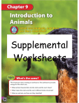 Supplemental Worksheets Name each other anywhere through its central axis Quick Vocabulary Lesson 1 adaptation inherited trait that increases an organism’s chances of surviving and reproducing in its environment asymmetry body plan which cannot be divided into any two parts that are nearly mirror images of each other bilateral symmetry body plan which an organism can be divided into two parts that are nearly mirror images of each other Co py rig ht © Gl en co e/ M cG ra wHi ll, a di vis io n of Th e M cG ra wHi ll Co m pa ni es, In c. endoskeleton internal rigid framework that supports humans and other animals exoskeleton thick, hard outer covering that protects crabs and other animals hydrostatic skeleton fluid-filled internal cavity surrounded by muscle tissue radial symmetry body plan which can be divided into two parts that are nearly mirror images of species group of organisms that have similar traits and are able to produce fertile offspring Date Class mollusk’s internal organs metamorphosis Lesson 2 attach to fasten mantle thin layer of process in which the body form of an animal changes as it grows from an egg to an adult molting process of replacing an outer covering parasite animal that survives by living inside or on another organism, gets food from the organism, and does not help in the organism’s survival shedding and tissue that covers a Introduction to Animals 3 Name Date Class Quick Vocabulary Lesson 3 amnion protective membrane that surrounds the embryo ectotherm animal that heats its body with heat from the environment endotherm animal that generates body heat from the inside gill organ that exchanges carbon dioxide for oxygen in water mammary gland special tissue that produces milk for young mammals notochord flexible rod-shaped structure that supports the body of a developing chordate pharyngeal pouch groove along the side of a developing chordate that will develop into other body structures scale small, flat, rigid external body covering Co py rig ht © Gl en co e/ M cG ra wHi ll, a di vis io n of Th e M cG ra wHi ll Co m pa ni es, In c. 4 Introduction to Animals Name p l e o f a n a n i m a l w i t h s y m m e t r y . Date Class Lesson Outline LESSON 1 What are animals? A. Animal Characteristics 1. The word comes f means “living being” or “animal.” 2. Like plants, all animals are one cell. a. Each animal cell, like plant cells, has a(n) point during its life. 3. b. Only animals have Animals get energy from the 4. Each animal begins as a fertilized egg cell called B. How do scientists group animals? c. 1. Animals can be grouped by looking at their body parts are arranged. a. central axis. symmetry is d. be divided into two parts that are nearly mirro b. H u m a n b e i n g s a r e a n e x a m symmetry is a body pla two parts that are nearly mirror images of each other any refers to a body plan th two parts that are nearly mirror images. 2. is a system that groups livi taxons. a. Taxons are groups of living things that have certain in common. are the biggest groups i b. c. Animals are classified in the Domain each animal cell has a nucleus at some point in its life. d. The second level of taxonomy consists of the 3. Relationships among and within generations of a family are shown in a(n) . N e w to n G ra m m ar S c h o ol 2 0 2 3 1 Introduction to Animals Name Date Class Lesson Outline continued C. Animal Adaptations 1. An inherited trait that increases an organism’s chances of surviving and reproducing in its environment is called a(n) 2. Animal adaptations can be structural, behavioral, or 3. Structural adaptations in animals include their senses, skeletons, and . 4. The abilities to detect infrared light or adaptations that can help organisms detect the presence o or an enemy. a. Animal skeletons b. A(n) skeleton, suc fluid-filled internal cavity surrounded by muscle tissu c. A crab’s soft internal structures are protected by a thick, hard outer covering called a(n) . d. Humans have an internal rigid framework called a(n) Ne wt on Gr a m m ar Sc ho ol20 23 e. In a(n) circulatory open spaces around the organism’s organs. f. In a(n) circulatory blood through a system of vessels. 5. are behaviors that anim a. Another important animal adaptatio n is the ability to behaviors . b. Baby geese learning to follow their mother soon after birth is a learned behavior called . 6. Functional adaptations in species enable them to survival and maintain a. Animal reproduction can occur in water or on b. F e r t i l i z a t i o n t h a t o c c u r s i n t h e w a t e r i s c a l l e d f e r t i l i z a t i o n . c. F e r t i l i z a t i o n t h a t o c c u r s i n s i d e f e m a l e i s c a l l e d f e r t i l i z a t 2 i o n . d. Most animal species that live on land use fertilization. Introduction to Animals Name Date Class Content Practice A LESSON 1 What are animals? Directions: On the line before each definition, write the letter of the term that matches it correctly. Each term is used only once. 1. a body plan in which an organism can be divided into two parts that are nearly mirror images of each other 2. a body plan in which an organism can be divided into two parts that are nearly mirror images of each other anywhere through its central axis 3. a body plan in which an organism cannot be divided into any two parts that are nearly mirror images 4. an inherited trait that N e w to n G ra m m ar S c h o ol -2 0 2 3 increases an organism’s chances of surviving and reproducing in its environment 5. a fluid-filled internal cavity surrounded by muscle tissue 6. a thick, hard outer covering 7. an internal rigid framework that supports animals A. adaptation B. asymmetry C. bilateral symmetry D. endoskeleton E. exoskeleton F. hydrostatic skeleton G. radial symmetry 3 Introduction to Animals Name Date Class LESSON 1 Content Practice B What are animals? Directions: Complete the concept map with the correct terms from the word bank in the space provided. Each ter