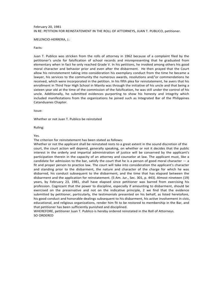 February 20, 1981 IN RE: PETITION FOR REINSTATEMENT IN THE ROLL OF ATTORNEYS, JUAN T. PUBLICO, petitioner. MELENCIO-HERRERA, J.: Facts: Juan T. Publico was stricken from the rolls of attorney in 1962 because of a complaint filed by the petitioner’s uncle for falsification of school records and misrepresenting that he graduated from elementary when in fact he only reached Grade V. In his petitions, he invoked among others his good moral character and behavior prior and even after the disbarment. He then prayed that the Court allow his reinstatement taking into consideration his exemplary conduct from the time he became a lawyer, his services to the community the numerous awards, resolutions and/'or commendations he received, which were incorporated in the petition. In his fifth plea for reinstatement, he avers that his enrollment in Third Year High School in Manila was through the initiative of his uncle and that being a sixteen year old at the time of the commission of the falsification, he was still under the control of his uncle. Additionally, he submitted evidences purporting to show his honesty and integrity which included manifestations from the organizations he joined such as Integrated Bar of the Philippines Catanduanes Chapter. Issue: Whether or not Juan T. Publico be reinstated Ruling: Yes. The criterion for reinstatement has been stated as follows: Whether or not the applicant shall be reinstated rests to a great extent in the sound discretion of the court, the court action will depend, generally speaking, on whether or not it decides that the public interest in the orderly and impartial administration of justice will be conserved by the applicant's participation therein in the capacity of an attorney and counselor at law. The applicant must, like a candidate for admission to the bar, satisfy the court that he is a person of good moral character — a fit and proper person to practice law. The court will take into consideration the applicant's character and standing prior to the disbarment, the nature and character of the charge for which he was disbarred, his conduct subsequent to the disbarment, and the time that has elapsed between the disbarment and the application for reinstatement. (5 Am. Jur., Sec. 301, p. 443). Almost nineteen (19) years, by February 23, 1981, shall have elapsed since petitioner was barred from exercising his profession. Cognizant that the power to discipline, especially if amounting to disbarment, should be exercised on the preservative and not on the indicative principle, 2 we find that the evidence submitted by petitioner, particularly, the testimonials presented on his behalf, as listed heretofore, his good conduct and honorable dealings subsequent to his disbarment, his active involvement in civic, educational, and religious organizations, render him fit to be restored to membership in the Bar, and that petitioner has been sufficiently punished and disciplined. WHEREFORE, petitioner Juan T. Publico is hereby ordered reinstated in the Roll of Attorneys. SO ORDERED