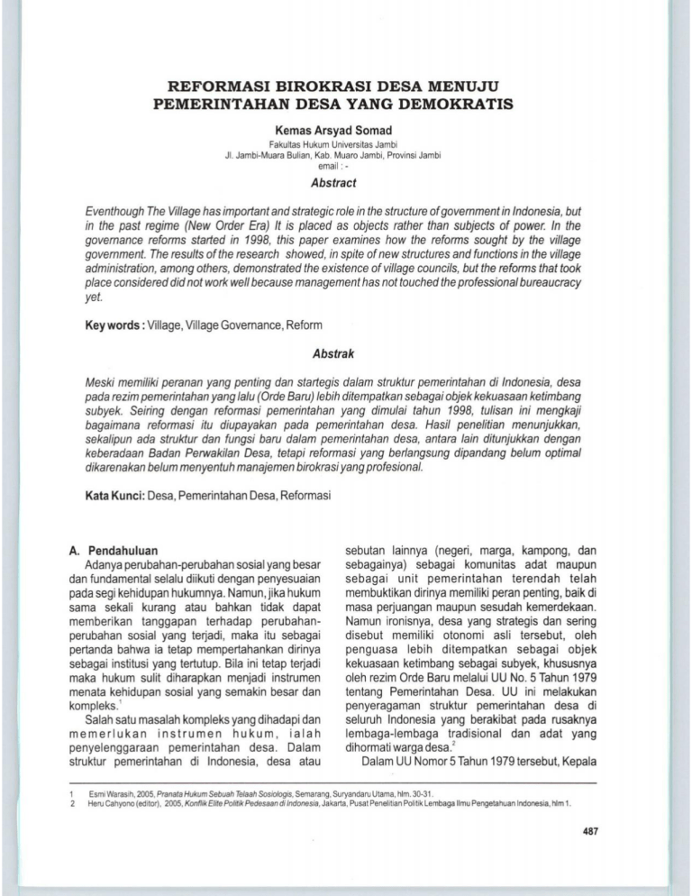 REFORMASI BIROKRASI DESA MENUJU PEMERINTAHAN DESA YANG DEMOKRATIS Kemas Arsyad Somad Fakultas Hukum Unlversitas Jambi JI. Jambi-Muara Bulian, Kab. Muaro Jambi, Provinsl Jambi email:- Abstract Eventhough The Village has important and strategic role in the structure of government in Indonesia, but in the past regime (New Order Era) It is placed as objects rather than subjects of power. In the governance reforms started in 1998, this paper examines how the reforms sought by the village government. The results of the research showed, in spite of new structures and functions in the village administration, among others, demonstrated the existence of village councils, but the reforms that took place considered did not work well because management has not touched the professional bureaucracy yet. Key words : Village, Village Governance, Reform Abstrak Meski memiliki peranan yang penting dan startegis dalam struktur pemerintahan di Indonesia, desa pada rezim pemerintahan yang lalu (Orde Baru) lebih ditempatkan sebagai objek kekuasaan ketimbang subyek. Seiring dengan reformasi pemerintahan yang dimulai tahun 1998, tulisan ini mengkaji bagaimana reformasi itu diupayakan pada pemerintahan desa. Hasil penelitian menunjukkan, sekalipun ada struktur dan fungsi baru dalam pemerintahan desa, antara lain ditunjukkan dengan keberadaan Badan Perwakilan Desa, tetapi reformasi yang berlangsung dipandang be/um optimal dikarenakan be/um menyentuh manajemen birokrasi yang profesional. Kata Kunci: Desa, Pemerintahan Desa, Reformasi A. Pendahuluan Adanya perubahan-perubahan sosial yang besar dan fundamental selalu diikuti dengan penyesuaian pada segi kehidupan hukumnya. Namun,jika hukum sama sekali kurang atau bahkan tidak dapat memberikan tanggapan terhadap perubahanperubahan sosial yang terjadi, maka itu sebagai pertanda bahwa ia tetap mempertahankan dirinya sebagai institusi yang tertutup. Bila ini tetap terjadi maka hukum sulit diharapkan menjadi instrumen menata kehidupan sosial yang semakin besar dan kornpleks.' Salah satu masalah kompleks yang dihadapi dan memerlukan instrumen hukum, ialah penyelenggaraan pemerintahan desa. Dalam struktur pemerintahan di Indonesia, desa atau 1 2 sebutan lainnya (negeri, marga, kampong, dan sebagainya) sebagai komunitas adat maupun sebagai unit pemerintahan terendah telah membuktikan dirinya memiliki peran penting, baik di masa perjuangan maupun sesudah kemerdekaan. Namun ironisnya, desa yang strategis dan sering disebut memiliki otonomi asli tersebut, oleh penguasa lebih ditempatkan sebagai objek kekuasaan ketimbang sebagai subyek, khususnya oleh rezim Orde Baru melalui UU No. 5 Tahun 1979 tentang Pemerintahan Oesa. UU ini melakukan penyeragaman struktur pemerintahan desa di seluruh Indonesia yang berakibat pada rusaknya lembaga-lembaga tradisional dan adat yang dihormati warga desa.2 Dalam UU Nomor 5 Tahun 1979 tersebut, Kepala Esrru Waras1h, 2005, Pranata Hukum Sebuah Telaah Sosio/ogis, Semarang, Suryandaru Utama, him. 30-31. Heru Cahyono (edttor), 2005, Konflik Ellie Polit1k Pedesaan di Indonesia, Jakarta, Pusat Penelitian Polit1k Lembaga llmu Pengetahuan Indonesia, him 1. 487 MMH, Ji/id 41 No. 4 Oktober 2012 Desa dan Dewan Desa dirancang sedemikian rupa oleh pusat sehingga desa lebih bertanggung jawab kepada pemerintah atasan ketimbang warga desa yang memilihnya secara langsung. Dengan demikian desa tidak lebih merupakan kepanjangan tangan kepentingan penguasa (arm of the state). Hal ini kemudian berdampak pada terhambatnya desa untuk mewujudkan perannya dalam membangun demokrasi dan mengimplementasikan otonominya. Hambatan-hambatan tersebut paling tidak dapat dilihat dalam bentuk, pertama, hambatan legal rasional, di mana desa ditempatkan sebagai subordinasi atau bawahan pemerintah kecamatan dan pemerintah kabupaten. Hal ini tampak dari ketentuan UU yang mengharuskan kepala desa bertanggung jawab kepada pejabat yang mengangkat dan memberhentikannya (yakni bupati/walikota melalui camat), dan bukan kepada masyarakat desa yang memilihnya. Kedua, hambatan subtansif prosedural untuk mewujudkan pemerintah desa yang demokratis. Pemerintahan desa semasa orde baru tidak mengenal lembaga pengontrol pemerintah desa. Hal ini menjadikan kekuasaan pemerintahan kepala desa hampir absolut. Meski UU No. 5 Tahun 1979 (Pasal 3) mengatur pemerintah desa terdiri atas kepala desa dan lembaga musyawarah desa (LMD), namun LMD bukanlah lembaga kontrol, melainkan sebuah badan permusyawaratan/pemufakatan antar elite pemerintahan desa dengan tokoh-tokoh masyarakat desa. Di dalam struktur tersebut, posisi kepala desa sebagai kepala pemerintahan sekaligus sebagai ketua LMD; hal ini menunjukkan sentralisasi kekuasaan berada di tangan kepala desa. Ketiga, hambatan berupa penyeragaman struktur dan fungsi organisasi kemasyarakatan di desa. Selain LMD, juga dibentuk Lembaga Ketahanan Masyarakat Desa (LKMD) melalui lnstruksi Presiden No. 28/1980. Sesuai instruksi Mendagri No.4/1981, LKMD secara ideal formal dimaksudkan sebagai sebuah lembaga yang berfungsi mengkoordinasikan dan mengatur pelaksaan proyek-proyek pembangunan di tingkat desa. Hampir mirip dengan LMD, LKMD terdiri atas kumpulan elite desa yang dekat dengan kepala 3 4 5 6 488 desa. Dalam tata cara pembentukan pengurus LKMD, para anggotanya harus mendapat persetujuan dari kepala desa, carnal dan bupati/walikota untuk disahkan.3 Dengan demikian, LKMD akan cenderung diisi oleh orang-orang yang dekat dengan kepentingan kepala desa, sehingga kecil kemungkinan muncul pandangan-pandangan kritis a tau berbeda dari anggota LKMD. Begitulah pemerintahan desa dikonstruksikan pada masa pemerintahan orde baru. Tulisan ini dimaksudkan untuk mengkaji bagaimana perbaikan pemerintahan desa diupayakan dalam pemerintahan era reformasi. Hal ini penting dikaji karena lahirnya era reformasi pada dasamya ditujukan untuk memperbaiki pemerintahan yang berlangsung, termasuk di tingkatan bawah (desa). B. Pembahasan 1. Konsep Dasar Birokrasi Secara sederhana birokrasi did