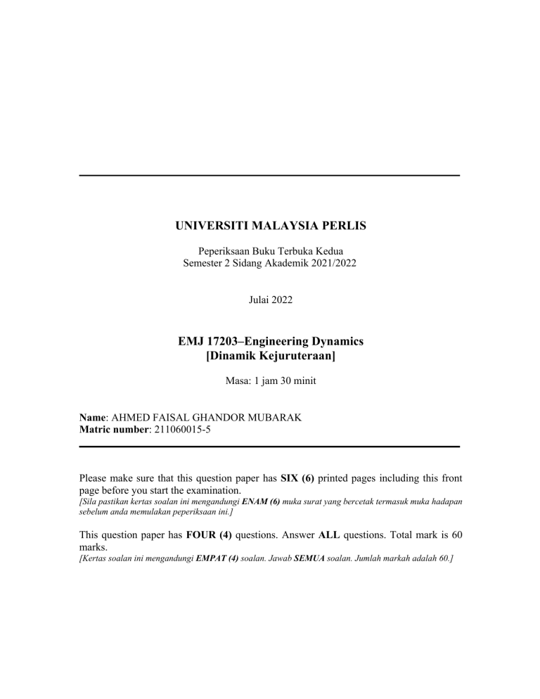 UNIVERSITI MALAYSIA PERLIS Peperiksaan Buku Terbuka Kedua Semester 2 Sidang Akademik 2021/2022 Julai 2022 EMJ 17203–Engineering Dynamics [Dinamik Kejuruteraan] Masa: 1 jam 30 minit Name: AHMED FAISAL GHANDOR MUBARAK Matric number: 211060015-5 Please make sure that this question paper has SIX (6) printed pages including this front page before you start the examination. [Sila pastikan kertas soalan ini mengandungi ENAM (6) muka surat yang bercetak termasuk muka hadapan sebelum anda memulakan peperiksaan ini.] This question paper has FOUR (4) questions. Answer ALL questions. Total mark is 60 marks. [Kertas soalan ini mengandungi EMPAT (4) soalan. Jawab SEMUA soalan. Jumlah markah adalah 60.] (EMJ 17203) -2SULIT Question 1 [Soalan 1] (a) Planar motion of a body occurs when all the particles of a rigid body move along paths which are equidistant from a fixed plane. Name four (4) types of a rigid body planar motion as shown in Figure 1. Based on your understanding, explain all these types of motion. [Pergerakan satah suatu badan berlaku apabila semua zarah jasad pegun bergerak sepanjang laluan dimana jaraknya sama daripada satah tetap. Namakan empat (4) jenis pergerakan oleh jasad pegun seperti yang ditunjukkan dalam Rajah 1. Berdasarkan pemahaman kamu, terangkan kesemua jenis pergerakkan ini.] (4 Marks/ Markah) Figure 1 [Rajah 1] (EMJ 17203) -3SULIT (b) Figure 2 shows pully A is given a constant angular acceleration πΌπ΄ = 5 rad/sec2 at the instant ππ΄ = 7 rad/s. Determine the magnitude of acceleration of point B on pully C when A rotates 2 revolutions. Pully C has inner hub which is fixed to outer one and turns with it. [Rajah 2 menunjukkan takal π΄ diberi pecutan sudut malar πΌπ΄ = 5 rad/saat2 pada saat ππ΄ = 7 rad/s. Tentukan magnitud pecutan di titik π΅ pada takal πΆ apabila π΄ berputar sebanyak 2 pusingan. Takal πΆ mempunyai alur dalam yang dipasang pada bahagian luarnya dan berpusing dengannya.] (6 Marks/ Markah) Figure 2 [Rajah 2] (EMJ 17203) -4SULIT Question 2 [Soalan 2] (a) Describe and elaborate the difference between Kinematics and Kinetics. [Terangkan dan huraikan perbezaan antara Kinematik dan Kinetik.] (4 Marks/ Markah) (b) Determine the mass moment of inertia of the tin plate about an axis that perpendicular to the page and passing through point π as shown in Figure 3. The material has a mass per unit area of 16 kg/m2. [Tentukan momen jisim inersia plat timah terhadap paksi yang bersudut tegak dengan halaman muka surat dan melalui titik π seperti yang ditunjukkan dalam Rajah 3. Bahan tersebut mempunyai jisim per unit luas 16 kg/m2.] (6 Marks/ Markah) Figure 3 [Rajah 3] (EMJ 17203) -5SULIT Question 3 [Soalan 3] Figure 4 shows a forklift is lifting a crate. The mass of the forklift including the driver is 1.3 Mg and the mass of the crate is 104 kg. The forklift lifts the crate with an acceleration of 6 m/s2. Note that the centers of mass of the forklift and the crate are at G and C, respectively. [Rajah 4 menunjukkan sebuah pengangkut sedang mengangkat sebuah peti. Jisim pengangkut termasuk pemandu ialah 1.3 Mg dan jisim peti ialah 104 kg. Pengangkut itu mengangkat peti dengan pecutan 6 m/s2. Diberi pusat jisim untuk pengangkut dan peti itu masing-masing berada pada G dan C.] (a) Draw the free body diagram and kinetic diagram of the system. [Lukis gambar rajah jasad bebas dan gambar rajah kinetik bagi system tersebut.] (4 Marks/ Markah) (b) Determine the normal reaction forces at each of the two wheels at A and B. [Tentukan daya tindak balas normal pada setiap dua roda di A dan B.] (12 Marks/ Markah) (c) If the rear-wheel drive forklift is moving to the right and achieve a constant acceleration starting from rest, evaluate the minimum time needed to achieve a speed of 9 m/s. The coefficient of static friction between the wheels and the road surface is μs = 0.8. The front wheels are free to rotate. Neglect the mass of the wheels. [Jika pengangkut pacuan roda belakang tersebut bergerak ke kanan dan mencapai pecutan malar bermula dari pegun, tentukan masa yang diperlukan untuk mencapai kelajuan 9 m/s. Pekali geseran statik antara roda dan permukaan jalan ialah μs = 0.8. Roda hadapan adalah bebas berputar. Abaikan jisim roda.] (4 Marks/ Markah) Figure 4 [Rajah 4] (EMJ 17203) -6SULIT Question 4 [Soalan 4] Figure 5 shows a 45-kg wheel is mounted to the link Z with mass center at G. The wheel is released from rest in the horizontal position at A and rolling down on the circular surface without slipping. The radius of gyration of the wheel about its mass center is kG = 0.33 m. Neglect the mass of link Z. [Rajah 5 menunjukkan sebuah roda 45 kg yang dipasang pada penghubung Z dengan pusat jisim di G. Roda itu dilepaskan daripada pegun dalam kedudukan mengufuk di A dan bergolek ke bawah di atas permukaan bulat tanpa gelincir. Jejari kilasan roda mengenai pusat jisimnya ialah kG = 0.33 m. Abaikan jisim penghubung Z.] (a) Describe two forces that do no work in the system. Explain the reason. [Terangkan dua daya yang tidak berfungsi di dalam system tersebut. Jelaskan sebabnya.] (4 Marks/ Markah) (b) Compute the angular velocity of the wheel when it reaches B. [Hitung halaju sudut roda apabila ia tiba di B.] (8 Marks/ Markah) (c) If a couple moment of M = 789 Nβm is applied to link Z in counter clockwise direction, evaluate the resulted value of angular velocity of the wheel when it reaches B. [Jika pasangan momen M = 789 Nβm diaplikasikan pada pautan Z mengikut arah lawan jam, nilaikan halaju sudut roda apabila ia tiba di B.] (8 Marks/ Markah) Figure 5 [Rajah 5]