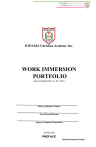 CHAMBER of Quality Education and HOME of Christian Learning RJDAMA Christian Academy Inc. WORK IMMERSION PORTFOLIO (based on DepEd Order No. 30, s. 2017) Name of Student-Trainee Track/Strand/Section Agency/Company/Cooperative SY 2022-2023 PREFACE 1 SHS Work Immersion Portfolio CHAMBER of Quality Education and HOME of Christian Learning RATIONALE This Work Immersion Portfolio will serve as a workbook for the students who will take up the course/subject Work Immersion in Senior High School. The framework is based on DepEd Order No. 30 s. 2017, entitled “Guidelines for Work Immersion”. This workbook will essentially foster in-depth learning of the world of work and assessment of student's performance during work immersion. Furthermore, the purpose of this portfolio includes but is not limited to the following: For Student-Trainees: ✓ The portfolio will be used as a source of motivation and guide for work immersion. ✓ This will serve as a documentation and approval of lessons learned. ✓ This will provide feedback of their performance level. ✓ This will pave the way in preparation for real job application. School: ✓ This contains regulations and conditions regarding contract between school and student. ✓ This is an information about curriculum and record of lessons learned. ✓ This is a record of student-trainees’ performance for assessment. Agency/Company: ✓ This contains introduction of company in general. ✓ This enumerates training rules and regulations for training Inside the agency/company. ✓ This provides feedback to and from student-trainees. WORK IMMERSION 2 SHS Work Immersion Portfolio CHAMBER of Quality Education and HOME of Christian Learning Grade: 12 No. of Hours: 80 hours Pre-requisite: Should have taken at least 4 Specialized Subjects Course Description: Work Immersion is one of the course requirements for graduation. A Senior High School student has to undergo Work Immersion in an industry that directly relates to the student's postsecondary goal. Through Work Immersion, the students are exposed to and become familiar with workrelated environment related to their field of specialization to enhance their competence. Specifically, the students are able to: (i) gain relevant and practical industrial skills under the guidance of industry experts and workers; (ii) appreciate the importance and application of the principles and theories taught in school; (iii) enhance their technical knowledge and skills: (iv) enrich their skills in communications and human relations; (v) develop good working habits, attitudes, appreciation, and respect for work. These prepare them to meet the needs and challenges of employment or higher education after graduation. Duties and Responsibilities of the Learner In this course, the learners are expected to: 1. Attend Pre and Post Immersion Activities: 2. Report to the Work Immersion Partner Institution Supervisor during actual immersion; 3. Perform the duties and tasks as indicated in the prescribed template for work immersion list of tasks/activities; and 4. Prepare the documentations and reports required in the curriculum and by the Partner Institution. Assessment The Work Immersion Teacher and the Work Immersion Partner Institution Supervisor will jointly assess the learner's performance following the DepEd Order No. 8, s. 2015 – “Policy Guidelines on Classroom Assessment for the K to 12 Basic Education Program”. STUDENT INFORMATION SHEET 3 SHS Work Immersion Portfolio CHAMBER of Quality Education and HOME of Christian Learning Name: _________________________________________________ Date of Birth: ___________________________________________ Place of Birth: ___________________________________________ (Insert 2x2 Picture) Parent's/Guardian's Name: ________________________________ Postal Address: __________________________________________ E-mail Address: __________________________________________ Cellphone Number: _______________________________________ Religion: ________________________________________________ Health Issues/Allergies: _____________________________________________________________ Hobbies/Past Time Activities: ________________________________________________________ Skills/Talents: _____________________________________________________________________ Extra-curricular Activities in School: __________________________________________________ Support group/home companions: ____________________________________________________ List your favorites: ________________________________________________________________ One word or object that describes yourself: _____________________________________________ How do you feel about school? _______________________________________________________ __________________________________________________________________________________ __________________________________________________________________________________ What are your most memorable subject/class? Why? ____________________________________ __________________________________________________________________________________ __________________________________________________________________________________ What are your plans after Senior High School? __________________________________________ __________________________________________________________________________________ __________________________________________________________________________________ __________________________________________________________________________________ What is your career path? ____________________________________________________________ __________________________________________________________________________________ __________________________________________________________________________________ __________________________________________________________________________________ What is your philosophy in life? ______________________________________________________ __________________________________________________________________________