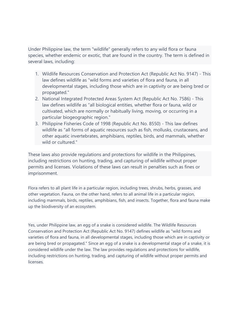 Under Philippine law, the term "wildlife" generally refers to any wild flora or fauna species, whether endemic or exotic, that are found in the country. The term is defined in several laws, including: 1. Wildlife Resources Conservation and Protection Act (Republic Act No. 9147) - This law defines wildlife as "wild forms and varieties of flora and fauna, in all developmental stages, including those which are in captivity or are being bred or propagated." 2. National Integrated Protected Areas System Act (Republic Act No. 7586) - This law defines wildlife as "all biological entities, whether flora or fauna, wild or cultivated, which are normally or habitually living, moving, or occurring in a particular biogeographic region." 3. Philippine Fisheries Code of 1998 (Republic Act No. 8550) - This law defines wildlife as "all forms of aquatic resources such as fish, mollusks, crustaceans, and other aquatic invertebrates, amphibians, reptiles, birds, and mammals, whether wild or cultured." These laws also provide regulations and protections for wildlife in the Philippines, including restrictions on hunting, trading, and capturing of wildlife without proper permits and licenses. Violations of these laws can result in penalties such as fines or imprisonment. Flora refers to all plant life in a particular region, including trees, shrubs, herbs, grasses, and other vegetation. Fauna, on the other hand, refers to all animal life in a particular region, including mammals, birds, reptiles, amphibians, fish, and insects. Together, flora and fauna make up the biodiversity of an ecosystem. Yes, under Philippine law, an egg of a snake is considered wildlife. The Wildlife Resources Conservation and Protection Act (Republic Act No. 9147) defines wildlife as "wild forms and varieties of flora and fauna, in all developmental stages, including those which are in captivity or are being bred or propagated." Since an egg of a snake is a developmental stage of a snake, it is considered wildlife under the law. The law provides regulations and protections for wildlife, including restrictions on hunting, trading, and capturing of wildlife without proper permits and licenses. The Wildlife Resources Conservation and Protection Act (Republic Act No. 9147) is a Philippine law that aims to protect and conserve the country's wildlife and their habitats. The main purpose of the law is to promote the conservation and sustainable use of wildlife resources in the Philippines by providing a legal framework for their protection and management. Some of the specific objectives of the law include: 1. To conserve and protect the country's wildlife resources, including their habitats, and to promote the sustainable use of these resources for the benefit of present and future generations. 2. To regulate and monitor the trade and transport of wildlife, including their byproducts, to prevent overexploitation and ensure that these activities are conducted in a sustainable and legal manner. 3. To provide for the establishment and management of protected areas and wildlife sanctuaries, and to promote the rehabilitation and restoration of degraded ecosystems. 4. To provide for the enforcement of the law and the imposition of penalties for violations, including the confiscation and forfeiture of illegally obtained wildlife and their by-products. 5. To promote public awareness and participation in the conservation and protection of wildlife, and to encourage the involvement of local communities in the management of wildlife resources. Overall, the Wildlife Resources Conservation and Protection Act is aimed at promoting the conservation and sustainable use of the Philippines' wildlife resources while ensuring their protection for future generations. RA9147 refers to the Republic Act No. 9147, also known as the Wildlife Resources Conservation and Protection Act, which is a law in the Philippines that aims to conserve and protect the country's wildlife resources and their habitats. The law was enacted on June 22, 2001, and it provides for the conservation and protection of wildlife species and their habitats, as well as the regulation of wildlife trade and collection. It also establishes penalties for violations of the law, including imprisonment and fines. RA9147 mandates the creation of the Wildlife Resources Conservation and Protection Bureau, which is tasked with implementing the provisions of the law. The bureau is also responsible for issuing permits for the collection, possession, and transport of wildlife species. Overall, RA9147 is an important law in the Philippines that seeks to safeguard the country's rich biodiversity and promote sustainable development. The bureau referred to in RA9147 is the Wildlife Resources Conservation and Protection Bureau (WRCPB). The WRCPB is a government agency under the Department of Environment and Natural Resources (DENR) of the Philippines, and it is responsible for the implementation of the Wildlife Resources Conservation and Protection Act. The main function of the WRCPB is to enforce the provisions of the law, which include the conservation and protection of wildlife species and their habitats, regulation of wildlife trade and collection, and issuance of permits for the collection, possession, and transport of wildlife species. To fulfill its mandate, the WRCPB conducts regular monitoring and surveillance activities, and collaborates with other government agencies, non-government organizations, and the private sector to promote the conservation and protection of wildlife resources in the Philippines. Overall, the WRCPB plays a critical role in safeguarding the country's biodiversity and promoting sustainable development. The DENR – plants and animals Department of Agriculture – Marine species and aquatic plants / all aquatic resources. Except Dugong (wet plants species) Is a person or juridical entity allowed to possess wildlife? legal basis? In general, it is illegal to possess wildlife in the Ph