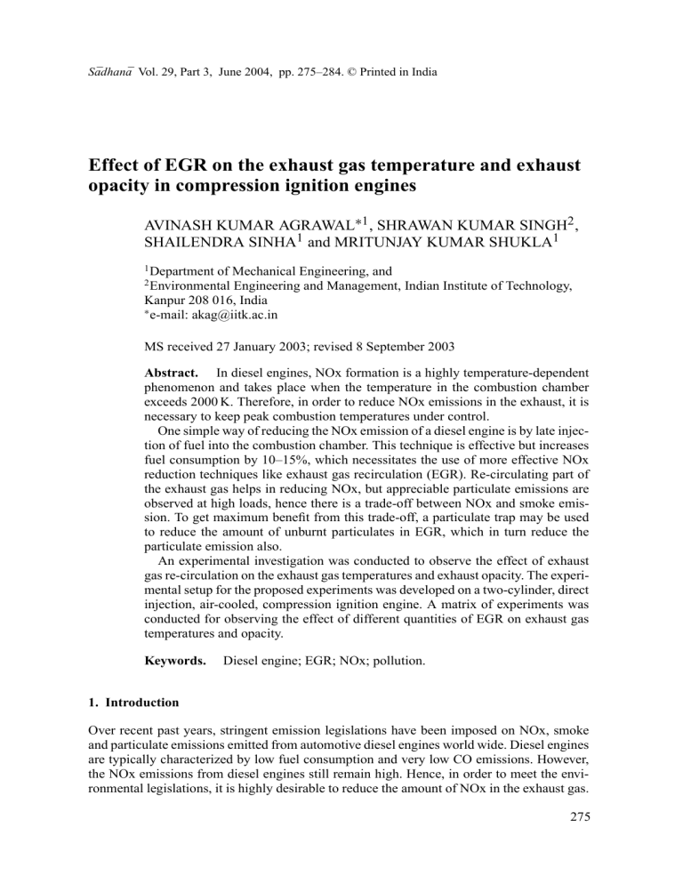 Sādhanā Vol. 29, Part 3, June 2004, pp. 275–284. © Printed in India Effect of EGR on the exhaust gas temperature and exhaust opacity in compression ignition engines AVINASH KUMAR AGRAWAL∗1 , SHRAWAN KUMAR SINGH2 , SHAILENDRA SINHA1 and MRITUNJAY KUMAR SHUKLA1 1 Department of Mechanical Engineering, and Environmental Engineering and Management, Indian Institute of Technology, Kanpur 208 016, India ∗ e-mail: akag@iitk.ac.in 2 MS received 27 January 2003; revised 8 September 2003 Abstract. In diesel engines, NOx formation is a highly temperature-dependent phenomenon and takes place when the temperature in the combustion chamber exceeds 2000 K. Therefore, in order to reduce NOx emissions in the exhaust, it is necessary to keep peak combustion temperatures under control. One simple way of reducing the NOx emission of a diesel engine is by late injection of fuel into the combustion chamber. This technique is effective but increases fuel consumption by 10–15%, which necessitates the use of more effective NOx reduction techniques like exhaust gas recirculation (EGR). Re-circulating part of the exhaust gas helps in reducing NOx, but appreciable particulate emissions are observed at high loads, hence there is a trade-off between NOx and smoke emission. To get maximum benefit from this trade-off, a particulate trap may be used to reduce the amount of unburnt particulates in EGR, which in turn reduce the particulate emission also. An experimental investigation was conducted to observe the effect of exhaust gas re-circulation on the exhaust gas temperatures and exhaust opacity. The experimental setup for the proposed experiments was developed on a two-cylinder, direct injection, air-cooled, compression ignition engine. A matrix of experiments was conducted for observing the effect of different quantities of EGR on exhaust gas temperatures and opacity. Keywords. Diesel engine; EGR; NOx; pollution. 1. Introduction Over recent past years, stringent emission legislations have been imposed on NOx, smoke and particulate emissions emitted from automotive diesel engines world wide. Diesel engines are typically characterized by low fuel consumption and very low CO emissions. However, the NOx emissions from diesel engines still remain high. Hence, in order to meet the environmental legislations, it is highly desirable to reduce the amount of NOx in the exhaust gas. 275 276 Avinash Kumar Agrawal et al Diesel engines are predominantly used to drive tractors, heavy lorries and trucks. Owing to their low fuel consumption, they have become increasingly attractive for smaller lorries and passenger cars also. But higher NOx emissions from diesel engine remain a major problem in the pollution aspect. For reducing vehicular emissions, baseline technologies are being used which include direct injection, turbo-charging, air-to-air inter-cooling, combustion optimization with and without swirl support, multi-valve cylinder head, advanced high pressure injection system i.e. split injection or rate shaping, electronic management system, lube oil consumption control etc. However, technologies like exhaust gas recirculation (EGR), soot traps and exhaust gas aftertreatment are essential to cater to the challenges posed by increasingly stringent environmental emission legislations. 1.1 Mechanism of NOx formation A major hurdle in understanding the mechanism of formation and controlling its emission is that combustion is highly heterogeneous and transient in diesel engines. While NO and NO2 are lumped together as NOx, there are some distinctive differences between these two pollutants. NO is a colourless and odourless gas, while NO2 is a reddishbrown gas with pungent odour. Both gases are considered toxic, but NO2 has a level of toxicity 5 times greater than that of NO. Although NO2 is largely formed from oxidation of NO, attention has been given on how NO can be controlled before and after combustion (Levendis et al 1994). NO is formed during the post flame combustion process in a high temperature region. The most widely accepted mechanism was suggested by Zeldovich (Heywood 1988). The principal source of NO formation is the oxidation of the nitrogen present in atmospheric air. The nitric oxide formation chain reactions are initiated by atomic oxygen, which forms from the dissociation of oxygen molecules at the high temperatures reached during the combustion process. The principal reactions governing the formation of NO from molecular nitrogen are, N2 + O → NO + N, N + O2 → NO + O, N + OH → NO + H. Chemical equilibrium consideration indicates that for burnt gases at typical flame temperatures, NO2 /NO ratios should be negligibly small. While experimental data show that this is true for spark ignition engines, in diesels, NO2 can be 10 to 30% of total exhaust emissions of oxides of nitrogen. A plausible mechanism for the persistence of NO2 is as follows. NO formed in the flame zone can be rapidly converted to NO2 via reactions such as NO + HO2 → NO2 + OH. Subsequently, conversion of this NO2 to NO occurs via NO2 + O → NO + O2 , unless the NO2 formed in the flame is quenched by mixing with cooler fluid. This explanation is consistent with the highest NO2 /NO ratio occurring at high load in diesels, when cooler regions which could quench the conversion back to NO are widespread wood 1988). Exhaust gas recirculation in CI engines 277 The local atomic oxygen concentration depends on molecular oxygen concentration as well as local temperatures. Formation of NOx is almost absent at temperatures below 2000 K. Hence any technique, that can keep the instantaneous local temperature in the combustion chamber below 2000 K, will be able to reduce NOx formation. 2. EGR technique for NOx reduction EGR is a useful technique for reducing NOx formation in the combustion chamber. Exhaust consists of CO2 , N2 and water vapours mainly. When a part of this exhaust gas is re-circulated to the cylinder, it acts as diluent to the com
