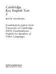 Cambridge Key English Test 2 WITH ANSWERS Examination papers from University of Cambridge ESOL Examinations: English for Speakers of Other Languages PUBLISHED BY THE PRESS SYNDICATE OF THE UNIVERSITY OF CAMBRIDGE The Pitt Building, Trumpington Street, Cambridge, United Kingdom CAMBRIDGE UNIVERSITY PRESS The Edinburgh Building, Cambridge CB2 2RU, UK 40 West 20th Street, New York, NY 10011–4211, USA 477 Williamstown Road, Port Melbourne, VIC 3207, Australia Ruiz de Alarcón 13, 28014 Madrid, Spain Dock House, The Waterfront, Cape Town 8001, South Africa http://www.cambridge.org © Cambridge University Press 2003 This book is in copyright, which normally means that no reproduction of any part may take place without the written permission of Cambridge University Press. The copying of certain parts of it by individuals for use within the classroom, however, is permitted without such formality. Pages which are copiable without further permission are identified by a separate copyright notice: © UCLES K&J Photocopiable First published 2001 New edition 2003 Printed in the United Kingdom at the University Press, Cambridge Typeface: Helvetica 10/13 System: QuarkXPress® [OD&I] A catalogue record for this book is available from the British Library ISBN ISBN ISBN ISBN ISBN 0 0 0 0 0 521 521 521 521 521 52813 52812 52814 52815 52816 5 Student’s Book with answers 7 Student’s Book 3 Teacher’s Book 1 Cassette X Set of 2 Audio CDs Contents To the student 1 Test 1 Paper 1 Paper 2 Paper 3 2 13 19 Test 2 Paper 1 Paper 2 Paper 3 20 31 37 Test 3 Paper 1 Paper 2 Paper 3 38 49 55 Test 4 Paper 1 Paper 2 Paper 3 56 67 73 Visual materials for Paper 3 Test Test Test Test 1 2 3 4 Key Key Key Key Sample answer sheets 74 82 90 98 106 114 Acknowledgements The publishers are grateful for permission to reproduce copyright material. It has not always been possible to identify the sources of all the material used, and in such cases the publishers would welcome information from the copyright owners. Illustrations by Chartwell Illustrators. Design concept by Peter Ducker MSTD Cover design by Dunne & Scully The cassette/CDs which accompany this book were recorded at Studio AVP, London. To the student This book is for students preparing for University of Cambridge ESOL Examinations Key English Test (KET). It contains four complete tests based on the new test format from March 2004. What is KET? KET is an examination for speakers of other languages studying English. It tests Reading, Writing, Listening and Speaking. The KET examination is at Cambridge Level One (Council of Europe Level A2). Paper 1 1 hour 10 minutes Reading and Writing 9 parts 50% of total marks Paper 2 approx 30 minutes Listening 5 parts 25% of total marks Paper 3 8–10 minutes Speaking 2 parts 25% of total marks How do I prepare for KET? It is important to know what type of questions are in the KET examination. Doing the tests in this book will help you. Practise putting your answers on the sample answer sheets on pages 82–84 (you may photocopy these pages). This will help you to understand what you have to do in the real test. Reading: Read some books in simple English from your library or local bookshop. Try to guess the words you don’t know before you use a dictionary to check them. Also, use an English learner’s dictionary when you study. If you live in a tourist area, there may be some signs or notices in English outside restaurants and shops or in railway stations and airports. Read these and try to understand them. Writing: Write short letters or messages in English to a friend who is learning English with you or find an English-speaking pen-friend/e-friend to write to. Write about your daily life (your home, work or school and your family). If you go on holiday, write postcards in English and send them to your English-speaking friends. Listening: Listen to the cassettes or CDs that come with English coursebooks so you can hear different people speaking English. Watch English-language programmes on television and listen to English on the radio if possible. Speaking: Talk in English with friends who are studying with you. Ask each other questions about your daily lives, your future plans and about other towns, countries or places you have visited. We hope this book helps you when you take the KET examination. Good luck! 1 Test 1 PAPER 1 READING AND WRITING (1 hour 10 minutes) PART 1 QUESTIONS 1–5 Which notice (A–H) says this (1–5)? For questions 1–5, mark the correct letter A–H on the answer sheet. EXAMPLE 0 ANSWER This is broken. C 1 Children pay less than adults here. A 2 Be careful because this will burn. B 3 We don’t want any money yet. C D 4 5 Things are cheaper here. You must pay with cash. E FIRE DOOR KEEP CLOSED LIFT NOT WORKING TOY SHOP NOW OPEN BUY NOW PAY NEXT YEAR! F Keep this nightdress away from fire! G We do not take cheques or credit cards. H 2 SUMMER SALE LOW PRICES IN ALL DEPARTMENTS Under 12s HALF PRICE Paper 1: Reading and Writing PART 2 QUESTIONS 6–10 Read the sentences (6–10) about going to the zoo. Choose the best word (A, B or C) for each space. For questions 6–10, mark A, B or C on the answer sheet. EXAMPLE 0 On Sunday, Tim A 6 meat 10 woke C B lunch C He high .................................. B important C B went .................................. . dish He took a bus to the zoo and got off outside the A 9 B up early because he was going to the zoo. He put some biscuits and an apple in a bag for his A 8 .................................. stood A 7 ANSWER .................................. entrance. main at the monkeys eating some bananas. enjoyed B watched C laughed The lions were sleeping under a tree because it was very A hot Tim .................................. A put B tired C .................................. . full some photos of the elephants. B took C made 3 Test 1 PART 3 QUESTIONS 11–15 Complete the five conversations. For questions 11–15, mark A, B or C on the answer sheet. EXAM