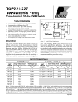 ® TOP221-227 ® TOPSwitch-II Family Three-terminal Off-line PWM Switch Product Highlights • • • • • • • • • • Lowest cost, lowest component count switcher solution Cost competitive with linears above 5W Very low AC/DC losses – up to 90% efficiency Built-in Auto-restart and Current limiting Latching Thermal shutdown for system level protection Implements Flyback, Forward, Boost or Buck topology Works with primary or opto feedback Stable in discontinuous or continuous conduction mode Source connected tab for low EMI Circuit simplicity and Design Tools reduce time to market AC IN D CONTROL TOPSwitch C S PI-1951-091996 Description Figure 1. Typical Flyback Application. The second generation TOPSwitch-II family is more cost effective and provides several enhancements over the first generation TOPSwitch family. The TOPSwitch-II family extends the power range from 100W to 150W for 100/115/230 VAC input and from 50W to 90W for 85-265 VAC universal input. This brings TOPSwitch technology advantages to many new applications, i.e. TV, Monitor, Audio amplifiers, etc. Many significant circuit enhancements that reduce the sensitivity to board layout and line transients now make the design even easier. The standard 8L PDIP package option reduces cost in lower power, high efficiency applications. The internal lead frame of this package uses six of its pins to transfer heat from the chip directly to the board, eliminating the cost of a heat sink. TOPSwitch incorporates all functions necessary for a switched mode control system into a three terminal monolithic IC: power MOSFET, PWM controller, high voltage start up circuit, loop compensation and fault protection circuitry. OUTPUT POWER TABLE TO-220 (Y) Package1 Input 3 Single Voltage PART 100/115/230 VAC ±15% ORDER 4,6 P NUMBER MAX PMAX4,6 8L PDIP (P) or 8L SMD (G) Package2 Single Voltage. Input 3 Wide Range Input PART 100/115/230 VAC ±15% 85 to 265 VAC ORDER 5,6 P PMAX5,6 NUMBER MAX Wide Range Input 85 to 265 VAC TOP221Y 12 W 7W TOP221P or TOP221G 9W 6W TOP222Y 25 W 15 W TOP222P or TOP222G 15 W 10 W TOP223Y 50 W 30 W TOP223P or TOP223G 25 W 15 W TOP224Y 75 W 45 W TOP224P or TOP224G 30 W 20 W TOP225Y 100 W 60 W TOP226Y 125 W 75 W TOP227Y 150 W 90 W Notes: 1. Package outline: TO-220/3 2. Package Outline: DIP-8 or SMD-8 3. 100/115 VAC with doubler input 4. Assumes appropriate heat sinking to keep the maximum TOPSwitch junction temperature below 100 °C. 5. Soldered to 1 sq. in.( 6.45 cm2), 2 oz. copper clad (610 gm/m2) 6. PMAX is the maximum practical continuous power output level for conditions shown. The continuous power capability in a given application depends on thermal environment, transformer design, efficiency required, minimum specified input voltage, input storage capacitance, etc. 7. Refer to key application considerations section when using TOPSwitch-II in an existing TOPSwitch design. July 2001 TOP221-227 VC 0 CONTROL DRAIN ZC SHUTDOWN/ AUTO-RESTART SHUNT REGULATOR/ ERROR AMPLIFIER + + 1 5.7 V 4.7 V INTERNAL SUPPLY ÷8 - 5.7 V + - IFB THERMAL SHUTDOWN POWER-UP RESET S Q R Q VI LIMIT CONTROLLED TURN-ON GATE DRIVER OSCILLATOR DMAX CLOCK SAW - S Q + R Q LEADING EDGE BLANKING PWM COMPARATOR MINIMUM ON-TIME DELAY RE SOURCE PI-1935-091696 Figure 2. Functional Block Diagram. Pin Functional Description DRAIN Pin: Output MOSFET drain connection. Provides internal bias current during start-up operation via an internal switched highvoltage current source. Internal current sense point. Tab Internally Connected to SOURCE Pin DRAIN SOURCE CONTROL Pin: Error amplifier and feedback current input pin for duty cycle control. Internal shunt regulator connection to provide internal bias current during normal operation. It is also used as the connection point for the supply bypass and auto-restart/ compensation capacitor. SOURCE Pin: Y package – Output MOSFET source connection for high voltage power return. Primary side circuit common and reference point. P and G package – Primary side control circuit common and reference point. SOURCE (HV RTN) Pin: (P and G package only) Output MOSFET source connection for high voltage power return. 2 D 7/01 CONTROL Y Package (TO-220/3) SOURCE 1 8 SOURCE (HV RTN) SOURCE 2 7 SOURCE (HV RTN) SOURCE 3 6 SOURCE (HV RTN) CONTROL 4 5 DRAIN P Package (DIP-8) G Package (SMD-8) Figure 3. Pin Configuration. PI-2084-040401 TOP221-227 TOPSwitch-II Family Functional Description TOPSwitch is a self biased and protected linear control currentto-duty cycle converter with an open drain output. High efficiency is achieved through the use of CMOS and integration of the maximum number of functions possible. CMOS process significantly reduces bias currents as compared to bipolar or discrete solutions. Integration eliminates external power resistors used for current sensing and/or supplying initial startup bias current. Auto-restart Duty Cycle (%) Slope = PWM Gain During normal operation, the duty cycle of the internal output MOSFET decreases linearly with increasing CONTROL pin current as shown in Figure 4. To implement all the required control, bias, and protection functions, the DRAIN and CONTROL pins each perform several functions as described below. Refer to Figure 2 for a block diagram and to Figure 6 for timing and voltage waveforms of the TOPSwitch integrated circuit. VC 5.7 V 4.7 V IB DMAX DMIN ICD1 2.0 6.0 IC (mA) PI-2040-050197 Figure 4. Relationship of Duty Cycle to CONTROL Pin Current. IC Charging CT 0 DRAIN VIN Off 0 Switching (a) VC ICD2 Discharging CT ICD1 Discharging CT IC Charging CT 5.7 V 4.7 V 8 Cycles 0 95% DRAIN VIN Off 5% Off Off 0 Switching Switching (b) CT is the total external capacitance connected to the CONTROL pin PI-1956-092496 Figure 5. Start-up Waveforms for (a) Normal Operation and (b) Auto-restart. D 7/01 3 TOP221-227 TOPSwitch-II Family Functional Description (cont.) Control Voltage Supply CONTROL pin voltage VC is the supply or bias voltage for the controller and driver circuitry. An exte