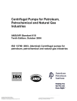 Centrifugal Pumps for Petroleum, Petrochemical and Natural Gas Industries ANSI/API Standard 610 Tenth Edition, October 2004 ISO 13709: 2003, (Identical) Centrifugal pumps for petroleum, petrochemical and natural gas industries --``,`,``,`,,````,,```,`,,,``,`-`-`,,`,,`,`,,`--- Copyright American Petroleum Institute Reproduced by IHS under license with API No reproduction or networking permitted without license from IHS Licensee=Shell Services International B.V./5924979112 Not for Resale, 12/13/2004 23:15:50 MST --``,`,``,`,,````,,```,`,,,``,`-`-`,,`,,`,`,,`--- Copyright American Petroleum Institute Reproduced by IHS under license with API No reproduction or networking permitted without license from IHS Licensee=Shell Services International B.V./5924979112 Not for Resale, 12/13/2004 23:15:50 MST Special Notes API publications necessarily address problems of a general nature. With respect to particular circumstances, local, state, and federal laws and regulations should be reviewed. --``,`,``,`,,````,,```,`,,,``,`-`-`,,`,,`,`,,`--- API is not undertaking to meet the duties of employers, manufacturers, or suppliers to warn and properly train and equip their employees, and others exposed, concerning health and safety risks and precautions, nor undertaking their obligations under local, state, or federal laws. Information concerning safety and health risks and proper precautions with respect to particular materials and conditions should be obtained from the employer, the manufacturer or supplier of that material, or the material safety data sheet. Nothing contained in any API publication is to be construed as granting any right, by implication or otherwise, for the manufacture, sale, or use of any method, apparatus, or product covered by letters patent. Neither should anything contained in the publication be construed as insuring anyone against liability for infringement of letters patent. Generally, API standards are reviewed and revised, reaffirmed, or withdrawn at least every five years. Sometimes a one-time extension of up to two years will be added to this review cycle. This publication will no longer be in effect five years after its publication date as an operative API standard or, where an extension has been granted, upon republication. Status of the publication can be ascertained from the API Standards department telephone (202) 682-8000. A catalog of API publications, programs and services is published annually and updated biannually by API, and available through Global Engineering Documents, 15 Inverness Way East, M/S C303B, Englewood, CO 80112-5776. This document was produced under API standardization procedures that ensure appropriate notification and participation in the developmental process and is designated as an API standard. Questions concerning the interpretation of the content of this standard or comments and questions concerning the procedures under which this standard was developed should be directed in writing to the Director of the Standards department, American Petroleum Institute, 1220 L Street, N.W., Washington, D.C. 20005. Requests for permission to reproduce or translate all or any part of the material published herein should be addressed to the Director, Business Services. API standards are published to facilitate the broad availability of proven, sound engineering and operating practices. These standards are not intended to obviate the need for applying sound engineering judgment regarding when and where these standards should be utilized. The formulation and publication of API standards is not intended in any way to inhibit anyone from using any other practices. Any manufacturer marking equipment or materials in conformance with the marking requirements of an API standard is solely responsible for complying with all the applicable requirements of that standard. API does not represent, warrant, or guarantee that such products do in fact conform to the applicable API standard. All rights reserved. No part of this work may be reproduced, stored in a retrieval system, or transmitted by any means, electronic, mechanical, photocopying, recording, or otherwise, without prior written permission from the publisher. Contact the Publisher, API Publishing Services, 1220 L Street, N.W., Washington, D.C. 20005. Copyright © 2004 American Petroleum Institute Copyright American Petroleum Institute Reproduced by IHS under license with API No reproduction or networking permitted without license from IHS Licensee=Shell Services International B.V./5924979112 Not for Resale, 12/13/2004 23:15:50 MST API Standard 610 / ISO 13709 API Foreword API publications may be used by anyone desiring to do so. Every effort has been made by the Institute to assure the accuracy and reliability of the data contained in them; however, the Institute makes no representation, warranty, or guarantee in connection with this publication and hereby expressly disclaims any liability or responsibility for loss or damage resulting from its use or for the violation of any federal, state, or municipal regulation with which this publication may conflict. --``,`,``,`,,````,,```,`,,,``,`-`-`,,`,,`,`,,`--- Suggested revisions are invited and should be submitted to API, Standards department, 1220 L Street, NW, Washington, DC 20005, standards@api.org. Copyright American Petroleum Institute Reproduced by IHS under license with API No reproduction or networking permitted without license from IHS Services International B.V./5924979112 iiLicensee=Shell Not for Resale, 12/13/2004 23:15:50 MST API Standard 610 / ISO 13709 Contents Page API Foreword .......................................................................................................................................................... ii Foreword ................................................................................................................................................................. v 1 Scope ..........................................
