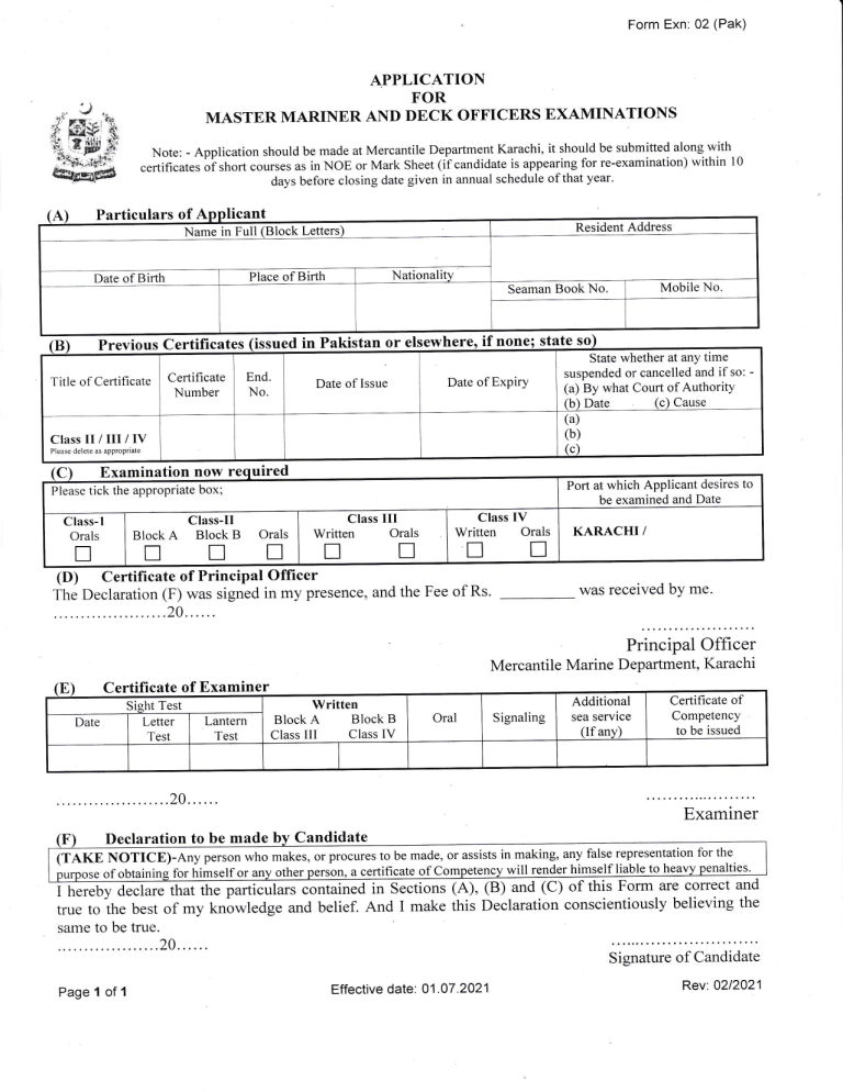 Note: - Application should be made at Mercantile Department Karachi, it should be submitted along