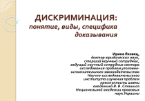 ДИСКРИМИНАЦИЯ: понятие, виды, специфика доказывания Ирина Яковец, доктор юридических наук, старший научный сотрудник, ведущий научный сотрудник сектора исследования проблем уголовноисполнительного законодательства Научно-исследовательского института изучения проблем преступности имени академика В. В. Сташиса Национальной академии правовых наук Украины Определение дискриминации (предварительные замечания) ст. 26 Международного пакта о гражданских и политических правах 1966 года закрепила право каждого без всякой дискриминации на равную защиту закона и установила, что закон должен гарантировать всем лицам равную и эффективную защиту против дискриминации по какому бы то ни было признаку. Определение дискриминации (предварительные замечания) •Дискриминация есть нарушение принципа равенства; •Основанием дискриминации выступает какаялибо персональная (личностная) характеристика (возраст, пол, язык, цвет кожи, этническая принадлежность и т.д.); •Нарушение принципа равенства заключается в том, что к человеку относятся не как к личности, а как к представителю группы (пожилые, женщины, чернокожие, «лица кавказской национальности» и т.д.); •Дискриминация косвенной. может быть прямой и Определение дискриминации (предварительные замечания) Дискриминация – это любое различие, исключение, ограничение или предпочтение, основанное на признаках расы, языка, религии, пола, социального происхождения, места рождения, возраста, инвалидности или других юридически несущественных признаках, имеющее целью или следствием уничтожение или умаление признания, использования или осуществления на равных началах прав человека и основных свобод в политической, экономической, социальной, культурной или любых других областях общественной жизни. Определение дискриминации Прямая дискриминация на основании какого-либо признака имеет место, если установлено -менее благоприятное обращение по отношению к одному лицу, в сравнении с другим -в сопоставимой ситуации -без рационального или объективного обоснования. Косвенная дискриминация имеет место, если -внешне нейтральное условие, критерий или практика -ставят лицо в особо невыгодное положение по сравнению с другими лицами, -если только данные условие, критерий или практика объективно не оправданы законной целью, и средства достижения этой цели не являются адекватными и необходимыми. Определение дискриминации Дискриминация имеет место, если целью или результатом обращения или применения меры является унижение достоинства человека и создание напряженной, враждебной, пренебрежительной, унизительной или оскорбительной атмосферы. Определение дискриминации Любая дискриминация есть различие, но не любое различие носит дискриминационный характер Доказывание дискриминации: критерии (тесты) различие в обращении с разными лицами имеет место; в результате такого обращения одно лицо оказывается в менее выгодном положении, чем другое; обстоятельства, в которых находятся указанные лица сопоставимы (не отличаются по сути); единственным основанием различия в обращении выступает какая-либо из указанных характеристик (или совокупность таких характеристик); отсутствует объективное или разумное основание для существования такого различия - оно не преследует законной цели, либо - между мерами и ц