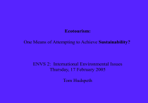Ecotourism: One Means of Attempting to Achieve Sustainability? ENVS 2: International Environmental Issues Thursday, 17 February 2005 Tom Hudspeth The World Commission on Environment and Development (Brundtland Commission) in Our Common Future (l987) offered a definition of sustainability: “...to meet the needs of the present without compromising the ability of future generations to meet their own needs.” Ecotourism Technology transfer and diffusion of innovation from Global South to Global North Much to learn and draw from success stories in developing countries “Nature tourism involves travel to unspoiled places to experience and enjoy nature. It usually involves moderate and safe forms of exercise such as hiking, biking, sailing, and camping. “Wildlife tourism involves travel to observe animals (sic), birds, and fish in their native habitats. “Adventure tourism is nature tourism with a kick: it requires physical skill and endurance (rope-climbing, deep-sea diving, bicycling, or kayaking) and involves a degree of risk-taking, often in little-chartered terrain. Ecotourism Defined by its benefits to both conservation and people in the host country, as well by the recreational activities of the tourist More than travel to enjoy or appreciate nature Goes further than nature tourism, by striving to respect and benefit protected areas as well as the people living around or on these lands Definition of Ecotourism: “Responsible travel to natural areas that conserves the environment and improves the well-being of local people.” -The International Ecotourism Society or TIES (2003) Definition of Ecotourism: “Ecotourism is travel to fragile, pristine, and usually protected areas that strives to be low impact and (usually) small scale. It helps educate the traveler; provides funds for conservation; directly benefits the economic development and political empowerment of local communities; and fosters respect for different cultures and for human rights.” -Honey (1999, p. 25) Characteristics of Genuine or Authentic Ecotourism: 1. 2. 3. 4. Involves travel to natural destinations Minimizes impact Builds environmental awareness Provides direct financial benefits for conservation 5. Provides financial benefits and empowerment for local people 6. Respects local culture 7. Supports human rights and democratic movements.” -Honey, 1999, p. 22-24 Standards that Characterize Ecotourism: 1. Tourism activity in relatively undisturbed natural settings 2. Minimal negative impacts on the environment 3. Conservation of natural and cultural heritage 4. Active involvement with and benefit to local community 5. Tourism-generated profits contribute to sustainable development 6. Educational experience for visitors that incorporates both natural and cultural heritage -Ceballos-Lascuráin Guiding Principles for Ecotourism: 1. Tourist activiti es must not degrade the resource 2. Visitors should be offered educational first-hand experiences 3. All stakeholders (host community, gove rnment, non-governmental organizations, industry, and tourists) must be involv ed 4. Tourism must respect the intrin sic value of natural resources 5. Tourism cannot overtax the resource supplies of the local region 6. Stakeholders must be encouraged to develop partnership s 7. Tourist revenue must provide conservation, scientifi c, or cultur al benefits to the resource, local community, and industry as a whole 8. These benefits must be long-t erm. -Pam Wight (1993) Problems with Conventional Mass Tourism (which has become synonymous with the four S’s: sun, sea, sand, and sex): High infrastructure costs Overdevelopment and uneven development Adverse social effects, invasion by culturally insensitive and economically disruptive foreigners Adverse environmental effects, pollution Meager economic benefits because of leakage, whereby most of the profits do not stay in the host countries Negative Sides of Conventional Tourism's Economic Boom: Often the only benefit to the local community is found in lowpaying, menial service-level employment as maids, waiters, and drivers In most all-inclusive package tours, more than 80 percent of travelers' fees go to the airlines, hotels and other international companies, not to local businesses or workers. Large hotel chain restaurants often import food products to satisfy foreign visitors and rarely employ local staff for senior management positions, preventing local farmers and workers from reaping the benefit of their presence. Resorts and hotels often over-consume natural resources like water and power, forcing utility prices up and causing blackouts and water shortages for locals. Negative Sides of Conventional Tourism's Economic Boom (continued): Hotel shops often import or buy mass-produced gift items instead of those produced by local craftspeople and artisans. Many tourists never leave the hotel grounds or cruise ship, reducing the possibility of tourist income for local businesses. Faced with limited economic prospects, locals lose the incentive to preserve and conserve their natural and cultural resources.” -Honey (1999, p. 9), TIES (2003) Evolution of Ecotourism 1. Scientific, conservation, and nongovernmental organization circles 2. Multilateral aid institutions 3. Developing countries 4. The travel industry and traveling public Tourism Since the 1990’s, vies with oil as the world’s largest legitimate business. Worldwide, tourism generates annual revenues of nearly 3 trillion dollars and contributes nearly 11% of the global GNP, making it the world's largest industry. World’s number one employer, accounting for 10 per cent of jobs globally. Tourism Ecotourism has become the most rapidly growing and most dynamic sector of the tourism market. 1. >one-third of the U.S. traveling public had taken at least one ecotour by the mid-1990’s. 2. Prior to September 11, ecotourism grew by 30 per cent annual increase, compared to a 4 percent growth rate in the U.S. travel industry. Fact