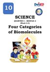 SCIENCE QUARTER 4 – MODULE 2 (Week 3-4) Four Categories of Biomolecules 1 What I Need to Know Food is one of the basic needs of living organisms. Different types of food give us different nutrients. For instance, grains provide carbohydrates for energy; egg gives proteins for growth and repair and so on. These compounds belong to the four main categories of biomolecules; carbohydrates, proteins, lipids and nucleic acids. This module will provide you with information and simple activities that will help you understand the four main categories of biomolecules. After going through this module, you are expected to: 1. identify the major categories of biomolecules such as carbohydrates, lipids, proteins and nucleic acids (S10MT-IVc-d-22) 2. differentiate the biomolecules from each other in terms of their structure and function; 3. recognize the importance of the four categories of molecules in our body What I Know Directions: Read each item carefully. Write only the letter of the correct answer for each question. Use a separate sheet for your answers. 1. Which is NOT a major source of protein? 2. 3. 4. 5. 6. 7. A. egg C. milk B. fish D. vegetable The most abundant monosaccharide in nature is . A. glucose C. maltose B. lactose D. sucrose Cholesterol is a/an . A. essential oil C. steroid B. saturated fat D. unsaturated fat Which has the most lipids? A. banana C. cheese B. champorado D. olive oil Which is a polysaccharide? A. glycogen C. fructose B. glucose D. lactose DNA is unique among molecules because it can . A. replicate itself B. come apart and reform C. form multiple polymer complex D. withstand very high temperatures These are the major constituent of the plasma membrane. A. Fats C. Phospholipids B. Oils D. Steroids 2 8. These are produced by the living cells that serve as catalyst in biochemical reactions. 9. 10. 11. 12. 13. 14. 15. A. amino acids C. hormones B. enzymes D. polypeptide The monomers that make up proteins are . A. amino acids C. glucose B. fatty acids D. nucleotides These are chemical signaling molecules secreted by the endocrine glands. A. amino acid C. hormones B. enzymes D. nucleic acid These are macromolecules that are the key in the continuity of life. A. Carbohydrates C. Nucleic acids B. Lipids D. Proteins These are the monomers of nucleic acids. A. DNA C. Polynucleotide B. Nucleotide D. RNA Cellulose and starch are examples of . A. Disaccharide C. Oligosaccharide B. Monosaccharide D. Polysaccharide How many amino acids are there? A. 20 B. 21 C. 22 D. 23 Which polysaccharide is stored in the liver and the muscles? A. Chitin B. Cellulose C. Glycogen D. Starches 3 Lesson 1 Four Categories of Biomolecules What’s In Directions: Find all the hidden BIOMOLECULE words in the word search puzzle below. Words can be spelled forward, backward, downward and upward. The keywords are listed in the pool of words written after the puzzle. Amino Acid Carbohydrates Cellulose Cholesterol Deoxyribonucleic acid Enzyme Glucose Hormones Lipids Monosaccharide Nucleic acids Nucleotides Phospholipids Proteins Steroid What’s New Carbohydrates, lipids, proteins and nucleic acids are the four main categories of biomolecules. These macromolecules are composed of smaller components called monomers. 4 Activity 1: Biomolecule Building Blocks Below is a graphic organizer. Write on each column the different building blocks or monomers of each biomolecules. Choose from the pool of words below. Amino acids Fatty acids CARBOHYDRATES Glucose PROTEINS LIPIDS Nucleotides NUCLEIC ACIDS What is It Biomolecules are the most essential organic molecules, which are involved in the maintenance and metabolic processes of living organisms. These non-living molecules are the actual foot-soldiers of the battle of sustenance of life. They range from small molecules such as primary and secondary metabolites and hormones to large macromolecules like proteins, nucleic acids, carbohydrates and lipids. Carbohydrates Carbohydrates are an essential part of our diet; grains, fruits, and vegetables are all natural sources of carbohydrates. Carbohydrates provide energy to the body, particularly through glucose, a simple sugar. Carbohydrates also have other important functions in humans, animals, and plants. Carbohydrates can be represented by the formula (CH2O)n, where n is the number of carbon atoms in the molecule. In other words, the ratio of carbon to hydrogen to oxygen is 1:2:1 in carbohydrate molecules. Carbohydrates are classified into three subtypes: monosaccharides, disaccharides, and polysaccharides. Monosaccharides are simple sugars, examples are glucose, which is the most abundant, galactose (part of lactose, a milk sugar) and fructose (found in fruit). Disaccharides form when two monosaccharides undergo a dehydration reaction (a reaction in which the removal of a water molecule occurs). Common disaccharides include lactose (found in milk, composed of galactose and glucose), maltose (malt sugar), and sucrose (table sugar, composed of glucose and fructose). A long chain of monosaccharides linked by 5 Figure 1: Glucose, galactose, and fructose have the same chemical formula but slightly different structures. covalent bonds is known as a polysaccharide. Starch, glycogen, cellulose, and chitin are examples of polysaccharides. Lipids Lipids are insoluble biomolecules, defined by an overall lack of polarity necessary for solubility in water-based solutions. In popular culture, fats are synonymous with lipids, giving lipids a negative role in diet and health. However, lipids play vital roles in many cellular processes including energy storage, structural support, protection, and communication. Common lipid groups include waxes, steroids, fats and oils, and phospholipids. Fats and oils are the most abundant lipids and are also called triglycerides. Triglycerides are lipids that store energy. It is composed of two main components – glycerol and fatty acids. Fatty acids can be saturated or unsaturated. Saturated fats 