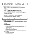 Revised Fall 2012 EXAM REVIEW – CHAPTERS 1, 2, 3 STUDY SUGGESTIONS Review your class notes, homework exercises and problems. Be sure to review any chapter appendicies assigned on the General Course Outline. Review Demonstration Problem, Summary and Key Terms at the end of each chapter. Answer the Multiple Choice Quiz at the end of each chapter. Answer Multiple Choice Quiz A and B on the textbook website www.mhhe.com/wild . Know accounting terms and concepts by answering the Discussion Questions at the end of each chapter. Know the account classification (i.e. asset, liability, or owner's equity) and normal balance of all accounts. Know what the financial ratios mean and how to calculate them. Other online help is available ay a variety of sites such as: Key Terms and Concepts to Know Chapter 1 – Accounting in Business Accounting equation and its three basic elements: assets, liabilities and owners equity How business transactions affect the three basic elements in the accounting equation. Income Statement: o The types of accounts used o Prepare an income statement o Calculate net income without preparing an income statement using the accounting equation Retained Earnings Statement: o The types of accounts used o Prepare a retained earnings statement o Retained Earnings Statement links the income statement and dividends to the balance sheet Balance Sheet o The types of accounts used o Prepare a balance sheet Page 1 of 29 Revised Fall 2012 Chapter 2 – Accounting for Transactions Journal and Ledger o A journal and what it is used for. o A ledger and what it is used for. o Why both a journal and a ledger are necessary o A chart of accounts and what it is used for. The rules of Debit and Credit: o Debit is the left side of an account and Credit is the right side of an account o Normal balances of accounts and how debits and credits increase or decrease account balances Increase Decrease Normal Balance Balance Sheet Accounts Assets Debit Debit Credit Liabilities Credit Credit Debit Owners’ Equity Credit Credit Debit Capital Stock Credit Credit Debit Retained Earnings Credit Credit Debit Dividends Credit Credit Debit Income Statement Accounts Revenue Credit Credit Debit Expenses Debit Debit Credit Analyzing a general ledger account (T-account) o Use the general equation: beginning balance + inflows – outflows = ending balance. o Remember that the inflows and outflows are renamed for the types of activity in each specific account and that the equation manipulated be used to solve for an unknown as any one of the four terms. Journalize transactions for the various types of transactions. Post transactions from the journal to the general ledger Prepare a trial balance; identify the types of errors a trial balance can and cannot help to locate and how to correct the errors. Chapter 3 – Preparing Financial Statements Matching Principle and how it relates to accrual accounting Deferred Expenses (prepaid expenses) Deferred Revenues (unearned revenues) Accrued Expenses (accrued liabilities) Accrued Revenues (accrued assets) Journalizing adjusting entries for accruals and deferrals which always use at least one income statement account (revenue or expense) and one balance sheet Page 2 of 29 Revised Fall 2012 account (asset or liability). Adjusting entries are never recorded for cash, dividends, capital stock or retained earnings. The effects on the financial statements will be if adjusting entries are omitted. Journalizing the four closing entries utilizing the Income Summary account. The basic steps in the accounting cycle. Prepare a post-closing trial balance, which accounts should and should not appear on it and why it is a necessary step in the accounting cycle. Practice Problems Problem 1 - Accounting Equation James Morley is the sole stockholder and operator of Dynamic Business Solutions, Inc. a management consulting firm organized as a professional corporation. At the end of its accounting period, December 31, 2007, Dynamic Business Solutions has assets of $100,000 and liabilities of $75,000. Determine: a) What is owner's equity at December 31, 2007? b) What is owner's equity as of December 31, 2008, assuming that assets increased by $25,000 and liabilities increased by $15,000 during 2008? c) What is the increase or (decrease) in owner's equity for the year 2008? d) What is the net income (or net loss) for the year 2008 assuming there were no additional investments in 2008 and dividends of $15,000 were paid in 2008. What is owner's equity at December 31, 2007? What is owner's equity as of December 31, 2008, assuming that assets increased by $25,000 and liabilities increased by $15,000 during 2008? What is the increase or (decrease) in owner's equity for the year 2008? What is the net income (or net loss) for the year 2008 assuming there were no additional investments in 2008 and dividends of $15,000 were paid in 2008. Problem 2 - Changes in owner's equity Determine the net income (or net loss) for the year, assuming that additional capital stock of $25,000 was issued, and that no dividends were paid. Beginning of the year End of the year Total Assets $500,000 $625,000 Page 3 of 29 Total Liabilities $200,000 $250,000 Revised Fall 2012 Problem 3 - Changes in owner's equity Determine the net income (or net loss) for the year, assuming that capital stock of $70,000 was issued, and dividends of $45,000 were paid. Beginning of the year End of the year Total Assets $425,000 $440,000 Total Liabilities $165,000 $185,000 Problem 4 - Business transactions Indicate the effect of each of the below transactions on the accounting equation and determine whether the transaction is: 1. 2. 3. 4. 5. an increase in an asset and an increase in a liability an increase in a asset and an increase in owner's equity an increase in an asset and a decrease in another asset a decrease in an asset and a decrease in a liability a decrease in an asset and a decrease in owner's equity Transactions: a) Received cash fo