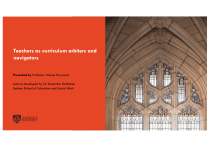 Teachers as curriculum arbiters and navigators Presented by Professor Valerie Harwood Lecture developed by Dr Samantha McMahon Sydney School of Education and Social Work The University of Sydney Page 1 This week we are focusing on: teachers – teaching – curriculum How do we think about this…? How do we think about teachers and curriculum and knowledge? The University of Sydney Page 2 The lecture – – – – Excerpt from the start of the reading What might the simile in the lecture title mean? What you know impacts what you do (and how you teach) Arbitration, navigation and teachers’ knowledge of curriculum – Arbitration, navigation and teachers’ knowledge of learners Two channels of teacher education – content and pedagogic reasoning. The University of Sydney Page 3 The following slide contains an excerpt from the start of this week’s reading by Comber & Kamler (2004). The University of Sydney Page 4 “Well, as I said before, it has a lot to do with work ethic of the parents, and although the Early Years program is very structured and doesn't leave a whole lot of room for teacher error, you're always going to need the support of parents, and if the parents aren't giving as much support, the students won't show it in their work. You know it from class to class. You see groups of children in my class that are doing the best. I've met their parents, they've all come and made themselves very known to me, and just through speaking to them you know what goes on at home and you know that they do have a stronger work ethic and help their kids at home as well. I think that's huge. The parents do need to help. We've got structures in place to teach at school, but then it needs to be backed up at home.” (Marc, cited in Comber and Kamler, 2004, p.298) The University of Sydney Page 5 Teachers as curriculum arbiters and navigators What might the simile in lecture title mean? The University of Sydney Page 6 ARBITER (noun): 1. gen. One whose opinion or decision is authoritative in a matter of debate; a judge. 2. spec. One who is chosen by the two parties in a dispute to arrange or decide the difference between them; an arbitrator, an umpire. 3. One who has power to decide or ordain according to his[sic] own absolute pleasure; one who has a matter under his [sic] sole control. Also fig 4. ǁ arbiter elegantiarum, arbiter elegantiae [Latin, lit. ‘judge of elegance’: Petronius Arbiter was the elegantiae arbiter of Nero's court (Tacitus Ann. xvi. 18)] , a judge of matters of taste, an authority on etiquette. (Oxford Online Dictionary, 2018a) In what way might teachers be considered arbiters of curriculum? The University of Sydney Page 7 NAVIGATOR, n. 1. A person who navigates. a. A sailor, esp. one …responsible for directing the course of a particular vessel. b. a person who plots and directs the course of an aircraft or spacecraft. c. A person who directs the course of a motor vehicle; a person who map-reads for, or gives directions to, the driver of a motor vehicle. 3. Computing. Categories » a. A person who searches large computer databases… b. A program which searches for and locates data about a specified topic from the Internet or other data collection; …any program or device designed to help a user move around an interface, program, etc. (Oxford Online Dictionary, 2018b) Discuss: In what way might teachers be considered navigators of curriculum? The University of Sydney – Page 8 What you know impacts what you do (and how you teach) The University of Sydney Page 9 Trevor Gale, Carmen Mills, Russell Cross This idea of the relationship between knowing and doing is at the centre of educational thinking and practice. In 2017 these three academics released a theoretical paper demonstrating the centrality of knowledge and belief in pedagogic work especially, now. The University of Sydney Page 10 This work by Gale and colleagues affirms that what we believe and know impacts what we do as educators in the community and in the classroom. OUR CHOICES about what and how we teach something craft different learning opportunities and educational experiences for our students. This makes our decisions as educators important ethical and political actions. WAIT – what do we mean by political? One way of thinking about the political is to think about the ‘polis’, the idea of people together, contributing. The idea of the polis is discussed in rich detail by Hannah Arendt. For Arendt (1968) the purpose of the political, “…would be to establish and keep in existence a space where freedom as virtuosity can appear. This is the realm where freedom is a worldly reality, tangible in words which can be heard, in deeds which can be seen, and in events which are talked about, remembered… Whatever occurs in this space of appearances is political by definition...” (p.154–5) The University of Sydney Page 11 349 Gale et al. Figure 1. Elements of Pedagogic Work: belief, design, action. The University of Sydney (Gale et al. 2017, p.349) pedagogy are represented by Figure 1 below and discussed in the sections that follow. Page 12 Attempts to define “good” teaching as the basis to evaluate and improve the professional standards of teachers has gained traction across OECD nations, particularly in the You don’t have to understand in detail this diagram – it is being used to show that educator knowledge and beliefs are at the apex, sitting at the top of the triangle on current theorizations of pedagogical work. This reminds us that whilst examples in this lecture might be specific, the issue is foundational to contemporary educational practice. We use our knowledge and beliefs as chief currency in our work as curriculum arbiters and navigators. The University of Sydney Page 13 Curriculum arbitration, navigation and teachers’ knowledge of curriculum The University of Sydney Page 14 Image caption The University of Sydney Page 15 Building a case for multiple ‘ways of knowing Drawi