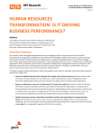 Human&Resources&Transformation:& Is&It&Driving&Business&Performance?& May$2012$ HUMAN&RESOURCES& TRANSFORMATION:&IS&IT&DRIVING& BUSINESS&PERFORMANCE?& Authors& Tony$Filippone,$Executive$Vice$President$of$Research,$HfS$Research$ Diane$Youden,$Principal,$Human$Resources$Transformation,$PwC$ Kevin$Pennington,$Director,$Human$Resources$Transformation,$PwC$ Phil$Fersht,$Chief$Executive$Officer,$HfS$Research$ Executive&Summary& Our$research$shows$that$aggressive$global$expansion$and$changing$workforce$characteristics$have$elevated$the$ importance$of$recruiting,$talent$management,$and$performance$management.$While$some$human$resources$executives$ have$transformed$their$administrativePfocused$organizations$and$regionalized$departments$to$improve$their$strategic$ value$to$their$operational$and$functional$counterparts,$many$organizations$fall$short$of$true$“transformation.”$While$these$ organizations$focus$on$efficiency,$their$business$counterparts’$strategic$talent$management$issues$go$unresolved—with$ significant$opportunity$cost$to$market$growth$and$other$corporate$initiatives.$Following$a$transformation,$does$your$ human$resources$team$focus$more$on$the$business$than$administration?$ This$paper$leverages$extensive$quantitative$research$into$global$trends$as$well$as$interviews$with$senior$human$resources$ and$business$leaders$that:$ » Uncover&the&global&trends&that&have&advanced&the&strategic&role&of&human&resources.$We$share$research$from$ interviews$and$data$collected$from$over$400$human$resources$practitioners$and$over$350$global$business$ executives$identifying$why$human$resources$executives$are$being$asked$to$transform$their$organizations.$ » Expose&soMcalled&human&resources&“transformations”&for&what&they&really&are.$Based$on$a$series$of$interviews$ with$human$resources$executives$who$have$successfully$transformed$their$organizations,$we$explain$why$so$ many$organizations$fail$to$transform$because$they$focus$on$administrative$process$improvements,$resources$put$ in$charge$of$dayPtoPday$process$management$lack$the$skills$and$accountability$to$execute$on$the$vision,$and$ human$resources$leadership$lack$some$of$the$competencies$necessary$to$deliver$value$to$the$business.$ » Identify&how&human&resources&executives&successfully&transform&their&organizations&to&support&business& leaders.$We$identify$the$major$shift$a$human$resources$organization$undergoes$when$it$truly$transforms$its$ capabilities.$We$share$how$leaders$from$these$organizations$break$through$where$others$have$failed$and$include$ a$case&study$from$a$large$global$organization$that$did$it$successfully.$ $ $ $ $ $$$$$$$$$$$$$$$$$$$$$$$$$$$$$$$$$$$$$$$$$$$$$$$$$$$$$$$$$$$$$$$$$$$$$$$$$$$$$$$$$$$$$©$2012,$HfS$Research,$Ltd$|$www.hfsresearch.com$ $ $ $$$$$$$$$$1$ Human&Resources&Transformation:& Is&It&Driving&Business&Performance?& May$2012$ Table&of&Contents& & Unprecedented$Global$Business$Dynamics$Put$HR$in$the$Hot$Seat$ 3! The$Workforce$Environment$Is$Changing$ 3! Human$Resources$Executives$Can$Be$Substantive$Leaders$in$Times$of$Change$ 6! Human$Resources$“Transformations”$Thrust$into$the$Corporate$Spotlight$ 8! Operational$Efficiency$Objectives$Fall$Short$When$It$Comes$to$Transformation$ 8! Global$Solutions$Still$Require$Local$Strategy$to$Be$Effective$ 9! Flexibility$Is$Key:$Achieving$Transformation$Is$Like$Changing$the$Wheels$of$a$Car$While$Driving$ 10! Listen$to$the$Business$Managers:$It$Still$Takes$Two$to$Tango$ 10! Practice$What$You$Preach:$Ensure$Your$Own$Human$Resources$Talent$Is$Leading$Edge$ 11! Make$Transformation$“Real”:$Tie$It$to$Commonly$Understood$Business$Objectives$ 11! When$Transformations$Are$Truly$“Transformational”$ 12! The$Difference$a$Successful$Transformation$Makes$ 12! Eight$Common$Traits$of$Organizations$That$Successfully$Undergo$Transformation$ 13! The$Bottom$Line:$Leaders$Must$Cultivate$the$Talent$within$Human$Resources$to$Make$Transformation$Possible$ 16! About$the$Authors$ 18! About$HfS$Research$ 20! About$PwC$ 20! & & $ $ $ $ $$$$$$$$$$$$$$$$$$$$$$$$$$$$$$$$$$$$$$$$$$$$$$$$$$$$$$$$$$$$$$$$$$$$$$$$$$$$$$$$$$$$$©$2012,$HfS$Research,$Ltd$|$www.hfsresearch.com$ $ $ $$$$$$$$$$2$ Human&Resources&Transformation:& Is&It&Driving&Business&Performance?& May$2012$ Unprecedented&Global&Business&Dynamics&Put&HR&in&the&Hot&Seat& Behind$the$product$design$and$technological$innovations$that$catapult$organizations$into$wellPrespected$industry$leaders$ are$managements’$investments$in$the$assets$that$create$tomorrow:$people.$People$are$the$force$behind$Google’s$rapid$ growth$from$search$engine$leader$to$software$and$service$giant,$with$products$like$AdWords,$Android,$Gmail,$and$Chrome.$ Apple’s$awardPwinning$design$genius$is$overshadowed$by$its$supply$chain$management$discipline,$which$enables$the$ company$to$produce$discretely$and$ship$millions$of$newlyPlaunched$products$to$thirtyPfive$countries$within$days$of$their$ announcement.$Today,$talent$truly$differentiates$firms$and$our$research$shows$that$firms$are$pressured$by$the$ combination$of$shifting$global$economics$and$changing$talent$requirements.$ The&Workforce&Environment&Is&Changing& As$companies$embrace$globalization,$technology,$and$competitive$pressures$(see$“Seven$Global$Trends”$later$in$this$ report),$local$labor$markets$are$rapidly$evolving$and$changing—and$the$skill$shortages$are$pushing$human$resources$into$ the$frontlines$of$acquiring,$developing,$and$retaining$talent.$HfS$Research$surveyed$436$human$resources$executives$to$ understand$the$factors$affecting$companies’$workforces$(see$Exhibit$1),$and$findings$confirmed$that$worker$collaboration$ and$new$technologies$skills$were$ranked$as$the$most$important$factors$(both$58$percent),$followed$by$skill$and$talent$ shortages$(56$percent).$ Exhibit&1:&Factors&Affecting&the&Global&Workforce&& To&what&extent&are&the&following&future&of&work&“drivers”&important&to&your&company?& Worker$Collaborajon$ New$Technologies$ Skill$/$Talent$Shortages$ Speed$of$Change$in$Busines