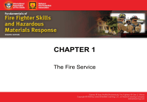 CHAPTER 1 The Fire Service Knowledge Objectives • List five guidelines for successful fire fighter training. • Describe the mission of the fire service. • Describe the culture of the fire service. • Describe the general qualifications for becoming a fire fighter. • Outline the roles and responsibilities of a Fire Fighter I. Knowledge Objectives • Describe the common roles of fire fighters within the fire department. • Describe the specialized response roles within the fire department. • List the Five Es of community risk reduction. • Describe the characteristics of a Community Risk Reduction (CRR) program. • Identify common safety hazards in the home. Knowledge Objectives • Describe the basic types of residential smoke alarms. • Describe a situation in which you will interact with other organizations within your community. • Explain the concept of governance, and describe how regulations, standards, policies, and standard operating procedures affect it. • Locate information in departmental documents and standard operating procedures. Knowledge Objectives • Describe the organization of the fire service. – List the different types of fire department companies, and describe their functions. – Describe how to organize a fire department in terms of staffing, function, and geography. – Explain the basic structure of the chain of command within the fire department. – Define the four basic management principles used to maintain organization within the fire department. • Explain the evolution of the methods and tools of firefighting from colonial days to the present. Knowledge Objectives • Explain how building codes prevent the loss of life and property. • Describe the evolution of training and education for fire department services. • Describe the evolution of fire equipment for fire department services. • Describe the evolution of communications for fire department services. • Describe the evolution of funding for fire department services. Introduction • Training to become a fire fighter is not easy. • Fire fighters are challenged both physically and mentally. • Fire fighter training will expand your understanding of fire suppression. Fire Fighter Guidelines • • • • • Be safe. Follow orders. Work as a team. Think! Follow the Golden Rule. The Mission of the Fire Service • Primary mission – To save lives and protect property and the environment through: • • • • Prevention Education Suppression Rescue activities The Mission of the Fire Service • Mission statement – Should be short enough that you can easily remember it – May post it in a visible place where it will be seen regularly The Culture of the Fire Service • Understanding the culture of the fire service helps you better understand its values. • Cultural characteristics of the fire service – – – – – – – Courage Honor Duty Respect Integrity Character Moral courage Fire Fighter Qualifications • Age requirements – Must be at least 18 or 21 for most fire departments – Differ for volunteer fire departments • Education requirements © Jones & Bartlett Learning. Photographed by Glen E. Ellman. – Minimum of high school diploma or equivalent for most fire departments Fire Fighter Qualifications • Medical requirements – Medical evaluations are often required before training can begin. – Medical requirements for fire fighters are specified in NFPA 1582, Standard on Comprehensive Operational Medical Program for Fire Departments. Fire Fighter Qualifications • Physical fitness requirements – Firefighting requires strength and stamina. – Candidate Physical Ability Test (CPAT) scenarios • • • • • • • • Stair climb Ladder raise and extension Hose drag Equipment carry Forcible entry Search Rescue Ceiling breach and pull Fire Fighter Qualifications • Emergency medical care requirements – Fire fighters may be required to be certified as: • • • • Emergency Medical Responder (EMR) Emergency Medical Technician (EMT) Advanced Emergency Medical Technician (AEMT) Paramedic Fire Fighter Qualifications • Testing and interview requirements – Steps in the application process are decided by each fire department. – Screening processes commonly consist of: • Written exam • Oral interview Roles and Responsibilities for Fire Fighter I • Don and doff personal protective equipment (PPE) properly. • Hoist hand tools using appropriate ropes and knots. • Understand and correctly apply appropriate communication protocols. • Use self-contained breathing apparatus (SCBA). • Respond on apparatus to an emergency scene. Roles and Responsibilities for Fire Fighter I • Establish and operate safely in emergency work areas. • Force entry into a structure. • Exit a hazardous area safely as a team. • Set up and use ground ladders safely and correctly. • Attack a passenger vehicle fire, an exterior Class A fire, and an interior structure fire. Roles and Responsibilities for Fire Fighter I • • • • Conduct search and rescue in a structure. Perform ventilation of an involved structure. Overhaul a fire scene. Conserve property with salvage tools and equipment. • Connect a fire department engine to a water supply. • Extinguish incipient Class A, Class B, and Class C fires. Roles and Responsibilities for Fire Fighter I • • • • • • Illuminate an emergency scene. Turn off utilities. Combat ground cover fires. Perform fire safety surveys. Clean and maintain equipment. Locate information in departmental documents and standard operating procedures. • Operate as part of a team. Roles and Responsibilities for Fire Fighter II • Perform scene size-up. • Determine the need for the incident command system (ICS). • Arrange and coordinate ICS until command is transferred. • Prepare reports. • Communicate the need for assistance. Roles and Responsibilities for Fire Fighter II • • • • • Co