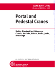 (Revision of ASME B30.4-2015) Portal and Pedestal Cranes Safety Standard for Cableways, Cranes, Derricks, Hoists, Hooks, Jacks, and Slings University of Toronto User. A N A M E R I C A N N AT I O N A L STA N DA R D Copyrighted material licensed to University of Toronto by Clarivate Analytics (US) LLC, subscriptions.techstreet.com, downloaded on 2020-11-21 16:36:25 +0000 by No further reproduction or distribution is permitted. ASME B30.4-2020 (Revision of ASME B30.4-2015) Portal and Pedestal Cranes Safety Standard for Cableways, Cranes, Derricks, Hoists, Hooks, Jacks, and Slings University of Toronto User. AN AMERICAN NATIONAL STANDARD x Copyrighted material licensed to University of Toronto by Clarivate Analytics (US) LLC, subscriptions.techstreet.com, downloaded on 2020-11-21 16:36:25 +0000 by No further reproduction or distribution is permitted. ASME B30.4-2020 The next edition of this Standard is scheduled for publication in 2025. This Standard will become effective 1 year after the Date of Issuance. ASME issues written replies to inquiries concerning interpretations of technical aspects of this Standard. Interpretations are published on the ASME website under the Committee Pages at http://cstools.asme.org/ as they are issued. Errata to codes and standards may be posted on the ASME website under the Committee Pages to provide corrections to incorrectly published items, or to correct typographical or grammatical errors in codes and standards. Such errata shall be used on the date posted. The Committee Pages can be found at http://cstools.asme.org/. There is an option available to automatically receive an e-mail notification when errata are posted to a particular code or standard. This option can be found on the appropriate Committee Page after selecting “Errata” in the “Publication Information” section. ASME is the registered trademark of The American Society of Mechanical Engineers. No part of this document may be reproduced in any form, in an electronic retrieval system or otherwise, without the prior written permission of the publisher. The American Society of Mechanical Engineers Two Park Avenue, New York, NY 10016-5990 Copyright © 2020 by THE AMERICAN SOCIETY OF MECHANICAL ENGINEERS All rights reserved Printed in U.S.A. University of Toronto User. This code or standard was developed under procedures accredited as meeting the criteria for American National Standards. The Standards Committee that approved the code or standard was balanced to assure that individuals from competent and concerned interests have had an opportunity to participate. The proposed code or standard was made available for public review and comment that provides an opportunity for additional public input from industry, academia, regulatory agencies, and the public-at-large. ASME does not “approve,” “rate,” or “endorse” any item, construction, proprietary device, or activity. ASME does not take any position with respect to the validity of any patent rights asserted in connection with any items mentioned in this document, and does not undertake to insure anyone utilizing a standard against liability for infringement of any applicable letters patent, nor assume any such liability. Users of a code or standard are expressly advised that determination of the validity of any such patent rights, and the risk of infringement of such rights, is entirely their own responsibility. Participation by federal agency representative(s) or person(s) affiliated with industry is not to be interpreted as government or industry endorsement of this code or standard. ASME accepts responsibility for only those interpretations of this document issued in accordance with the established ASME procedures and policies, which precludes the issuance of interpretations by individuals. Copyrighted material licensed to University of Toronto by Clarivate Analytics (US) LLC, subscriptions.techstreet.com, downloaded on 2020-11-21 16:36:25 +0000 by No further reproduction or distribution is permitted. Date of Issuance: October 20, 2020 v Committee Roster . . . . . . . . . . . . . . . . . . . . . . . . . . . . . . . . . . . . . . . . . . . . . . . . . . . . . . . . . . . . . . . . vii B30 Standard Introduction . . . . . . . . . . . . . . . . . . . . . . . . . . . . . . . . . . . . . . . . . . . . . . . . . . . . . . . . . . ix Summary of Changes . . . . . . . . . . . . . . . . . . . . . . . . . . . . . . . . . . . . . . . . . . . . . . . . . . . . . . . . . . . . . . xii Chapter 4-0 Section 4-0.1 Section 4-0.2 Section 4-0.3 Section 4-0.4 Section 4-0.5 Chapter 4-1 Section 4-1.1 Section 4-1.2 Section 4-1.3 Section 4-1.4 Section 4-1.5 Section 4-1.6 Section 4-1.7 Section 4-1.8 Section 4-1.9 Section 4-1.10 Section 4-1.11 Section 4-1.12 Section 4-1.13 Section 4-1.14 Section 4-1.15 Section 4-1.16 Section 4-1.17 Section 4-1.18 Chapter 4-2 Section 4-2.1 Section 4-2.2 Section 4-2.3 Section 4-2.4 Section 4-2.5 Chapter 4-3 Section 4-3.1 Section 4-3.2 1 1 1 2 2 5 6 6 6 7 8 9 9 10 10 10 10 10 11 11 11 11 12 12 12 14 14 15 15 16 17 18 18 21 Scope, Definitions, Personnel Competence, Translations, and References . . . . . . Scope of B30.4 . . . . . . . . . . . . . . . . . . . . . . . . . . . . . . . . . . . . . . . . . . . . . . . . . . . Definitions . . . . . . . . . . . . . . . . . . . . . . . . . . . . . . . . . . . . . . . . . . . . . . . . . . . . . . Personnel Competence . . . . . . . . . . . . . . . . . . . . . . . . . . . . . . . . . . . . . . . . . . . . . Translations . . . . . . . . . . . . . . . . . . . . . . . . . . . . . . . . . . . . . . . . . . . . . . . . . . . . . References . . . . . . . . . . . . . . . . . . . . . . . . . . . . . . . . . . . . . . . . . . . . . . . . . . . . . . Erection, Characteristics, and Construction . . . . . . . . . . . . . . . . . . . . . . . . . . . . . Site Preparation and Erection . . . . . . . . . . . . . . . . . . . . . . . . . . . . . . . . . . . . . . . . Structural Design and Construction . . . .