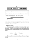 Water and its Treatment 1.1 Unit I WATER AND ITS TREATMENT Hardness of water – types – expression of hardness – units – estimation of hardness of water by EDTA – numerical problems – boiler troubles (scale and sludge) – treatment of boiler feed water – Internal treatment (phosphate, colloidal, sodium aluminate and calgon conditioning) external treatment-Ion exchange process, zeolite process – Desalination of brackish water - Reverse Osmosis. CHAPTER 1 : Water and its Treatment INTRODUCTION The nature’s most abundant supply i.e., water is essential for the survival of all the living beings on earth i.e., man, animals and plants. Water is not only essential for the survival of life, but it is also used for the operation in a large number of industries as coolant, solvent, for steam generation, for air conditioning, fire-fighting etc. Water is also used for all domestic purposes like bathing, drinking, washing, sanitary, irrigation etc. HARDNESS OF WATER “Hardness of water is the characteristic of preventing lather formation of water with soap”. Generally salts like chlorides, bicarbonates and sulphates of Ca2+, Mg2+ and Fe2+ make water hard. This hard water on treatment with soap which is stearic or palmitic acid salts of sodium or potassium causes white precipitate formation of calcium or magnesium stearate or palmitate. 2C17 H35COONa + CaCl2 ⎯⎯ →(C17 H35COO)2 Ca ↓ +2NaCl Sodium Stearate (soap) Hardness causing substance Calcium Stearate (insoluble) Thus the cause of hardness is the precipitation of the soap and hence prevents lathering at first. When the hardness causing ions are removed as insoluble soaps, water becomes soft and forms lather. 1.1 Chemistry 1.2 TYPES OF HARDNESS (i) Temporary Hardness is due to the bicarbonates of Ca2+ and Mg2+ and carbonate of Fe2+. Since bicarbonates readily get precipitated on boiling the water, the temporary hardness can be easily removed, viz. eat Ca (HCO3 )2 ⎯ h⎯ ⎯ → CaCO3 ↓ + H2O + CO2 insoluble (ii) Permanent Hardness is due to the presence of chlorides and sulphates of Ca, Mg, Fe, etc. Permanent Hardness cannot be removed on boiling. CaCl2 + Na2 CO3 ⎯⎯ → CaCO3 ↓ + 2NaCl (Soda) EXPRESSION OF HARDNESS AND UNITS OF HARDNESS Both temporary and permanent hardness are expressed in ppm (parts per million) as CaCO3. The choice of CaCO3 is due to the fact that its molecular weight is 100 and equivalent weight is 50 and it is the most insoluble salt in water. Equivalent of CaCO3 (Mass of hardness producing substance) = × (Chemical equivalent of CaCO3 ) Chemical equivalent of hardness producing substance = Mass of hardness producing substance ×50 Chemical equivalent of hardness producing substance Hardness is principally expressed in ppm unit. Other limits include French degree of hardness, English degree of hardness or Clark, USA degree of hardness and German degree of hardness. 1. Parts per million (ppm): It is the number of parts of calcium carbonate equivalent hardness present in one million parts of water. 1 ppm = 1 part of CaCO3 equivalent hardness in 106 parts of water. 2. Milligram per lite (mg/L): It is the number of milligrams of Calcium carbonate equivalent hardness present in one litre of water. 1 mg/lit. = 1 mg of CaCO3 equivalent hardness in 1 litre of water. Water and its Treatment 1.3 3. Degree Clarke (oCl): It is the number of parts of CaCO 3 equivalent hardness present in 70,000 parts of water. 4. Degree French (oFr): It is the number of parts of CaCO3equivalent hardness present in 105 (1 Lakh) parts of water. 1oFr = 1 part of CaCO3 equivalent hardness in 105 parts of water. The above four units are correlated as given below: 1 ppm = 1 mg/L = 0.07oCl = 0.1oFr 1 ppm= 1 part of hardness 106 parts of water Relation between various units of hardness 1 ppm = 1 mg/l = 0.1°Fr = 0.07°Cl 1 mg/l = 1 ppm = 0.1°Fr = 0.07°Cl 1°Cl = 1.43°Fr =14.3 ppm = 14.3 mg/l 1°Fr = 10 ppm = 10 mg/l = 0.7 °Cl 1.4.1 Disadvantages of Hard Water (a) In domestic uses. For washing and bathing, hard water creates difficulties, since it does not form lather freely with soap. It also creates sticky precipitates that deposit on bath tub, body, clothes etc. until all the Ca/Mg salts get precipitated. Thus a lot of soap gets wasted also. For cooking hard water creates similar difficulties by producing scum on the bottom of the vessels. Due to the presence of hardness producing salts in hard water, boiling point gets elevated and during cooking a lot of fuel is wasted. Pulses etc. do not cook in hard water. Taste of tea, coffee becomes unpleasant. Drinking of hard water is also problematic since it affects the digestive system and at the same time the possibility of deposition of calcium oxalate crystals in the urinary tract is alarming. (b) In industrial uses. For textile industry and dyeing industry, hard water causes the usual problem of deposition of insoluble salts that interfere with the proper dyeing and printing of the fabrics. The stains of iron salts also are undesirable on fabrics. Hard water also hampers the economy by wastage of soap as it does not form good lather. Chemistry 1.4 For sugar industry, the salts responsible for hardness create difficulties in sugar refining and crystallization of sugar and the sugar becomes deliquescent. Calcium and magnesium salts also interfere with the smooth and glossy finish of the papers in the paper industry. Iron salts interfere with the colour of the paper. In laundry, hard water causes wastage of costly soap and also interferes with the coloration due to the staining of iron salts. The hydration of cement and final hardening of cement are affected by use of hard water in concrete making. Hard water is not suitable for preparing drug solutions in pharmaceutical industry For steam generation in boilers, hard water creates many problems like: (i) scale and sludge formation, (ii) corrosion, (iii) priming and foaming and (iv) caustic embrittlement. 1.5 ESTIMATION OF HARD