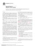 Designation: E 709 – 08 Standard Guide for Magnetic Particle Testing1 This standard is issued under the fixed designation E 709; the number immediately following the designation indicates the year of original adoption or, in the case of revision, the year of last revision. A number in parentheses indicates the year of last reapproval. A superscript epsilon (e) indicates an editorial change since the last revision or reapproval. This standard has been approved for use by agencies of the Department of Defense. and orientation of indications that are unacceptable in a specific part versus those which need not be removed before part acceptance. Conditions where rework or repair is not permitted should be specified. 1.4 This guide describes the use of the following magnetic particle method techniques. 1.4.1 Dry magnetic powder (see 8.4), 1.4.2 Wet magnetic particle (see 8.5), 1.4.3 Magnetic slurry/paint magnetic particle (see 8.5.7), and 1.4.4 Polymer magnetic particle (see 8.5.8). 1.5 Personnel Qualification—Personnel performing examinations in accordance with this guide should be qualified and certified in accordance with ASNT Recommended Practice No. SNT-TC-1A, ANSI/ASNT Standard CP-189, NAS 410, or as specified in the contract or purchase order. 1.6 Nondestructive Testing Agency—If a nondestructive testing agency as described in Practice E 543 is used to perform the examination, the nondestructive testing agency should meet the requirements of Practice E 543. 1.7 The numerical values shown in inch-pound units are to be regarded as the standard. SI units are provided for information only. 1.8 This standard does not purport to address all of the safety concerns, if any, associated with its use. It is the responsibility of the user of this standard to establish appropriate safety and health practices and determine the applicability of regulatory limitations prior to use. 1. Scope 1.1 This guide2 describes techniques for both dry and wet magnetic particle testing, a nondestructive method for detecting cracks and other discontinuities at or near the surface in ferromagnetic materials. Magnetic particle testing may be applied to raw material, semifinished material (billets, blooms, castings, and forgings), finished material and welds, regardless of heat treatment or lack thereof. It is useful for preventive maintenance testing. 1.1.1 This guide is intended as a reference to aid in the preparation of specifications/standards, procedures and techniques. 1.2 This guide is also a reference that may be used as follows: 1.2.1 To establish a means by which magnetic particle testing, procedures recommended or required by individual organizations, can be reviewed to evaluate their applicability and completeness. 1.2.2 To aid in the organization of the facilities and personnel concerned in magnetic particle testing. 1.2.3 To aid in the preparation of procedures dealing with the examination of materials and parts. This guide describes magnetic particle testing techniques that are recommended for a great variety of sizes and shapes of ferromagnetic materials and widely varying examination requirements. Since there are many acceptable differences in both procedure and technique, the explicit requirements should be covered by a written procedure (see Section 21). 1.3 This guide does not indicate, suggest, or specify acceptance standards for parts/pieces examined by these techniques. It should be pointed out, however, that after indications have been produced, they must be interpreted or classified and then evaluated. For this purpose there should be a separate code, specification, or a specific agreement to define the type, size, location, degree of alignment and spacing, area concentration, 2. Referenced Documents 2.1 ASTM Standards: 3 A 275/A 275M Practice for Magnetic Particle Examination of Steel Forgings A 456/A 456M Specification for Magnetic Particle Examination of Large Crankshaft Forgings D 93 Test Methods for Flash Point by Pensky-Martens Closed Cup Tester D 445 Test Method for Kinematic Viscosity of Transparent 1 This guide is under the jurisdiction of ASTM Committee E07 on Nondestructive Testing and is the direct responsibility of Subcommittee E07.03 on Liquid Penetrant and Magnetic Particle Methods. Current edition approved Feb. 15, 2008. Published April 2008. Originally approved in 1980. Last previous edition approved in 2001 as E709 - 01. 2 For ASME Boiler and Pressure Vessel Code Applications see related Guide SE-709 in Section II of that Code. 3 For referenced ASTM standards, visit the ASTM website, www.astm.org, or contact ASTM Customer Service at service@astm.org. For Annual Book of ASTM Standards volume information, refer to the standard’s Document Summary page on the ASTM website. Copyright © ASTM International, 100 Barr Harbor Drive, PO Box C700, West Conshohocken, PA 19428-2959, United States. 1 Copyright by ASTM Int'l (all rights reserved); Tue Sep 9 19:52:42 EDT 2008 Downloaded/printed by Carmela Villanueva (Pont Univ Catolica Del Peru) pursuant to License Agreement. No further reproductions authorized. E 709 – 08 and Opaque Liquids (and Calculation of Dynamic Viscosity) E 165 Test Method for Liquid Penetrant Examination E 543 Specification for Agencies Performing Nondestructive Testing E 1316 Terminology for Nondestructive Examinations E 1444 Practice for Magnetic Particle Testing E 2297 Guide for Use of UV-A and Visible Light Sources and Meters used in the Liquid Penetrant and Magnetic Particle Methods 2.2 Society of Automotive Engineers (SAE): Aerospace Materials Specifications:4 AMS 2300 Premium Aircraft Quality Steel Cleanliness Magnetic Particle Inspection Procedure AMS 2301 Aircraft Quality Steel Cleanliness Magnetic Particle Inspection Procedure AMS 2303 Aircraft Quality Steel Cleanliness Martensitic Corrosion Resistant Steels Magnetic Particle Inspection Procedure AMS 2641 Vehicle Magnetic Particle Inspection AMS 3040 Magnetic Particles, Non-fluorescent, Dry Metho