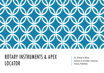 ROTARY INSTRUMENTS & APEX LOCATOR Dr. Ahmed Al-Bittar Lecturer at Al-Azhar University (Gaza/Palestine) ROOT CANAL TREATMENT PROCEDURES ➢Intra coronal preparation(access cavity) ➢Working length determination ➢Pulp extirpation ➢Intra-radicular preparation (cleaning and shaping) Cleaning and shaping of root canal system Basic Objectives in Cleaning and Shaping ◆Remove infected soft and hard tissue ◆Give disinfecting irrigants access to the apical canal space ◆Create space for the delivery of medicaments and subsequent obturation ◆Retain the integrity of radicular structures PRINCIPLES OF CLEANING AND SHAPING BIOLOGICAL OBJECTIVE ❖Removal of organic remnants and inorganic debris ❖Avoid pushing the necrotic debris to the periodontium ❖All instrumentation should be confined with canal space ❖Do no harm (tooth – periodontium) root canal systemanalsys MECHANICAL OBJECTIVE ❖Tapered preparation ❖preservation of the natural canal curvature , canal cross-section and tapered form ❖Preservation of the apical root anatomy ❖Creation of apical stop ❖Make the preparation in multiple plane ❖Keep the apical foramen as small as normal There were several problems with stainless steel instruments before the advent of NiTi: 1. Procedural errors, with instrumentation of curved canals (Zip formation, perforation, separation of the instrument...etc.) 2. Alteration of root canal morphology through the action of the restoring forces of stainless steel instruments 3. Instrumentation of curved canals was dealt with by: a. Precurving instruments and using a telescopic filing technique (step-back) b. Manufacture of intermediate sizes for use in the preparation of curved canals. 4. There is a substantial rise in instrument stiffness with increasing instrument size. Smaller sizes conform better to root morphology. 5. While manufacturers had recently marketed a number of new instruments based upon different crosssectional shapes, design concepts, and fabrication procedures, in a quest for improved cutting efficiency and flexibility, all of these brands had been fabricated from stainless steel. WHY ROTARY INSTRUMENTATION? Enhanced ability to collect and remove debris from the canal system. Better control for maintaining the central axis of the canal, reducing the incidence of ledging or perforating. Reduction in the time required for instrumenting the canal. Why Nickel-Titanium ?? • reversible rearrangement of the nickel and titanium atoms at the molecular level. A new endodontic file is composed of nickel and titanium atoms arranged in a body-centered cubic lattice structure NiTi alloys are unique in that applied stress (i.e. bending) causes a called the austenite phase. When this file is placed in a curved canal, the atoms rearrange into a closely-packed hexagonal array and the alloy is transformed into the more flexible martensitic crystal structure. This molecular transition enables these files to bend easily and around severe curves without permanent deformation. Nickel Titanium: A Super Elastic Alloy It was developed by W. F. Buehler, a metallurgist investigating nonmagnetic, salt resisting, waterproof alloys for the space programme in Maryland, USA. NiTiNOL term is used worldwide for this special type of alloy. 55 NiTiNOL: 55 wt% Ni and 45 wt% Ti and less than 2 wt% Co, nearly the same number of Ni and Ti atoms are combined, being reflected in the term equiatomic. 60 NiTiNOL: contains about 5% more nickel (lower ‘‘shape memory effect’’ and increased heat treatability, together with increasing hardness). Thermodynamic Properties Two specific properties made NiTi a very promising alloy for endodontics: Shape Memory and Superelasticity. Several effects were noted that relate to its specific crystal arrangement with two stable main phases, austenite and martensite: a shape memory effect as temperature and strain-dependent pseudoelasticity, all attributable to specific thermodynamic properties of the new alloy. This lattice organization can be altered either by *temperature or stress. *Files can be subjected to varying temperature & stress during manufacture, autoclaving & during root canal preparation. There are three NiTi phases in these alloys: • Austenitic NiTi (austenite) has a complex body-centered cubic structure and exists at higher temperatures and lower stresses. Materials existing in this phase are strong & hard. It is considered the most stable phase. • Martensitic NiTi (martensite) has a complex structure described as monoclinic and exists at lower temperatures and higher stresses. Materials existing in this phase are soft & ductile. It is considered an unstable phase. • The R-phase is an intermediate phase with a rhombohedral structure that can form during forward transformation from martensite to austenite on heating and reverse transformation from austenite to martensite on cooling. The R-phase transformation shows unique properties, which attract widespread interest for practical applications. The more the alloy works in this phase, the more the characteristics of compliance and strength are established. The Ni-ti rotary endodontic instruments will thus be able to shape the root canal following the original root canal anatomy even if complex, without reaching elevated values of stress. A. Shape memory : By shape memory we mean the capacity of NiTi alloys to reacquire its initial shape through heating after strain. This property that is considered more relevant to orthodontics than endodontics. Transformation between austenite and martensite occurs by a twinning process at the atomic level, and the reversibility of this twinning is the origin of shape memory. Twinning: Martensite's crystal structure has the unique ability to undergo limited deformation in some ways without breaking atomic bonds. This type of deformation is known as twinning, which consists of the rearrangement of atomic planes without causing slip, or permanent deformation. When martens