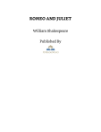 ROMEO AND JULIET William Shakespeare Published By THIS EDITION PUBLISHED IN 2020 BY PDFBOOKSWORLD.COM Publisher Notes: Contents of this edition have been sourced from public domain materials. PDFBooksWorld has created, edited and published the EBook version from the manuscripts, texts and illustrative images found in public domain archives. Registered members can download this EBook from our website for personal reading. However this file shall not be stored & transmitted in any form or reverse engineered for commercial purpose. Table of Contents ROMEO AND JULIET William Shakespeare Dramatis Personae SCENE.—Verona; Mantua. THE PROLOGUE ACT I. Scene I. Verona. A public place. Scene II. A Street. Scene III. Capulet's house. Scene IV. A street. Scene V. Capulet's house. PROLOGUE ACT II. Scene I. A lane by the wall of Capulet's orchard. Scene II. Capulet's orchard. Scene III. Friar Laurence's cell. Scene IV. A street. Scene V. Capulet's orchard. Scene VI. Friar Laurence's cell. ACT III. Scene I. A public place. Scene II. Capulet's orchard. Scene III. Friar Laurence's cell. Scene IV. Capulet's house Scene V. Capulet's orchard. ACT IV. Scene I. Friar Laurence's cell. Scene II. Capulet's house. Scene III. Juliet's chamber. Scene IV. Capulet's house. Scene V. Juliet's chamber. ACT V. Scene I. Mantua. A street. Scene II. Verona. Friar Laurence's cell. Scene III. Verona. A churchyard; in it the monument of the Capulets. Dramatis Personae Chorus. Escalus, Prince of Verona. Paris, a young Count, kinsman to the Prince. Montague, heads of two houses at variance with each other. Capulet, heads of two houses at variance with each other. An old Man, of the Capulet family. Romeo, son to Montague. Tybalt, nephew to Lady Capulet. Mercutio, kinsman to the Prince and friend to Romeo. Benvolio, nephew to Montague, and friend to Romeo Tybalt, nephew to Lady Capulet. Friar Laurence, Franciscan. Friar John, Franciscan. Balthasar, servant to Romeo. Abram, servant to Montague. Sampson, servant to Capulet. Gregory, servant to Capulet. Peter, servant to Juliet's nurse. An Apothecary. Three Musicians. An Officer. Lady Montague, wife to Montague. Lady Capulet, wife to Capulet. Juliet, daughter to Capulet. Nurse to Juliet. Citizens of Verona; Gentlemen and Gentlewomen of both houses; Maskers, Torchbearers, Pages, Guards, Watchmen, Servants, and Attendants. SCENE.—Verona; Mantua. THE PROLOGUE Enter Chorus. Chor. Two households, both alike in dignity, In fair Verona, where we lay our scene, From ancient grudge break to new mutiny, Where civil blood makes civil hands unclean. From forth the fatal loins of these two foes A pair of star-cross'd lovers take their life; Whose misadventur'd piteous overthrows Doth with their death bury their parents' strife. The fearful passage of their death-mark'd love, And the continuance of their parents' rage, Which, but their children's end, naught could remove, Is now the two hours' traffic of our stage; The which if you with patient ears attend, What here shall miss, our toil shall strive to mend. [Exit.] ACT I. Scene I. Verona. A public place. Enter Sampson and Gregory (with swords and bucklers) of the house of Capulet. Samp. Gregory, on my word, we'll not carry coals. Greg. No, for then we should be colliers. Samp. I mean, an we be in choler, we'll draw. Greg. Ay, while you live, draw your neck out of collar. Samp. I strike quickly, being moved. Greg. But thou art not quickly moved to strike. Samp. A dog of the house of Montague moves me. Greg. To move is to stir, and to be valiant is to stand. Therefore, if thou art moved, thou runn'st away. Samp. A dog of that house shall move me to stand. I will take the wall of any man or maid of Montague's. Greg. That shows thee a weak slave; for the weakest goes to the wall. Samp. 'Tis true; and therefore women, being the weaker vessels, are ever thrust to the wall. Therefore I will push Montague's men from the wall and thrust his maids to the wall. Greg. The quarrel is between our masters and us their men. Samp. 'Tis all one. I will show myself a tyrant. When I have fought with the men, I will be cruel with the maids- I will cut off their heads. Greg. The heads of the maids? Samp. Ay, the heads of the maids, or their maidenheads. Take it in what sense thou wilt. Greg. They must take it in sense that feel it. Samp. Me they shall feel while I am able to stand; and 'tis known I am a pretty piece of flesh. Greg. 'Tis well thou art not fish; if thou hadst, thou hadst been poor-John. Draw thy tool! Here comes two of the house of Montagues. Enter two other Servingmen [Abram and Balthasar]. Samp. My naked weapon is out. Quarrel! I will back thee. Greg. How? turn thy back and run? Samp. Fear me not. Greg. No, marry. I fear thee! Samp. Let us take the law of our sides; let them begin. Greg. I will frown as I pass by, and let them take it as they list. Samp. Nay, as they dare. I will bite my thumb at them; which is disgrace to them, if they bear it. Abr. Do you bite your thumb at us, sir? Samp. I do bite my thumb, sir. Abr. Do you bite your thumb at us, sir? Samp. [aside to Gregory] Is the law of our side if I say ay? Greg. [aside to Sampson] No. Samp. No, sir, I do not bite my thumb at you, sir; but I bite my thumb, sir. Greg. Do you quarrel, sir? Abr. Quarrel, sir? No, sir. Samp. But if you do, sir, am for you. I serve as good a man as you. Abr. No better. Samp. Well, sir. Enter Benvolio. Greg. [aside to Sampson] Say 'better.' Here comes one of my master's kinsmen. Samp. Yes, better, sir. Abr. You lie. Samp. Draw, if you be men. Gregory, remember thy swashing blow. They fight. Ben. Part, fools! [Beats down their swords.] Put up your swords. You know not what you do. Enter Tybalt. Tyb. What, art thou drawn among these heartless hinds? Turn thee Benvolio! look upon thy death. Ben. I do but keep the peace. Put up thy sword, Or manage it to part these men with me. Tyb. What, drawn, and talk of peace? I hate the word As I hate hell, all Montagues, and th