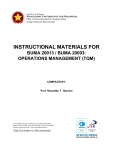 Republic of the Philippines POLYTECHNIC UNIVERSITY OF THE PHILIPPINES Office of the Vice President for Academic Affairs College of Business Administration INSTRUCTIONAL MATERIALS FOR BUMA 20013 / BUMA 20093: OPERATIONS MANAGEMENT (TQM) COMPILED BY: Prof. Reynaldo T. Barrera PUP A. Mabini Campus, Anonas Street, Sta. Mesa, Manila 1016 Direct Line: 335-1730 | Trunk Line: 335-1787 or 335-1777 local 000 Website: www.pup.edu.ph | Email: inquire@pup.edu.ph THE COUNTRY’S 1st POLYTECHNIC Introduction Global competition has caused fundamental changes in the competitive environment of manufacturing industries. Firms must develop strategic objectives which, upon achievement, result in a competitive advantage in the market place. However, for almost all manufacturing industries, an increased productivity and better overall efficiency of the production line are the most important goals. Most industries would like to find the formula for the ultimate productivity improvement strategy. Industries often suffer from the lack of a systematic and consistent methodology. In particular the manufacturing world has faced many changes throughout the years and as a result, the manufacturing industry is constantly evolving in order to stay ahead of competition. Innovation is a necessary process for the continuous changes in order to contribute to the economic growth in the manufacturing industry, especially to compete in the global market. In addition to innovation as a mode for continued growth and change, there are many other vehicles for growth in the manufacturing industry. While operations management has been recognized as an important factor in a country’s economic growth. The traditional view of manufacturing management is the concept of Production Management with the focus on economic efficiency in manufacturing. Later the new name Operations Management was identified, as service sector became more prominent. Rapid changes in technology have posed numerous opportunities and challenges, which have resulted in enhancement of manufacturing capabilities through new materials, facilities, techniques and procedures. Hence, managing a service system has become a major challenge in the global competitive environment. Operations Management has been a key element in the improvement and productivity in business around the world. Operations Management leads the way for the organizations to achieve its goals with minimum effort. Hence, the study of the subject at undergraduate and postgraduate level has more significance. Page 2 of 156 TABLE OF CONTENTS INTRODUCTION..................................................................................................................... 2 COURSE OUTCOMES ........................................................................................................... 7 LESSON 1 – OPERATIONS AND PRODUCTIVITY ............................................................... 8 Introduction to Operations Management ................................................................................. 8 Historical Development........................................................................................................... 9 Goods-Service Continuum.....................................................................................................11 Manufacturing Vs. Service .....................................................................................................11 Supply Chain .........................................................................................................................12 Concept of Production ...........................................................................................................13 Production System ................................................................................................................13 Role of the Operations Manager ............................................................................................16 Systems Approach ................................................................................................................19 Ethical Issues in Operations ..................................................................................................19 LESSON 2 – THE GLOBAL ENVIRONMENT AND OPERATIONS STRATEGY ..................20 Competitiveness ....................................................................................................................20 Marketing’s Influence.............................................................................................................20 Businesses Compete Using Operations ................................................................................20 Why Some Organizations Fail ...............................................................................................20 Hierarchical Planning.............................................................................................................21 Strategy Formulation .............................................................................................................22 Environmental Scanning ........................................................................................................22 Strategic OM Decision Areas.................................................................................................23 The Balanced Scorecard Approach .......................................................................................24 Why Productivity Matters .......................................................................................................25 LESSON 3 – MANAGING PROJECTS..................................................................................27 The Nature of Projects...........................................................................................................27 Project Management Decisions .............................................................................................27 Work Breakdown Str