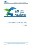 ATS2825 Bluetooth Module SPEC ATS2825 Bluetooth Module SPEC Latest Version: 1.0 2015-06-09 Copyright© 2015 Actions (Zhuhai) Technology Co., Ltd. All rights reserved. Version 1.0 Page 1 ATS2825 Bluetooth Module SPEC Declaration Circuit diagrams and other information relating to products of Actions Semiconductor Company, Ltd. (“Actions”) are included as a means of illustrating typical applications. Consequently, complete information sufficient for construction is not necessarily given. Although the information has been examined and is believed to be accurate, Actions makes no representations or warranties with respect to the accuracy or completeness of the contents of this publication and disclaims any responsibility for inaccuracies. Information in this document is provided solely to enable use of Actions’ products. The information presented in this document does not form part of any quotation or contract of sale. Actions assumes no liability whatsoever, including infringement of any patent or copyright, for sale and use of Actions’ products, except as expressed in Actions’ Terms and Conditions of Sale for. All sales of any Actions products are conditional on your agreement of the terms and conditions of recently dated version of Actions’ Terms and Conditions of Sale agreement Dated before the date of your order. This information does not convey to the purchaser of the described semiconductor devices any licenses under any patent rights, copyright, trademark rights, rights in trade secrets and/or know how, or any other intellectual property rights of Actions or others, however denominated, whether by express or implied representation, by estoppel, or otherwise. Information Documented here relates solely to Actions products described herein supersedes, as of the release date of this publication, all previously published data and specifications relating to such products provided by Actions or by any other person purporting to distribute such information. Actions reserves the right to make changes to specifications and product descriptions at any time without notice. Contact your Actions sales representative to obtain the latest specifications before placing your product order. Actions product may contain design defects or errors known as anomalies or errata which may cause the products functions to deviate from published specifications. Anomaly or “errata” sheets relating to currently characterized anomalies or errata are available upon request. Designers must not rely on the absence or characteristics of any features or instructions of Actions’ products marked “reserved” or “undefined.” Actions reserves these for future definition and shall have no responsibility whatsoever for conflicts or incompatibilities arising from future changes to them. Actions’ products are not designed, intended, authorized or warranted for use in any life support or other application where product failure could cause or contribute to personal injury or severe property damage. Any and all such uses without prior written approval of an Officer of Actions and further testing and/or modification will be fully at the risk of the customer. Copies of this document and/or other Actions product literature, as well as the Terms and Conditions of Sale Agreement, may be obtained from an authorized Actions representative. The word “ACTIONS”, the Actions’ LOGO, whether used separately and/or in combination, and the phase “ATS2825”, are trademarks of Actions Semiconductor Company, Ltd., Names and brands of other companies and their products that may from time to time descriptively appear in this product data sheet are the trademarks of their respective holders; no affiliation, authorization, or endorsement by such persons is claimed or implied except as may be expressly stated therein. ACTIONS DISCLAIMS AND EXCLUDES ANY AND ALL WARRANTIES, INCLUDING WITHOUT LIMITATION ANY AND ALL IMPLIED WARRANTIES OF MERCHANTABILITY, FITNESS FOR A PARTICULAR PURPOSE, TITLE, AND AGAINST INFRINGEMENT AND THE LIKE, AND ANY AND ALL WARRANTIES ARISING FROM ANY COURSE OF DEALING OR USAGE OF TRADE. IN NO EVENT SHALL ACTIONS BE RELIABLE FOR ANY DIRECT, INCIDENTAL, INDIRECT, SPECIAL, PUNITIVE, OR CONSEQUENTIAL DAMAGES; OR FOR LOST DATA, PROFITS, SAVINGS OR REVENUES OF ANY KIND; REGARDLESS OF THE FORM OF ACTION, WHETHER BASED ON CONTRACT; TORT; NEGLIGENCE OF ACTIONS OR OTHERS; STRICT LIABILITY; BREACH OF WARRANTY; OR OTHERWISE; WHETHER OR NOT ANY REMEDY OF BUYER IS HELD TO HAVE FAILED OF ITS ESSENTIAL PURPOSE, AND WHETHER ACTIONS HAS BEEN ADVISED OF THE POSSIBILITY OF SUCH DAMAGES OR NOT. Copyright© 2015 Actions (Zhuhai) Technology Co., Ltd. All rights reserved. Version 1.0 Page 2 ATS2825 Bluetooth Module SPEC List of Contents Declaration................................................................................................................................2 List of Contents ........................................................................................................................3 Features.....................................................................................................................................4 Applications ..............................................................................................................................4 Application Diagram ...............................................................................................................4 Specifications ............................................................................................................................4 Electrical Characteristics ........................................................................................................5 AUDIO Features ......................................................................................................................6 RF Characteristics ....................................................................................