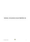 EEE421 ANALOGUE ELECTRONICS II M. Lupupa, 2022/2023 1 1. FEEDBACK AND ITS EFFECTS IN AMPLIFIERS - Feedback plays a great role especially in op-amp circuits. - Depending on the relative polarity of the signal being fed back into the circuit, one may have negative (degenerative) or positive (regenerative) feedback. - Negative feedback results in decreased voltage gain, for which a number of circuit features are improved. - Positive feedback drives a circuit into oscillation as in various types of oscillator circuits. - Although negative feedback results in reduced overall voltage gain, a number of improvements are obtained, among them being: 1. Better gain stability or gain desensitivity: that is, it makes the value of the gain less sensitive to variations in the values of circuit components, such might be caused by changes in temperature. 2. Reduces nonlinear distortion: that is, it makes the output proportional to the input (it makes the gain constant, independent of signal level). 3. Reduces the effect of noise or interference reduction: that is, it minimises the contribution to the output of the unwanted electric signals generated, either by the circuit components themselves or by unrelated interference. 4. Higher input impedance 5. Lower output impedance 6. Improved frequency response or bandwidth extension - A typical feedback amplifier connection is shown below. M. Lupupa, 2022/2023 2 - The open-loop amplifier has a gain A ; thus its output xo is related to the input xi by: xo = Axi - (1.1) The output xo is fed to the load as well as to the feedback network, which produces a sample of the output. This sample or feedback signal x f is related to xo by the feedback factor, . x f = xo - (1.2) The input signal xi is obtained by subtracting the feedback signal x f from the source signal xs . xi = xs − x f (1.3) - We note that it is the subtraction that makes the feedback negative. In essence negative feedback reduces the signal that appears at the input of the basic amplifier. - The gain of the feedback amplifier can be obtained by combining the above equations, and can be expressed as: Af = xo A = xs 1 + A (1.4) - The quantity A is called the loop gain. - For the feedback to be negative, the loop gain must be positive, i.e. the feedback signal x f should have the same sign as xs . - The quantity 1 + A is called the amount of feedback. - If the loop gain A is large, i.e. A expressed as: Af M. Lupupa, 2022/2023 1 1, then the gain of the feedback amplifier can be (1.5) 3 - The feedback signal x f can also be expressed as: xf = - A xs 1 + A (1.6) For A >>1 , x f xs , which implies that the signal xi at the input of the basic amplifier is reduced to almost zero. Thus if a large amount of negative feedback is employed, the feedback signal x f becomes an almost identical replica of the source signal xs . - The difference between xs and x f , which is xi is sometimes referred to as the error signal. - The input differencing circuit is often called a comparison circuit or a mixer. - An expression for xi can be determined as: xi = 1 xs 1 + A (1.7) Example (a) If the open-loop gain, A= 104 V / V and = R R1 find 2 to obtain a closed-loop gain R1 R1 + R2 of Af = 10V / V . (b) What is the amount of feedback in decibels? (c) If Vs = 1V , find V0 , V f and Vi . (d) If A decreases by 20%, what is the corresponding decrease in Af ? Effects of Negative Feedback The following are some of the effects of negative feedback on the performance of feedback amplifiers. M. Lupupa, 2022/2023 4 (a) Better gain stability or gain desensitivity - An important advantage of negative feedback is that the resultant gain of the amplifier can be made independent of transistor parameters or the supply voltage variations. We have, Af = - A 1 + A (1.4) For negative feedback in an amplifier to be effective, the designer deliberately makes A >>1. Therefore, in the above expression, 1 can be neglected as compared to A . Hence, Af = A 1 A (1.5) - It may be observed that the gain now depends only upon feedback fraction, . As the feedback network is usually made up of resistive components, it is unaffected by changes in temperature, variations in transistor parameters and frequency. Hence, the gain of the amplifier is extremely stable. - If the feedback transfer function is a constant, then taking the derivative of Af with respect to A in Af = A we get: 1 + A dAf dA = 1 A 1 − = 2 (1 + A ) (1 + A ) (1 + A )2 dAf = - Dividing both sides by Af = dAf Af = dA (1 + A) 2 A yields: 1+ A 1 dA (1 + A) A (1.8) which says that the percentage change in Af is less than the corresponding percentage change in the open loop gain A by the amount of feedback, 1 + A , which is also called the desensitivity factor. M. Lupupa, 2022/2023 5 Example Calculate the percent change in the closed-loop gain, Af , given a change in the open-loop gain, A . We have A = 105 , A f = 50 and = 0.01999 . Assume that the change in the open-loop gain is dA = 104 (a 10 percent change). (b) Improved frequency response or bandwidth extension - Consider an amplifier whose frequency response is characterized by a single pole. Its gain at mid and high frequencies can be expressed as: A( s ) = AM s 1+ (1.9) H where AM is the midband gain and H is the upper 3-dB frequency. - The closed-loop gain of the feedback amplifier can be expressed as: Af ( s ) = A( s ) 1 + A( s) (1.10) where we assume that the feedback transfer function is independent of frequency. - Substituting for A(s) into A f ( s ) yields: AM s 1+ Af ( s ) = - A 1+ M 1+ s H After some manipulation A f ( s ) becomes: Af ( s ) = - H AM / (1 + AM ) 1 + s / H (1 + AM ) Af (0) = AM (1 + AM ) (1.11) Thus the feedback amplifier will have a midband gain of AM / (1 + AM ) and an upper 3dB frequency Hf given by: Hf = H (1 + AM ) M. Lupupa, 2022/2023 (1.12) 6 - If the open-loop gain is characterised by a dominant low frequency pole giving rise to a lower 3-dB frequency, L , then the feedback amplifier will have a lower 3-dB fr