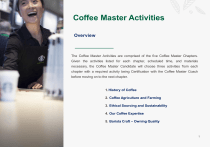 Coffee Master Activities Overview The Coffee Master Activities are comprised of the five Coffee Master Chapters. Given the activities listed for each chapter, scheduled time, and materials necessary, the Coffee Master Candidate will choose three activities from each chapter with a required activity being Certification with the Coffee Master Coach before moving on to the next chapter. 1.History of Coffee 2. Coffee Agriculture and Farming 3. Ethical Sourcing and Sustainability 4. Our Coffee Expertise 5. Barista Craft – Owning Quality 1 Coffee Master Activities 1. History of Coffee The Coffee Master Candidate will choose two-four elective activities and complete certification with their Coffee Master Coach/Manager before moving on to the next chapter. Title Description Time Title Description Time History Prepare a tasting with your fellow team members and/or customers and share some interesting stories you’ve learned about coffee’s history; option to go deeper on a particular country or region's history and its place in the industry. Taste Ethiopia and share the story of how coffee began its journey around the globe. 15 min Starbucks History Look at the menu of the original store in Pike Place Market. Do a tasting of one of the coffees that we still offer from the original menu. Share the story of the first store in the market. 10 min Starbucks History Read the article on 1912pike.com about our first store. Prepare a coffee tasting of Pike Place Roast and share with a customer or team member the coffee and the story. https://1912pike.com/store-tour-inside-1912pike-place-seattle-usa/ 10 min Starbucks Reserve Roastery and Tasting Room Do you work in a Reserve store or have one nearby? Taste a Reserve coffee with a customer or team member and share the story of the Reserve Roastery and Tasting Room in Seattle, WA. To learn about the roastery, explore the Roastery website. http://roastery.starbucks.com/discover/ 15 min Certification Lead your manager/coach in a guided coffee tasting of your choosing. Share what you've learned from your experience in this chapter, why it's important to you, and how you'll apply it going forward. 15 min History of coffee Passport Recap Using your Coffee Passport, share a tasting 5 min 10 min with your fellow team members and/or customers of some of your favorite coffees from the passport. What do you love about them? Why are they your favorites? How would you describe them to customers? Rediscover a Favorite Starbucks History Rediscover one of your favorite coffees: How long has it been a coffee at Starbucks? Where is the coffee from? How do you describe the taste to customers? What do you recommend for a pairing? Do a coffee tasting with House Blend and talk about why it’s important to Starbucks and also talk about key dates in Starbucks history. Starbucks Confidential – INTERNAL USE ONLY 10 min 10 min 2 Coffee Master Activities 2. Coffee Agriculture and Farming The Coffee Master Candidate will choose two-four elective activities and complete certification with their Coffee Master Coach/Manager before moving on to the next chapter. Title Description Time Customer Seminar Teach about a coffee growing country or region and taste coffee from that region. Speak about terroir and how that can have an effect on the taste. Share your Coffee Passport with the customers. 30 min Compare and contrast Starbucks two coffees from the same region: how and why are they different or similar? (think about climate and processing) Examples: Sumatra & Komodo Dragon, House Blend & Breakfast Blend, Kenya & Ethiopia . 15 min Explore what single origin means, and how it differs from a blend, compare/contrast a single origin coffee vs. a regional blend. Examples: Sumatra, Guatemala & Veranda 15 min Compare and contrast 3-5 apple or grape varieties as a means to understand coffee. If you are in an Evenings store, ask your manager about the possibility of using wine. Identify flavor, aroma and mouth-feel, record your notes and share with other baristas. 15 min One Origin - in depth What is singleorigin What is a varietal? Starbucks Confidential – INTERNAL USE ONLY Title Description The Regions, Lead a team tasting of the three origins, part 1 brewed in a coffee press. Time 15 min Examples: Kenya, Sumatra, Guatemala; Ethiopia, House Blend The Regions, part 2 Conduct another "around the world" tasting, with different coffees than in The Regions, part 1. Use a brew method of your choice. 30 min Promo Support 1 Take responsibility for a new promotional coffee before it launches: its story and tasting notes, and share talking points with team members. Brew and taste it with your team. Connect to origin and the Starbucks difference 30 min Reserve support 1 Take responsibility for new Reserve coffees: connect with a favorite core coffee, learn its story and tasting notes, how to brew it, and share its talking points with team members. 15 min Coffee Processing Tasting Compare washed, semi-washed, and natural (if available) coffees to each other. What's your favorite, and why? How would you share this with a customer? 15 min 3 Coffee Master Activities 2. Coffee Agriculture and Farming…………..continuation The Coffee Master Candidate will choose two-four elective activities and complete certification with their Coffee Master Coach/Manager before moving on to the next chapter. Title Description Time Coffee Lifecycle Do you know the lifecycle of a tree? How hard it works to produce coffee? Research the work of farmers & agronomists, and watch a video from our blog on www.1912pike.com. Now, taste a coffee that you appreciate in a new way and share it with a customer What is processing? Why is it important to flavor? Pick a coffee and discuss how processing has impacted its flavor and lead a tasting. Connect the coffee tasting with your own journey and appreciation of quality.. 15 min Reach out to a Starbucks partner who has been on the Origin Experience, and interview them about their 