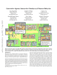 arXiv:2304.03442v1 [cs.HC] 7 Apr 2023 Generative Agents: Interactive Simulacra of Human Behavior Joon Sung Park Joseph C. O’Brien Carrie J. Cai Stanford University Stanford, USA joonspk@stanford.edu Stanford University Stanford, USA jobrien3@stanford.edu Google Research Mountain View, CA, USA cjcai@google.com Meredith Ringel Morris Percy Liang Michael S. Bernstein Google Research Seattle, WA, USA merrie@google.com Stanford University Stanford, USA pliang@cs.stanford.edu Stanford University Stanford, USA msb@cs.stanford.edu Figure 1: Generative agents create believable simulacra of human behavior for interactive applications. In this work, we demonstrate generative agents by populating a sandbox environment, reminiscent of The Sims, with twenty-five agents. Users can observe and intervene as agents they plan their days, share news, form relationships, and coordinate group activities. ABSTRACT Believable proxies of human behavior can empower interactive applications ranging from immersive environments to rehearsal spaces for interpersonal communication to prototyping tools. In this paper, we introduce generative agents—computational software Permission to make digital or hard copies of all or part of this work for personal or classroom use is granted without fee provided that copies are not made or distributed for profit or commercial advantage and that copies bear this notice and the full citation on the first page. Copyrights for components of this work owned by others than the author(s) must be honored. Abstracting with credit is permitted. To copy otherwise, or republish, to post on servers or to redistribute to lists, requires prior specific permission and/or a fee. Request permissions from permissions@acm.org. arXiv, April, 2023, © 2023 Copyright held by the owner/author(s). Publication rights licensed to ACM. ACM ISBN xx-x-xxxx-xxxx-x/xx/xx. . . $15.00 https://doi.org/xx.xx/xx.xx agents that simulate believable human behavior. Generative agents wake up, cook breakfast, and head to work; artists paint, while authors write; they form opinions, notice each other, and initiate conversations; they remember and reflect on days past as they plan the next day. To enable generative agents, we describe an architecture that extends a large language model to store a complete record of the agent’s experiences using natural language, synthesize those memories over time into higher-level reflections, and retrieve them dynamically to plan behavior. We instantiate generative agents to populate an interactive sandbox environment inspired by The Sims, where end users can interact with a small town of twenty five agents using natural language. In an evaluation, these generative agents produce believable individual and emergent social behaviors: for example, starting with only a single user-specified notion arXiv, April, 2023, that one agent wants to throw a Valentine’s Day party, the agents autonomously spread invitations to the party over the next two days, make new acquaintances, ask each other out on dates to the party, and coordinate to show up for the party together at the right time. We demonstrate through ablation that the components of our agent architecture—observation, planning, and reflection—each contribute critically to the believability of agent behavior. By fusing large language models with computational, interactive agents, this work introduces architectural and interaction patterns for enabling believable simulations of human behavior. CCS CONCEPTS • Human-centered computing → Interactive systems and tools; • Computing methodologies → Natural language processing. KEYWORDS Human-AI Interaction, agents, generative AI, large language models ACM Reference Format: Joon Sung Park, Joseph C. O’Brien, Carrie J. Cai, Meredith Ringel Morris, Percy Liang, and Michael S. Bernstein. 2023. Generative Agents: Interactive Simulacra of Human Behavior. In . ACM, New York, NY, USA, 22 pages. https://doi.org/xx.xx/xx.xx 1 INTRODUCTION How might we craft an interactive artificial society that reflects believable human behavior? From sandbox games such as The Sims to applications such as cognitive models [21] and virtual environments [9, 58], for over four decades researchers and practitioners have envisioned computational agents that can serve as believable proxies of human behavior. In these visions, computationallypowered agents act consistently with their past experiences and react believably to their environments. Such simulations of human behavior could populate virtual spaces and communities with realistic social phenomena [26, 79], train people how to handle rare yet difficult interpersonal situations [43, 51, 93], test social science theories [11, 45], craft model human processors for theory and usability testing [21, 38, 50], power ubiquitous computing applications [30] and social robots [9, 13], and underpin non-playable game characters [58, 84] that can navigate complex human relationships in an open world. However, the space of human behavior is vast and complex [84, 108]. Despite striking progress in large language models [17] that can simulate believable human behavior at a single time point [38, 79], fully general agents that ensure long-term coherence would be better suited by architectures that manage constantly-growing memories as new interactions, conflicts, and events arise and fade over time, while handling cascading social dynamics that unfold between multiple agents. Success requires an approach that can retrieve relevant events and interactions over a long period, reflect on those memories to generalize and draw higher-level inferences, and apply that reasoning to create plans and reactions that both make sense in the moment and in the longer-term arc of the agent’s behavior. In this paper, we introduce generative agents—agents that draw on generative models to simulate believable human behavior—and J.S. Park, J.C. O’Brien, C.J. Cai, M. Morris, P. Lian