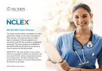 NCLEX-RN® Exam Preview The exam preview allows candidates to review exam items similar to ones they may take on their test day. The exam preview is a static exam composed of clinical judgment and previously used NCLEX questions available for download. The exam preview is available for the NCLEX-RN and NCLEX-PN, as well as a French version for the NCLEX-RN. IMPORTANT: The exam preview is not a scored exam nor a predictor of whether you will pass or fail your actual NCLEX. It does not guarantee success on the actual exam. The items included in this preview will not appear on current or future exams. No answers are provided. ©2022 NCSBN. All rights reserved. Item: 1 The charge nurse has received a change-of-shift report on the following clients in labor. The charge nurse should ask a staff member to first see the client in the 1. first stage of labor who has an oral temperature of 99.7° F (37.6° C) 2. first stage of labor whose contractions are occurring every 30 seconds 3. second stage of labor who has respirations of 26 4. second stage of labor whose contractions are lasting for 60 seconds ©2022 NCSBN. All rights reserved. Page 1/147 Item: 2 The nurse is observing a staff member caring for a client who has chickenpox. Which of the following actions by the staff member would require the nurse to intervene? 1. placing the client in a private room with monitored negative air pressure 2. placing a box of disposable face shields outside the client’s room 3. placing an alcohol-based hand rub in the client’s room for hand hygiene 4. placing a surgical mask on the client during transport out of the client’s room ©2022 NCSBN. All rights reserved. Page 2/147 Item: 3 The nurse is caring for a client who reports feeling faint and is experiencing the cardiac rhythm shown in the electrocardiogram (ECG) strip below. Which of the following actions would be appropriate for the nurse to take? Select all that apply. 1. Administer the client’s prescribed beta blocker. 2. Prepare for transcutaneous pacing. 3. Instruct the client to perform the Valsalva maneuver. 4. Begin chest compressions. 5. Assess the client for angina. ©2022 NCSBN. All rights reserved. Page 3/147 Item: 4 The nurse is planning care for a client with moderate Alzheimer’s disease (AD). Which of the following interventions should the nurse include in the client’s plan of care? 1. Encourage the client to reminisce about happy memories. 2. Confront the client when inappropriate or agitated behaviors occur. 3. Administer to the client the cholinesterase inhibitor to reverse the course of AD. 4. Provide the client with information about activity choices in the morning so the client can make plans for the day. ©2022 NCSBN. All rights reserved. Page 4/147 Item: 5 The nurse is teaching a client how to ambulate using crutches. Which of the following information should the nurse include? 1. “Use your hands and arms to support your body weight.” 2. “Wear slippers when ambulating with the crutches in your home.” 3. “Maintain the crutches 12 in (30 cm) in front of your feet while standing.” 4. “Adjust the hand grips of the crutches so that your elbows are fully extended.” ©2022 NCSBN. All rights reserved. Page 5/147 Item: 6 The nurse has taught a client with multiple sclerosis (MS). Which of the following statements by the client would indicate a correct understanding of the teaching? 1. “I will complete all of my household chores in the morning when I am well rested.” 2. “I have learned how to massage my bladder to help empty my bladder completely.” 3. “I will take a hot bath in the evening to help me relax if I have had a stressful day at work.” 4. “I should expect the blurred vision to resolve after I have received medications for several weeks.” ©2022 NCSBN. All rights reserved. Page 6/147 Case Study Screen 1 of 6 Item: 7 The nurse in the emergency department (ED) is caring for a 41-year-old male client. Click to highlight the findings below that would require follow-up. Nurses’ Notes Emergency Department 1100: Client reports nausea, loss of appetite, vomiting, fever, and constipation for the past 2 weeks and abdominal pain rated 7/10 on the Numerical Rating Scale for 1 week. Client states, “The abdominal pain started after my 7-year-old child accidentally kicked me in the stomach.” Client plays soccer with the child once a week. Vital signs: T 103.4° F (39.7° C), P 92, RR 22, BP 130/86, pulse oximetry reading 98% on room air. No significant past medical or surgical history. Body mass index (BMI) of 32. Drinks alcohol only during social occasions, usually 3 beverages. Smokes cigarettes during social occasions. ©2022 NCSBN. All rights reserved. Page 7/147 Case Study Screen 1 of 6 Item: 7 The nurse in the emergency department (ED) is caring for a 41-year-old male client. Click to highlight the findings below that would require follow-up. Nurses’ Notes Emergency Department 1100: Client reports nausea, loss of appetite, vomiting, fever, and constipation for the past 2 weeks and abdominal pain rated 7/10 on the Numerical Rating Scale for 1 week. Client states, “The abdominal pain started after my 7-year-old child accidentally kicked me in the stomach.” Client plays soccer with the child once a week. Vital signs: T 103.4° F (39.7° C), P 92, RR 22, BP 130/86, pulse oximetry reading 98% on room air. No significant past medical or surgical history. Body mass index (BMI) of 32. Drinks alcohol only during social occasions, usually 3 beverages. Smokes cigarettes during social occasions. ©2022 NCSBN. All rights reserved. Page 8/147 Case Study Screen 2 of 6 The nurse in the emergency department (ED) is caring for a 41-year-old male client. Nurses’ Notes For each assessment finding below, click to specify if the finding is consistent with the disease process of bowel obstruction, appendicitis, or ruptured spleen. Each finding may support more than 1 disease process. Assessment Findings Emerge