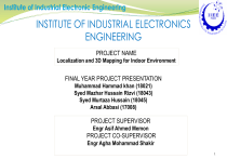 INSTITUTE OF INDUSTRIAL ELECTRONICS ENGINEERING PROJECT NAME Localization and 3D Mapping for Indoor Environment FINAL YEAR PROJECT PRESENTATION Muhammad Hammad khan (18021) Syed Mazhar Hussain Rizvi (18043) Syed Murtaza Hussain (18045) Arsal Abbasi (17008) PROJECT SUPERVISOR Engr Asif Ahmed Memon PROJECT CO-SUPERVISOR Engr Agha Mohammad Shakir 1 Presentation Overview Introduction Problem Statement Possible Solutions Proposed Solution Objectives Literature Review Methodology 1. System Model 2. Detail of the Hardware and Software 3. System Analysis and Specifications Results and Discussion 1. Simulation Results 2. Experimental Results 3. Comparison between Simulation and Experimental Results Conclusion and Recommendations References 2 Introduction The importance of robotics is rapidly increasing as reflected by the number of available robotic systems present in industrial, commercial, educational and research facilities. During the last 50 years, robotics research has been aimed at finding solutions to the technical issues raised in multiple domains of human society. The evolution of sophisticated robotic solutions has been witnessed all around the global communities. Robot in Industry [www.azorobotics.com] Robot in warehouse [www.ehstoday.com] Robot in Healthcare [www.nobel-project.eu/] Robot in Education [www.slashgear.com]3 Introduction The earlier developments of robotic systems have been solely emerged for industrial robotic solutions. A research article “A Brief History of Industrial Robotics in the 20th Century”, published in August 2019 states that the word robot would be assigned to a system that performs physical tasks automatically with some intelligence. The article described three generations of industrial robots till the year 1999 when this field got saturated. The First Generation of Industrial Robots (1950-1967). The Second Generation of Industrial Robots (1968-1977). The Third Generation of Industrial Robots (1978-1999). 4 Introduction to Surveying and Mapping Robots Exploring unknown environment and to build its 3D representation is one of the most focused multi-disciplinary research field which has been evolved through the usage of Simultaneous Localization and Mapping (SLAM) technique. Surveying and mapping the environment is one of the recent topic for the robotic researchers and started to evolve since last decade. There are different varieties of mapping robots available which can do the surveying job in indoor and outdoor environments. An indoor surveying robot may be developed by using a laser scanner and odometry setup supported by a single board computer. But on the other hand, an outdoor surveying robot becomes a complex setup of sensors supported by a high-speed computer. 5 Surveying and Mapping Robots 6 Problem Statement In recent years researchers developed several solutions for simultaneous localization and mapping (SLAM), however, 3D real-time map development and scanning of a large area is still a big challenge and requires autonomy of the system by involving multiple robotic units. Increasing the number of robotic units for large area mapping creates several challenges, like the power consumption, data transfer and the determination of the exact lidars transformation and exact joint together them for real-time 3D mapping. Therefore over all system exceeds the acceptable cost with high power consumption solution for 3D surveying and real-time mapping. 7 POSSIBLE SOLUTIONS We can 3d laser scanners like velodyne .Velodyne is approx 2,200$. We can also use SICK-TIM510 but the issue is they are very high cost. SICK-TIM510 is approx. 1,800$. The other one solution is the usage of 2D RP-Lidar A1 for low cost 3D mapping. 8 POSSIBLE SOLUTIONS 9 POSSIBLE SOLUTIONS The one another solution is to make the servo motor stand which rotates the 2D lidar on x-y and z axis through this we can capture 3D map of the whole environment. 10 PROPOSED SOLUTION Our proposed solution is meant to design a “SLAM BASED 3D MAP BUILDING USING 2 LOW COST 2D LASER SCANNERS (RPLIDAR A1)”and perform motion in real-time from the initial position to the final destination (surveyed region). Main theme of “SLAM BASED 3D MAP BUILDING USING 2 LOW COST 2D LASER SCANNERS (RPLIDAR A1)” is an orthogonal combination of two RP-Lidar 2D laser scanners which we will used on slam’s vehicle to build real-time 3D point cloud map of the explored region. The interfacing of scanners, transformation joints, zero degree transformation and the processing of simultaneous localization and mapping (SLAM) technique will achieve using Robot Operating System (ROS). 11 PROPOSED SOLUTION The developed 3D point cloud map will further utilize to establish Building Information Model (BIM) to found validity for the surveyed region. Simulated model Real model 12 Objectives The main objective is to make the real-time 3D Map development of the corridor using ROS. The existing solution are costly and not economically feasible to the local market of the country. Therefore, the main motivation of our project is to develop an economical autonomous mapping solution acceptable to the local market. 13 Objectives To accomplish the desired project goals the overall work has been divided into multiple objectives as follows: Fabrication of small mapping rover. Characterizing and selection of 2D scanners. Simulated and Real robot transformation Lidar’s joints, plugin and it’s transformations on real-time bases. Real-Time Map development of the environment by rover. 14 A Rover Team Based 3D Map Building Using Low Cost 2D Laser Scanners This paper presents a solution to develop 3D map of indoor place using a team of rovers equipped with low cost 2D laser scanners. They used uwb 1000 for sensing 2nd rover another thing they used identity marks on both rover and read them of 1st rover to 2nd and 2nd rover to 1st . Both rovers make the map and stop at meeting point by reading identity mark. Researchers get the lidars data of b