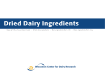 Dried Dairy Ingredients Types of milk, whey and permeate Dried dairy ingredients Dairy ingredients from milk Dairy ingredients from whey Wisconsin Center for Dairy Research Table of Contents Dried Dairy Ingredients Introduction ...................................................................... 2 Types of milk, whey and permeate ........................... 3 Dried dairy ingredients .................................................. 4 Manufacturing dairy ingredients from milk ............ 5 Milk powder ............................................................... 6 Casein . ....................................................................... 13 Caseinate . ................................................................. 16 Co-precipitate .......................................................... 18 Milk protein concentrate ...................................... 20 Milk permeate ......................................................... 22 Microfiltered milk . .................................................. 23 Native whey protein .............................................. 25 Manufacturing dairy ingredients from whey ........ 27 Karen Smith, Ph.D. Dairy Processing Technologist Wisconsin Center for Dairy Research Whey ........................................................................... 28 Demineralized or reduced minerals whey ..... 34 Reduced lactose whey ..........................................36 Lactose hydrolyzed whey .....................................38 Protein hydrolyzed whey ......................................39 Lactalbumin ..............................................................40 Whey protein concentrate ...................................42 Whey protein isolate ..............................................44 Individual whey proteins ......................................46 Permeate (whey) ....................................................48 Lactose .......................................................................50 Dairy minerals ..........................................................55 Websites ...........................................................................58 Abbreviations and Symbols .......................................58 Summary graphs ...........................................................59 This document, prepared by the Wisconsin Center for Dairy Research and funded by Wisconsin Milk Marketing Board and Dairy Management, Inc., is intended to help clarify how milk and whey are converted into dried dairy ingredients. The document includes commonly used dairy terms, manufacturing and processing technology, and applicable technical information. When citing this information as a reference, please credit the Wisconsin Center for Dairy Research, the document name and date of the publication. May 15, 2008 t Dried Dairy Ingredients t Dried Dairy Ingredients t Dried Dairy Ingredients t Dried Dairy Ingredients t Page 1 Introduction Standards and specifications also may vary between government agencies and trade groups. It is important to check for regulations governing your particular product as well as for any changes in regulations/standards. The Dried Dairy Ingredient Handbook is designed to be an easy to use, quick source of information on the wide range of ingredients that can be made from milk and whey. The Handbook is intended only as a guide to dairy ingredients. Product manufacturing methods, composition and specifications will vary between producers. The guide describes what is typical for products. I would like to thank the people in industry and at CDR that contributed to and reviewed the document. Their assistance was invaluable. I would like to give special thanks Tim Hogensen for all of his time and patience in producing this handbook. Some ingredients can be made from either milk or whey but they have been included in the section under the starting material most typically used. Information on products is given in several different formats reflecting the varied ways information on dry dairy products is conveyed. Graphs of product composition are on a total solids basis thereby allowing a quick comparison of components. Tables of product composition include moisture thereby reflecting what a customer would typically see for a bag of dry product. The table of typical composition and characteristics gives composition information in a format similar to the product composition table but protein is given on a dry basis. Regulations for US dairy products often are distributed throughout several agencies. It may be necessary to consult several sources to obtain complete information on regulations and standards for a given product. t Dried Dairy Ingredients t Dried Dairy Ingredients t Dried Dairy Ingredients t Dried Dairy Ingredients t Page 2 Types of Milk, Whey and Permeate Milk, whey and permeate composition Milk 100 Percentage of total solids (%) TT Whole TT Skim TT Buttermilk (from butter manufacture) Whey Resulting from TT Cheese manufacture w Sweet w Acid w Salty TT Casein production w Sweet w Acid 80 Fat 60 Ash Lactose 40 Protein 20 0 Milk Whey Permeate Permeate Resulting from TT Milk TT Cheese manufacture w Sweet whey w Acid whey TT Casein manufacture w Sweet whey w Acid whey General composition of milk, whey and permeate Milk Component Dried Dairy Ingredients t Dried Dairy Ingredients t Whey permeate ------------------ % ------------------ Total solids t Sweet whey 12.5 6.5 5.5 Protein 3.5 0.8 < 0.1 Lactose 4.8 4.9 4.9 Ash 0.7 0.5 0.5 Fat 3.5 0.3 0.0 Dried Dairy Ingredients t Dried Dairy Ingredients t Page 3 Dried Dairy Ingredients Milk based Whey based TT Milk powder TT Whey w Nonfat dry milk (NFDM, NDM) n Low heat n Medium heat n High heat w Whole milk w Buttermilk TT Casein w Acid w Rennet TT Caseinate w Potassium w Calcium w Sodium TT Co-precipitate w Acid w Medium calcium w High calcium TT Milk protein concentrate (MPC) w 42 to 85 TT Milk protein isolate (MPI) TT Permeate (milk) TT Micellar casein TT 