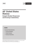 2022 AP United States History ® Sample Student Responses and Scoring Commentary Inside: Document-Based Question R Scoring Guidelines R Student Samples R Scoring Commentary © 2022 College Board. College Board, Advanced Placement, AP, AP Central, and the acorn logo are registered trademarks of College Board. Visit College Board on the web: collegeboard.org. AP Central is the official online home for the AP Program: apcentral.collegeboard.org. AP® United States History 2022 Scoring Guidelines Question 1: Document-Based Question, Early American Identity 7 points General Scoring Notes • Except where otherwise noted, each point of these rubrics is earned independently; for example, a student could earn a point for evidence without earning a point for thesis/claim. • Accuracy: The components of these rubrics require that students demonstrate historically defensible content knowledge. Given the timed nature of the exam, essays may contain errors that do not detract from their overall quality, as long as the historical content used to advance the argument is accurate. • Clarity: Exam essays should be considered first drafts and thus may contain grammatical errors. Those errors will not be counted against a student unless they obscure the successful demonstration of the content knowledge, skills, and practices described below. Evaluate the extent to which the United States developed a national identity between 1800 and 1855. © 2022 College Board AP® United States History 2022 Scoring Guidelines Reporting Category Row A Thesis/Claim Scoring Criteria 0 points Does not meet the criteria for one point. (0-1 points) 1 point Responds to the prompt with a historically defensible thesis/claim that establishes a line of reasoning. Decision Rules and Scoring Notes Responses that do not earn this point: • Are not historically defensible. • Only restate or rephrase the prompt. • Do not respond to the prompt. • Do not establish a line of reasoning. • Are overgeneralized. Responses that earn this point: • Provide a historically defensible thesis or claim about how the United States developed a national identity between 1800 and 1855. The thesis or claim must either provide some indication of the reason for making that claim OR by establishing categories of the argument. Examples that do not earn this point: Examples that earn this point: Do not focus on the topic of the prompt • “The United States got a nation because George Washington beat the British during American Revolution.” Establish a line of reasoning that evaluates the topic of the prompt with analytic categories • “During the first half of the 19th century, Americans were able to develop a unified national identity to a large extent. Specifically, by drawing distinctions against the British after the War of 1812 and identifying uniquely American national values, the U.S. started to move away from seeing itself primarily as a collection of states.” Provide a historically defensible claim, but do not establish a line of reasoning • “Americans began to think of themselves as one nation after 1800.” Provide a restatement of the prompt • “The United States developed a national identity between 1800 and 1855.” Establish a line of reasoning with analytic categories • “The U.S. was developing a unified national identity by embracing the ideals of the founding documents, individuality, and voting rights.” Establish a line of reasoning • “After 1800, the United States developed a national identity by continuing to break away from British identity.” (Minimally acceptable thesis/claim) Additional Notes: • The thesis or claim must consist of one or more sentences located in one place, either in the introduction or the conclusion (which may not be limited to the first or last paragraphs). • The thesis or claim must identify a relevant development(s) in the period, although it is not required to encompass the entire period. © 2022 College Board AP® United States History 2022 Scoring Guidelines Reporting Category Row B Contextualization Scoring Criteria 0 points Does not meet the criteria for one point. (0-1 points) 1 point Describes a broader historical context relevant to the prompt. Decision Rules and Scoring Notes Responses that do not earn this point: • Provide an overgeneralized statement about the time period referenced in the prompt. • Provide context that is not relevant to the prompt. • Provide a passing phrase or reference. Responses that earn this point: • Accurately describe a context relevant to how the United States developed a national identity between 1800 and 1855. Examples that do not earn this point: Examples of relevant context that earn this point include the following if appropriate elaboration is provided: • Anglicization during the colonial era • American Revolution • Declaration of Independence • Ratification of the United States Constitution • Second Great Awakening • Jacksonianism • Native American dispossession • Growth of slavery • First and Second Party Systems • Market revolution • Domestic ideals/separate spheres • Immigration from Ireland and central Europe • Reform and utopian movements • Kansas-Nebraska Act • Civil War Provide a passing phrase or reference • “Americans had Transcendentalism.” Provide historically inaccurate contextualization • “Fighting the Nazis made people feel really proud to be American.” Examples of acceptable contextualization: • “During the late 1790s and early 1800s, conflicts over neutral trading rights and impressment with France and Great Britain, contributed to debates about U.S. foreign policy leading to questions about the young country’s place in the world.” Additional Notes: • The response must relate the topic of the prompt to broader historical events, developments, or processes that occur before, during, or continue after the time frame of the question. • To earn this po