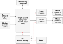 Monitoring Computer Driver (TB6600) Camera (Logitech c270) Motion (LDS-01 LiDAR) Single-Board Computer Driver (TB6600) (NVIDIA Jetson Nano) 5V DC Power Supply 12V 12V 5V Laser Motor (Nema 17 Stepper) Motor (Nema 17 Stepper)