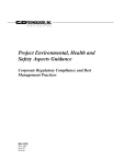 Project Environmental, Health and Safety Aspects Guidance Corporate Regulatory Compliance and Best Management Practices RS-1279 03/02 EHS 04/01/03 06/30/03 Index of Project Environmental, Health and Safety Guidance Index Page 1 Regulatory Compliance Guidance 3 2 Process Design and Controls 4 3 Employee Safety, Equipment Layout 5 4 Air Emissions 6 5 Product & Packaging Design 7 6 Water Conservation and Wastewater Management 8 7 Piping Systems and Storage Tank 9 8 Hazardous Waste / Demolition / Chemical Usage 10 9 Contractor Safety and Insurance Requirements 11 10 Handling Contaminated Equipment 11 11 New Construction 11 12 New and Custom Production Equipment 12 13 Purchase and Divestiture of Real Estate 12 14 Ventilation Design & Fabrication Specifications 13 2 In support of the C&D Technologies, Inc. corporate Environmental, Health and Safety Policy this document is provided to offer guidance to the organization on proper practice in the conduct of projects associated with the design and manufacturing of products. 1.0 Regulatory Compliance Guidance C&D manufacturing facilities are subject to permitting requirements for process water treatment and discharge, stormwater discharge, non-contact cooling water discharge, hazardous, medical and special waste storage and disposal, fugitive and process stack air emissions, and tank /bulk storage. Failure to obtain the proper permits or approvals before commencing a project which could impact any of these aspects of our operations can subject C&D to regulatory penalties, fines and the potential for operational sanctions or criminal prosecution. When planning a new or modified process or operation, demolition or expansion, adequate time must be allowed for obtaining the necessary approvals or permits. Air and wastewater permit approvals can require 60 to 90 days. The E, H&S Administrator and Plant Manager of the affected facility should be involved as early as possible in the project planning so that appropriate action can be taken to avoid delay of the project. No new process or emission control equipment may be delivered or installed at a C&D facility without the approval of the facility or corporate E, H&S department. Changes in raw materials, processes, production rates, or emission rates may require modifications to an existing permit or registration, including the delisting of a permitted source if a piece of machinery or a production line is removed. Regulatory requirements vary considerably from location to location. The following is a partial list of equipment and activities that may require a permit or other form of regulatory approval. When in doubt, ask. Process equipment (chemical and mechanical) that emits particulates, toxic substances like lead, or any kind of vapor or gas. Increases in production levels or increases in hours of operation. Storage tanks (above ground, on-ground, and underground) holding chemicals, water or waste. 3 1.0 Regulatory Compliance (Cont.) Air pollution control devices (baghouses, scrubbers). Fuel-burning equipment. Degreasing and other cleaning operations that employ solvents. Demolition or excavation that can cause airborne dust, stormwater run-off (even just of soil), disturbance of soil or materials that could contain contaminants, asbestos, etc. Process equipment that will create wastewater or non-contact cooling water. 2.0 Process Design and Controls New manufacturing process design should take into consideration potential environmental, health and safety impacts. During design, the process should be broken down into its components and each examined for possible elimination of steps as well as the opportunity to increase yields and thereby reduce or eliminate wasteful by-products. New equipment and process design should seek to eliminate or reduce worker chemical and physical exposures (i.e., repetitive motion, noise, and lead). Projected releases to the air, water and solid waste streams should be carefully analyzed during the design phase for opportunities for elimination or reduction using source reduction, recycle/reuse and as a final approach, "state-of-the-art" treatment technology. Only in the unusual event that no other options are available should toxic and hazardous materials be considered for incineration and landfill. Superimposed on this analysis should be the search for alternative processes which are more "environmentally friendly" and which use less resources and energy. Key factors to consider are: Elimination of Process Steps - Assessment of manufacturing processes can reveal individual steps or groups of steps, which can be eliminated. This frequently can produce savings in materials, labor, energy, and equipment, as well as reduced environmental impact. Material substitution and introduction of new technologies often provide opportunities for elimination of process steps. Waste Elimination/Reduction - Opportunities for eliminating or reducing wastes are often revealed in assessments of processes. Increase Yields - Lower material, energy usage, and environmental impact per unit output can be demonstrated when process yields or efficiency are increased. 4 2.0 Process Controls (Cont.) Emission Elimination/Reduction & Effluent Elimination/Reduction - These types of projects are particularly desirable because of the impact emissions and effluents can have on the environment and public. Detoxification of Discharges - Minimizing the hazard presented by releases is an important consideration when eliminating/reducing the quantity is not possible. Alternative Processes - Seek to achieve neutral impact through alternative technologies and processes. Energy Reduction - These types of reductions can have significant decreased environmental impact not only at the site but also in the public arena of power generation. Energy efficiency should always be a goal in design. Raw Materials - In those cases where substitution for a hazardous material is not possible, these materials should be totally c